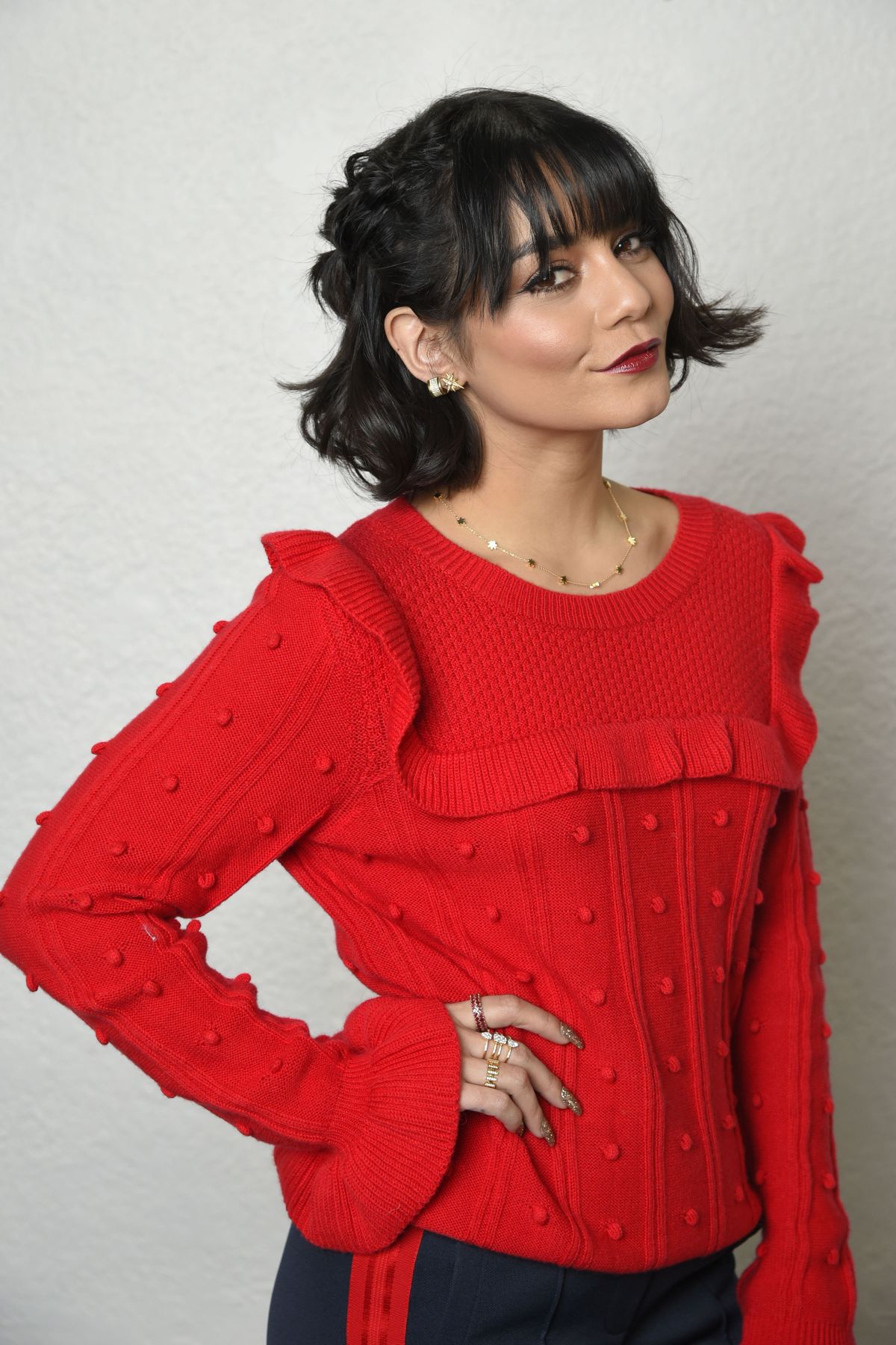 Vanessa Hudgens wore the kate spade new york ‘Ruffle Yoke Sweater’ in charm red while attending a Joico press event on December 18th in Los Angeles.