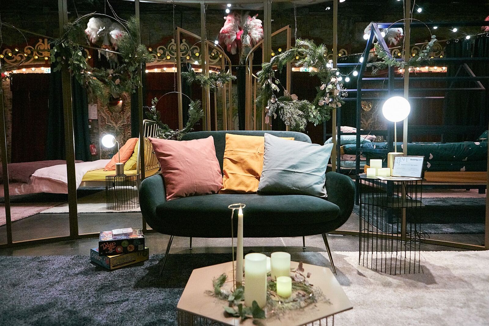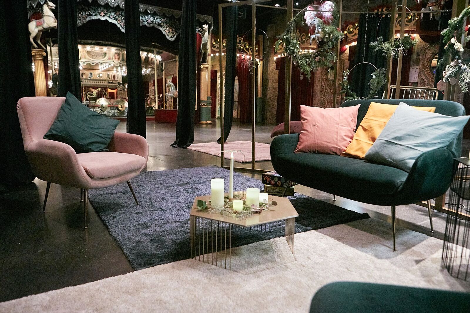 Côté salon, les tissus de velours douillets se mêlent avec brio aux éléments graphiques des tables basse et d’appoint, créant une ambiance à la fois contemporaine et confortable. Les coloris vert bouteille et rose poudré des assises, dont les pieds dorés font écho à la structure circulaire de l’ensemble, offrent à cette pièce une esthétique luxueuse et élégante. Les grands rideaux accrochés à la structure, que la famille a pu ouvrir et fermer à sa guise, ont permis à cette dernière de profiter au maximum des lieux : depuis le salon, les gagnants ont en effet pu admirer le sublime vélocipède du Musée des Arts Forains, authentique manège du 19e siècle.