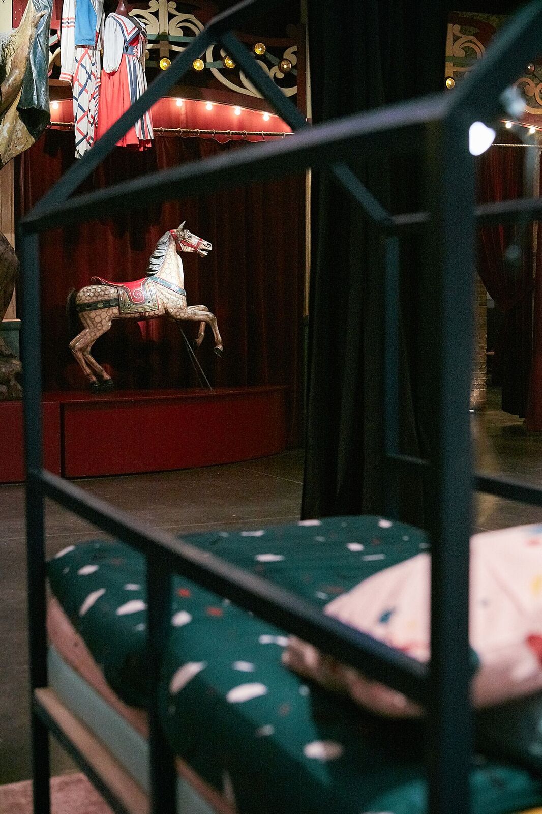 Composée de deux chambres et d’un spacieux coin salon, cette suite a été conçue par Claire Gendron, architecte d’intérieur. Sa structure circulaire – non sans rappeler la forme des célèbres carrousels du Musée – est fabriquée en laiton doré et brossé. Elle met savamment en valeur une décoration raffinée, digne d’un bel hôtel parisien. Au plafond, des guirlandes lumineuses tirées à la façon d’un chapiteau confèrent à cet espace une atmosphère circassienne et féérique permettant à toute la famille de s’imaginer passer une nuit à la belle étoile.