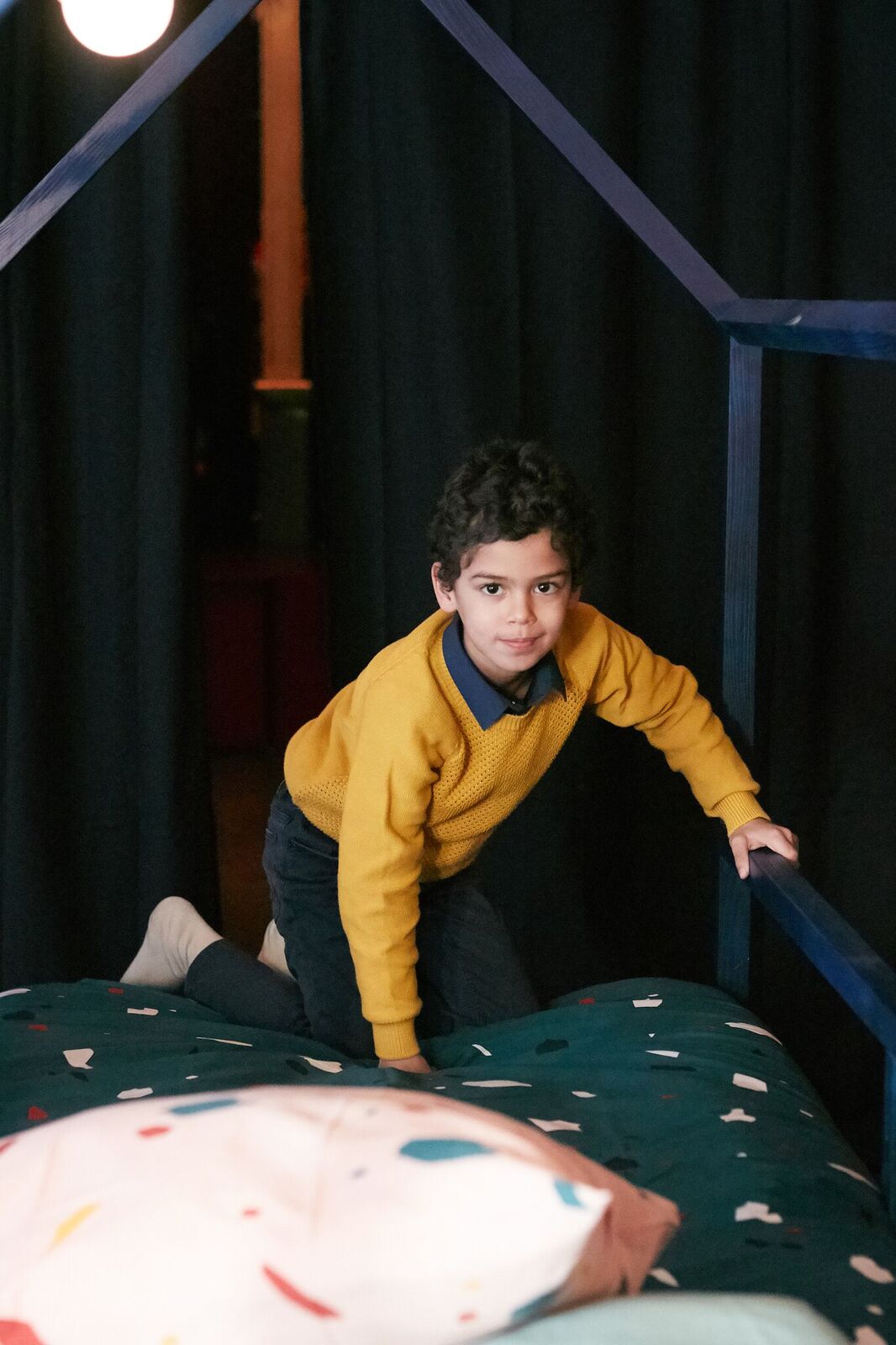 Les enfants ont, quant à eux, pu passer la nuit dans des lits-cabanes conçus en bois peint couleur bleu saphir, auxquels la superposition de nombreux matelas conférait un aspect ludique, joliment accentué par le linge de lit aux coloris vitaminés.