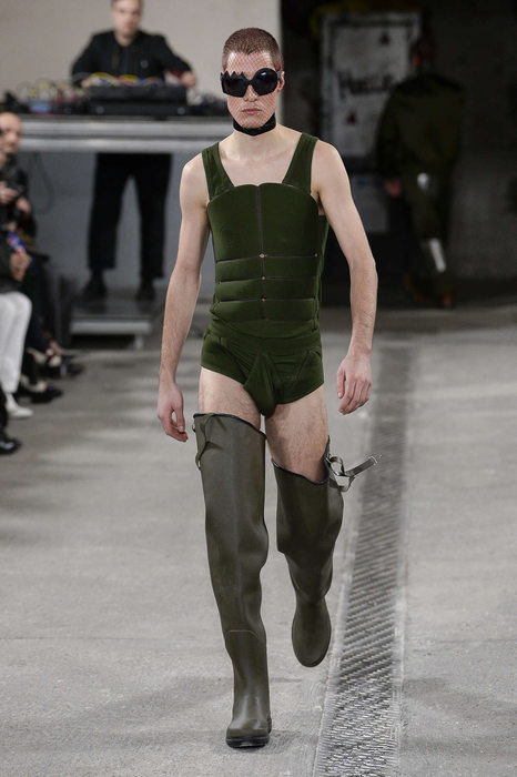Vidéos boomerangs : les images vont et viennent, entrecoupées de « j’aime » : mais sont -elle regardées? Mémorisées? Le défilé de Walter Van Beiredonck joue avec la mémoire visuelle du spectateur. C’est aussi une critique des nouvelles uses et coutumes des invités aux défilés : portable en main, prêt à dégainer avant que le mannequin ne retourne avec les vêtements, dans les coulisses-pour l’éternité. Si le style SM  (latex, cuissardes, manteaux ouverts sur les tétons) est sans-doute la chose qui fait parler (et qui semble être une tendance, Cf : Jérémy Scott), c’est la lueur bienveillante de Walter van Bereidonck qu’il faut souligner : en faisant passer plusieurs fois de manière aléatoire ces jeunes SM aux regards absents, il offre plus d’occasions à ses invités de croiser le regard de ces déviants undergrounds, et de les enregistrer dans leurs filtres d’actualité. Au-delà du jeu : les coupes des impairs, relèvent d’une rigueurs dont il fallait bien quelques reboots et rembobinages pour apprécier toute la technicité.