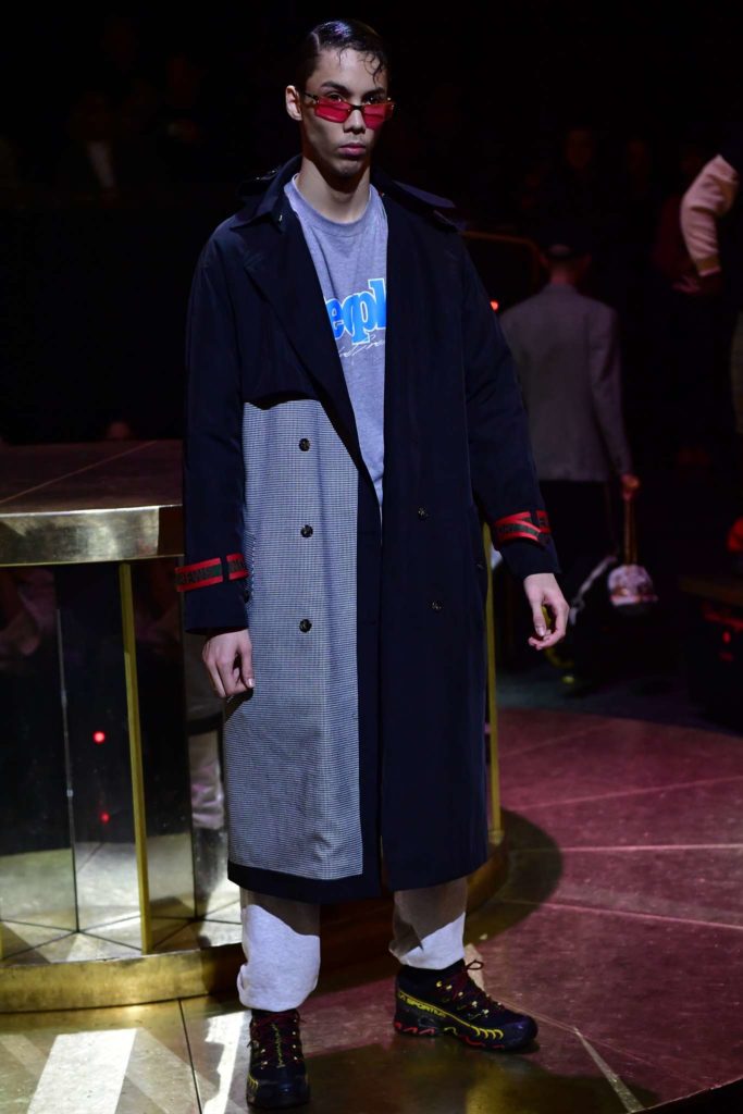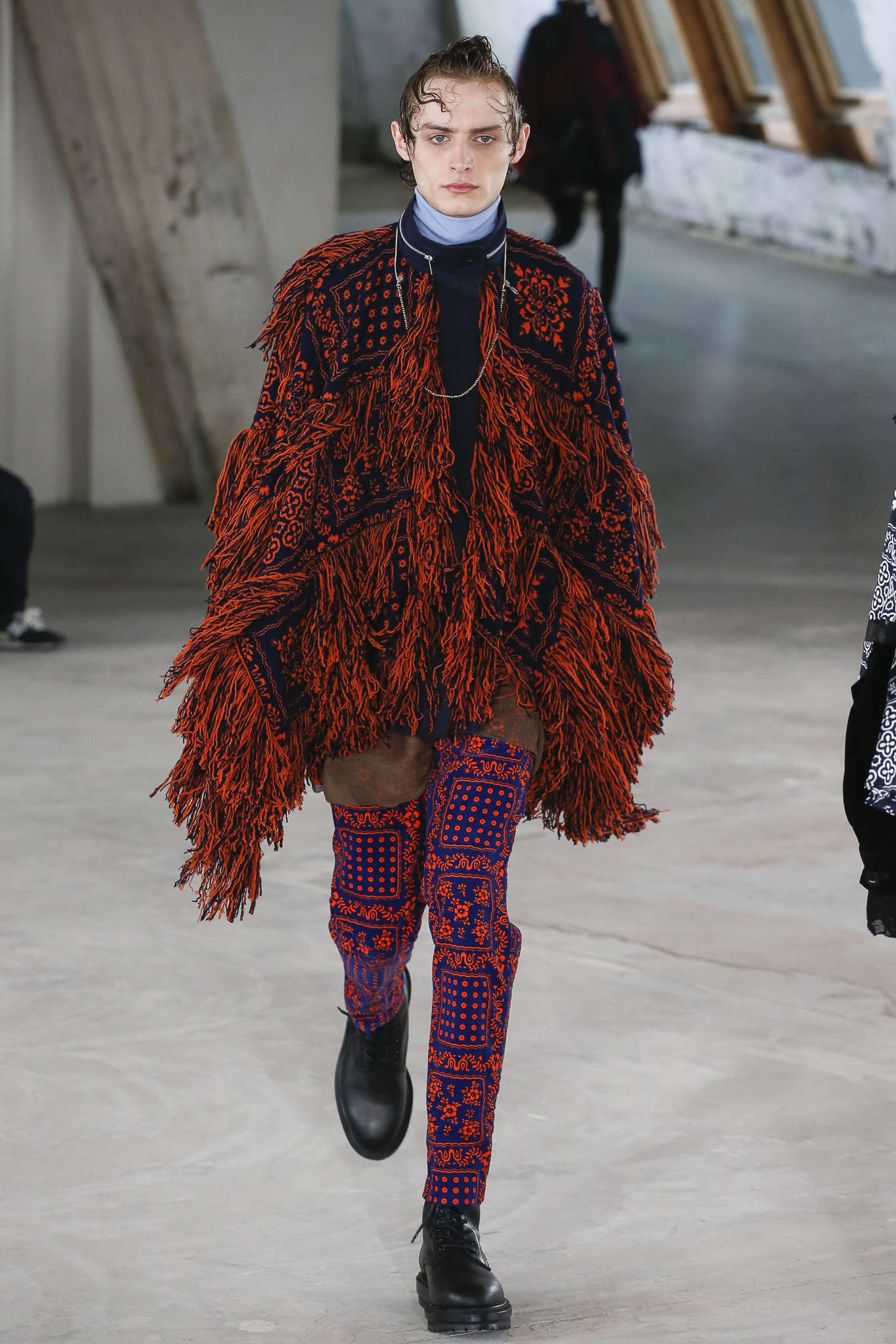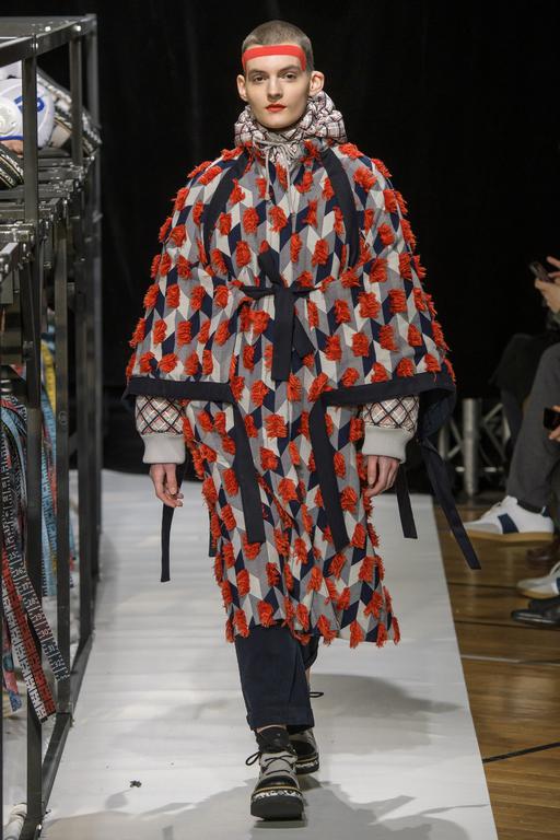 Pause : qu’est-ce que le tailoring 2018 ? Le costume trois pièces n’est plus réservé aux élites, ou aux classes de loisirs privilégiées. Depuis longtemps la rue se l’est approprié. Depuis très longtemps : comme en Nouvelle Orléans ou le chic de la population le dimanche n’a d’équivalent nulle part ailleurs. Les gens se rassemblent, dansent : quelque chose d’unique naît de la souffrance. Alors il parait tout logique que la mode nous invite à la fête, comme chez Andrea Crews qui dépoussière l’image d’une mode sage et inaccessible. Après les ouragans,s’habiller est un remède. C’est peut être ce que vient nous dire Thom Browne. C’est peut-être aussi de ces ouragans que les collections pleines de ponchos colorés, de froufrous de mailles et d’imprimés ont pu naître. Sacai, White Mountaineering, Henrik Vibskov : le prolongement du multiculturalisme ambiant ou des imprimés et matières improbables s’hybrident.