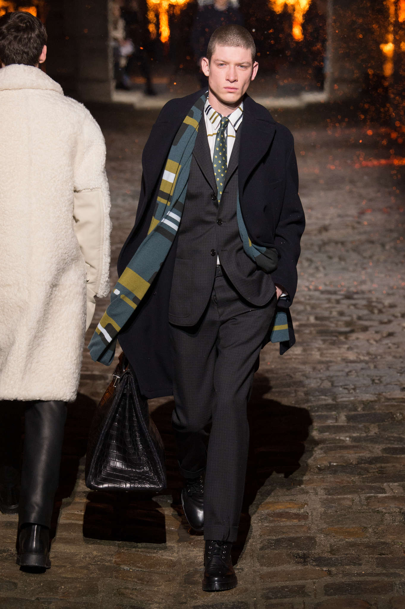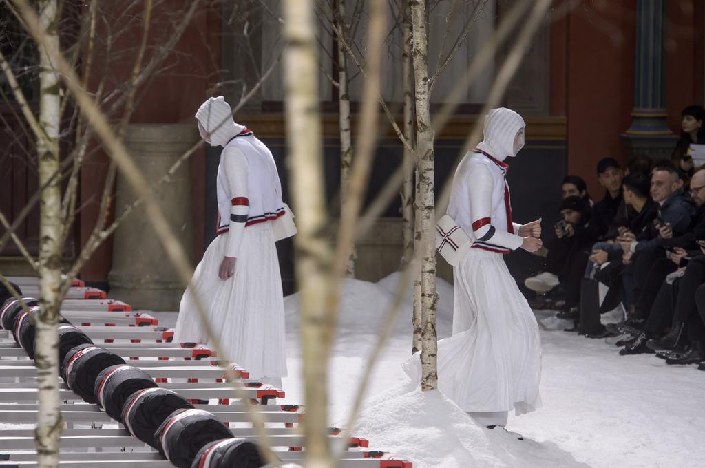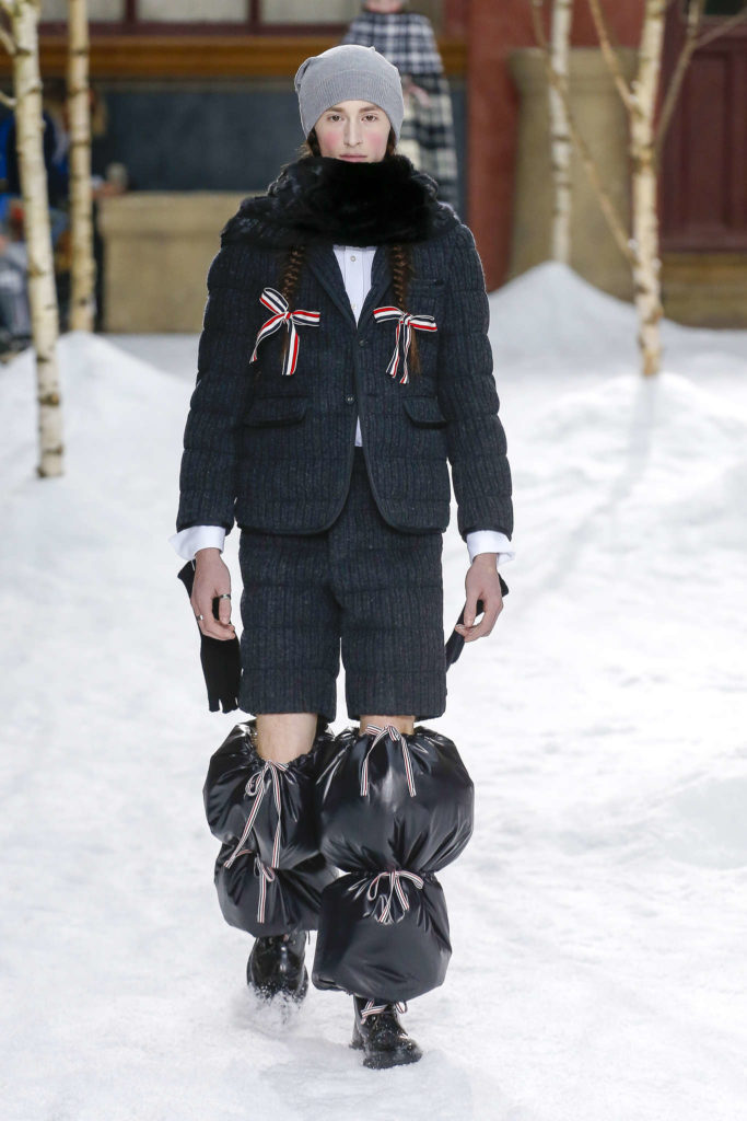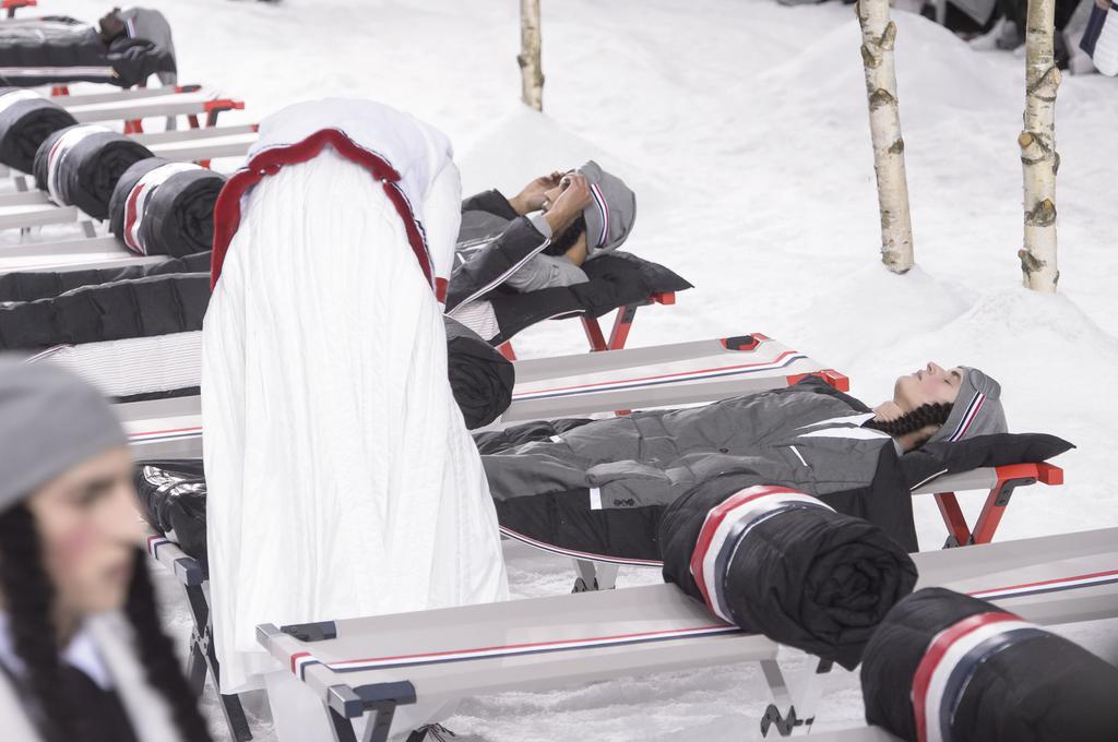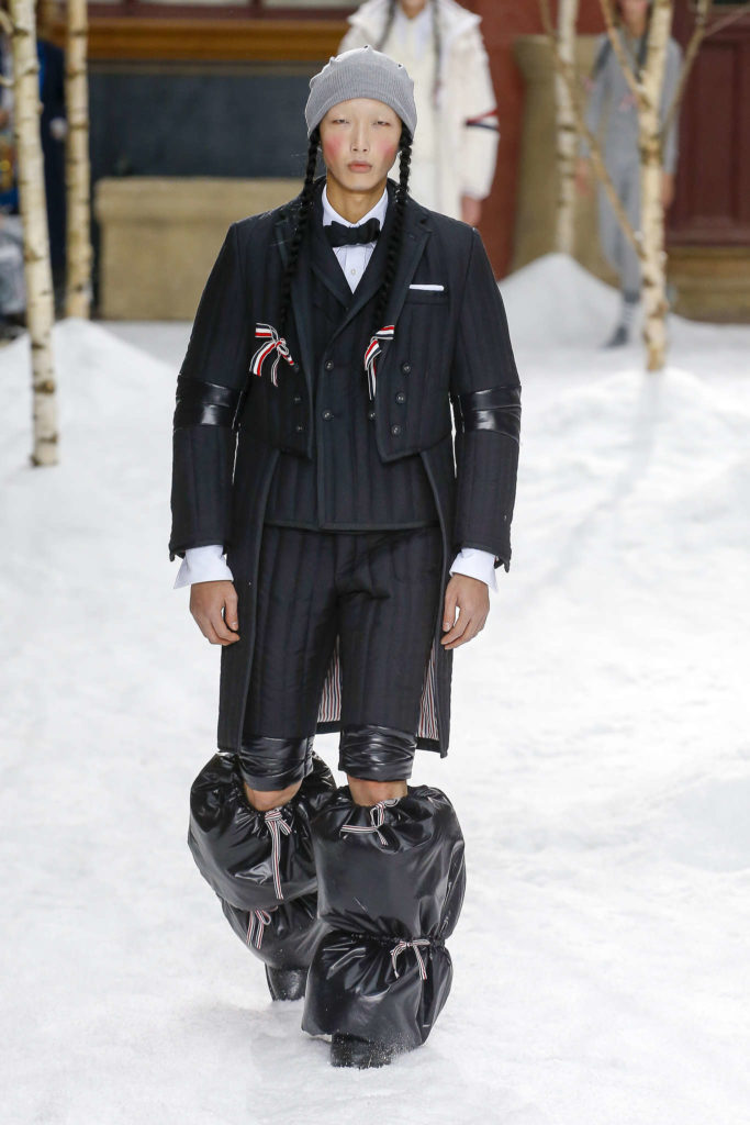 Les défilés de Thom Browne doivent se vivre. Ils sont riches, épatant et complexes : au point ou une unique lecture serait une offense à leur puissance. Pour cette saison, un léger embarras naît face à ses nurses en blancs qui réaniment des voyageurs échoués en costumes carrés. Tous sont impeccablement coupés : ils sont aussi chic que Monsieur Klein qui court après le destin d’un autre. Une course qui le mène à monter dans un ultime train. Thom Browne nous fais vivre la descente de ce train.Les hommes ont mutés, comme dans les films de science-fiction. Pour survivre ils adoptent les vêtements symboles du nouveau monde capitaliste.