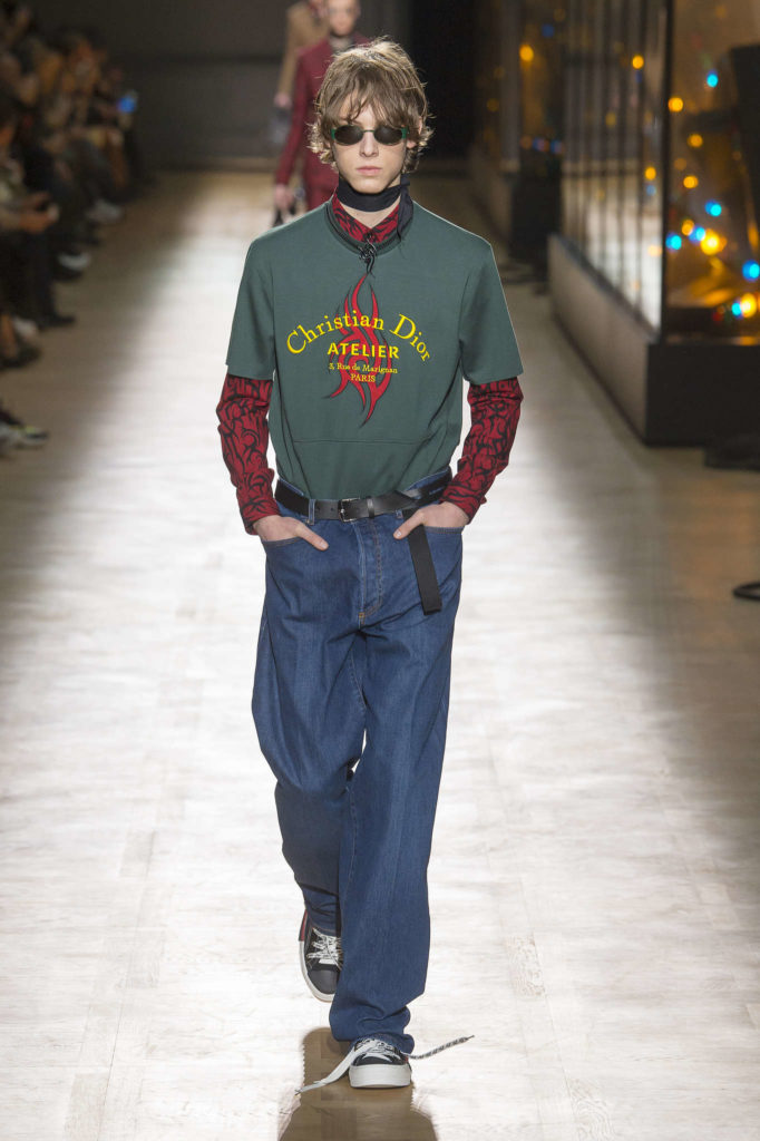 Kris Van Assèche semble souffrir de cette bipolarité-ou mal fourre-tout du siècle. Derrière les costards trop bien taillés, il y a ce mec qui vous attend à la sorite du lycée. Celui au jean trop large qui trempe dans les flaques d’eau, et qui porte un genre de Converse. Sur son t-shirt : un tribal, parce que c’est le modèle qu’il a choisi de ce faire tatouer sur le mollet dès qu’il aura assez économisé. Comme tout ces types il porte une sacoche qui comporte son « nécessaire ». Un story-telling pas très Dior et pourtant une fois lâché sur le podium, la mode n’appartient plus à personne. Roule-moi en une avant de remettre mon costume : pas très au goût de Karl Lagerfeld -« J’ai adoré le tailleur, mais pas vraiment la garde-robe sportive ».