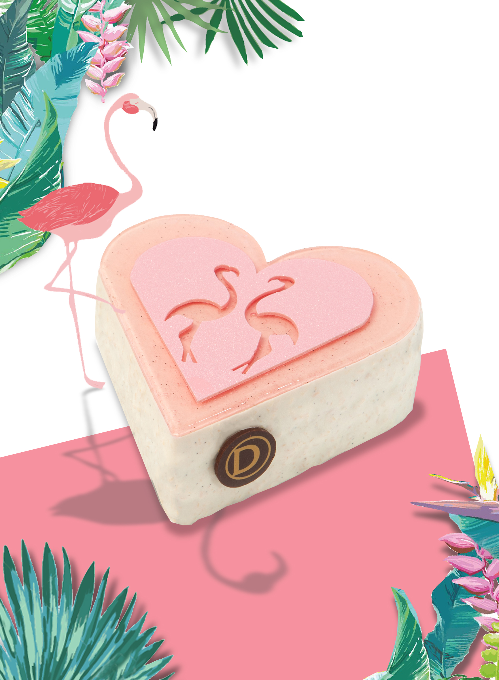 Entremets, tarte et confiserie à partager à deux : on a le cœur qui bat la chamade pour ces douceurs habillées de flamants roses amoureux.