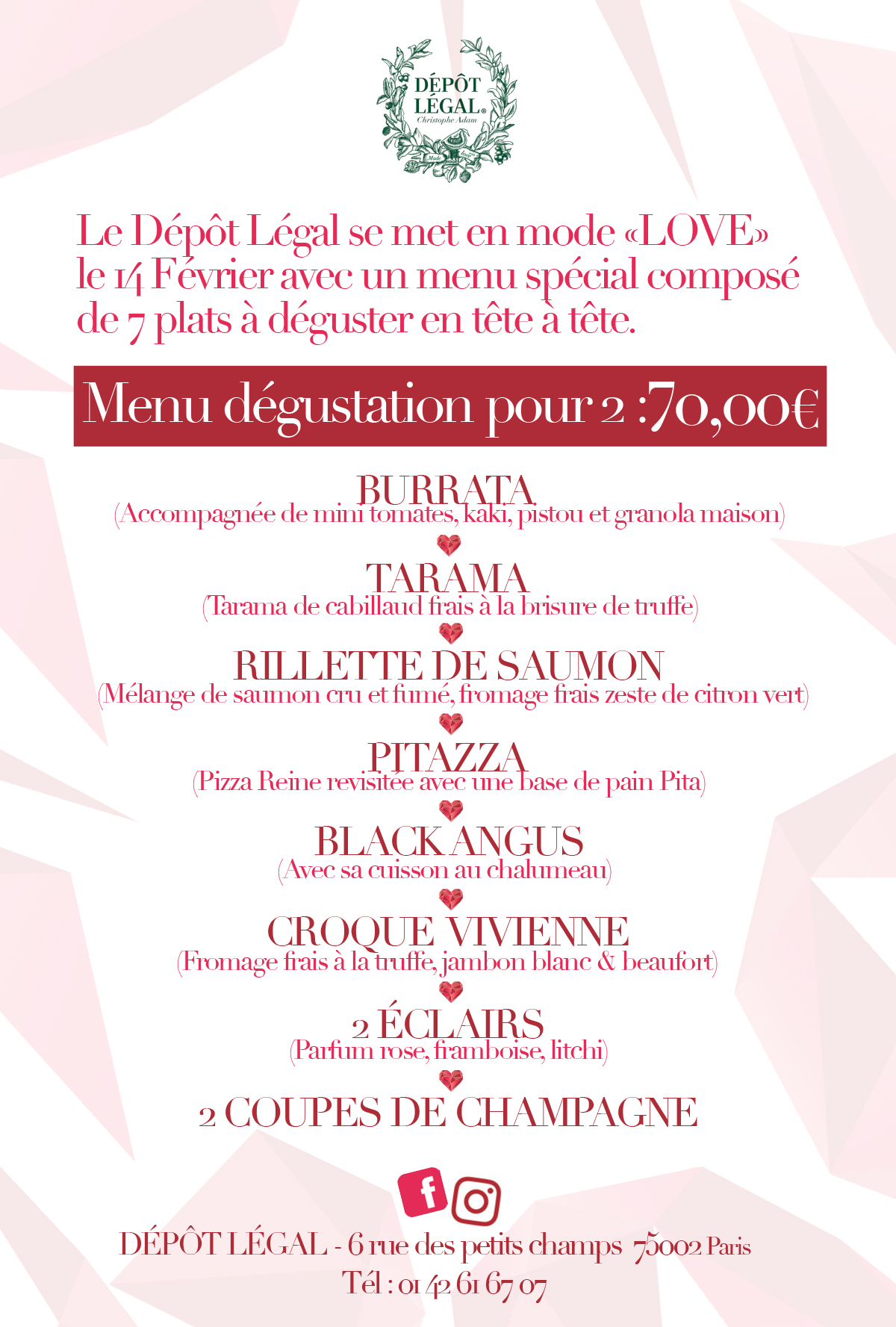 Cette année pour la Saint Valentin, Le Dépôt Légal, vous propose de célébrer Cupidon autour d’un dîner romantique by le créateur gastronomique Christophe Adam au cœur de Paris dans le 2ème arrondissement !