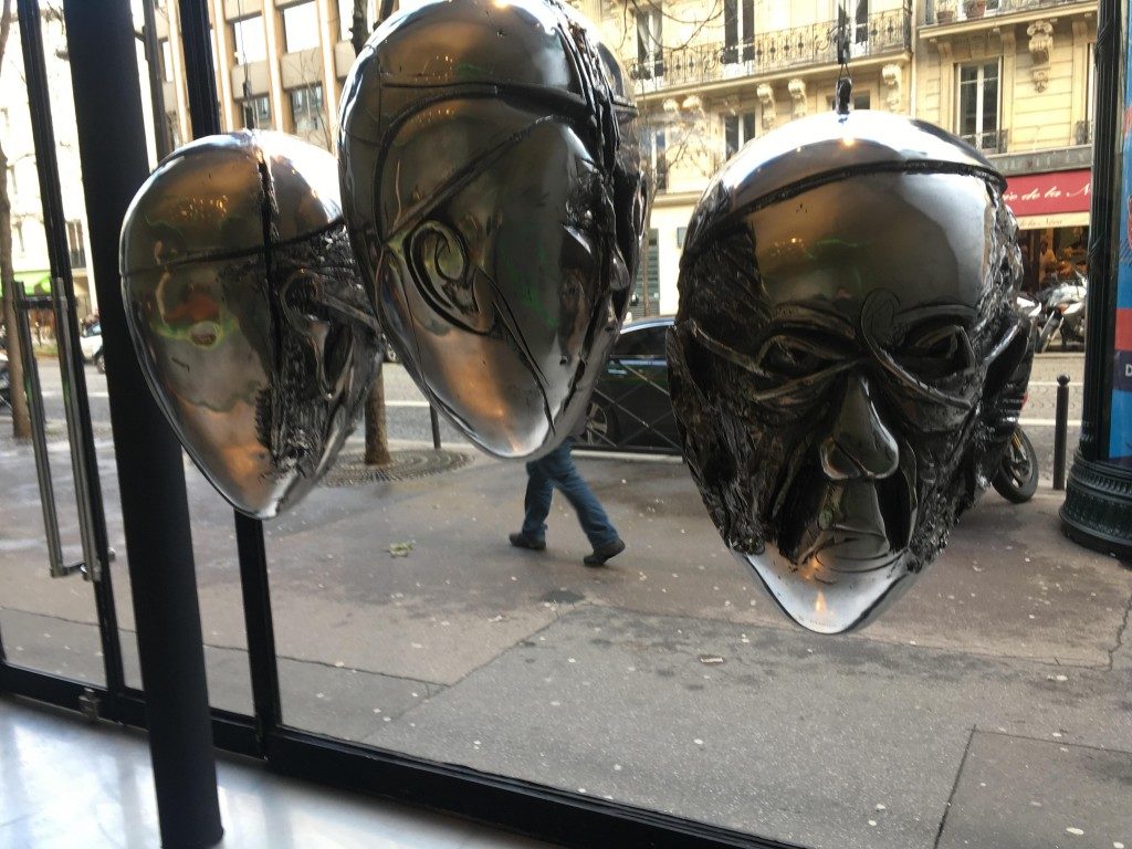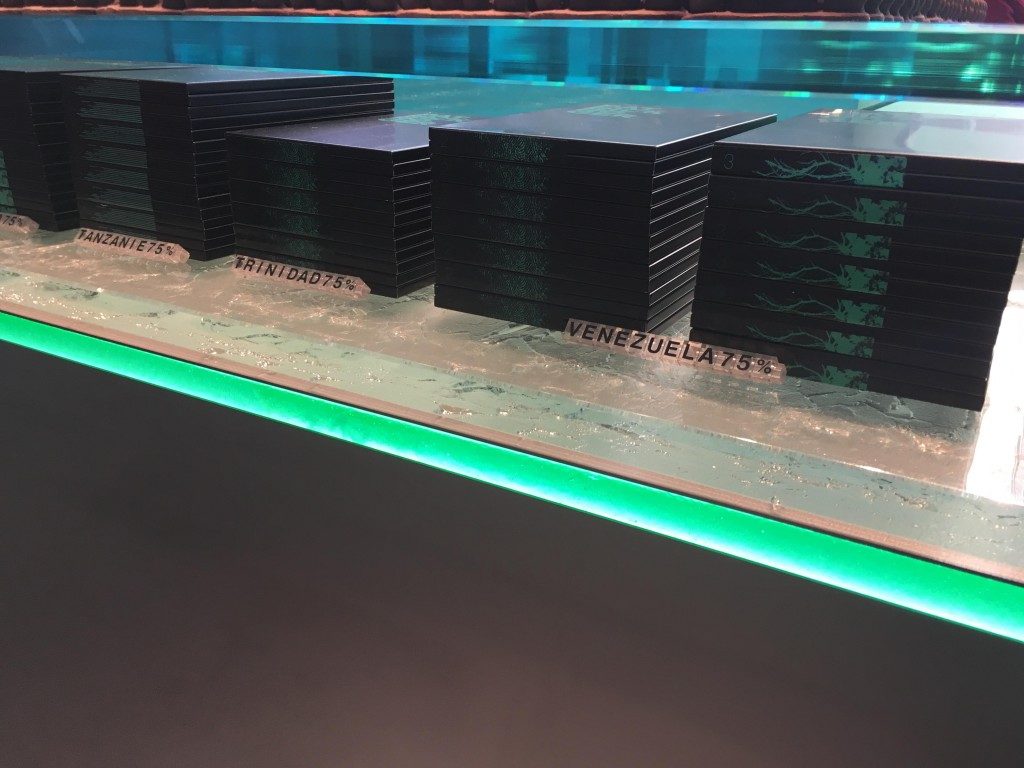Derrière une vitrine, qui telle une peau de verre laisse toute transparence, l’intérieur offre la simplicité d’un cube aux parois de métal brossé lacérées d’une écriture linéaire de lumière verte qui n’est pas sans rappeler les récentes sculptures du chocolatier.