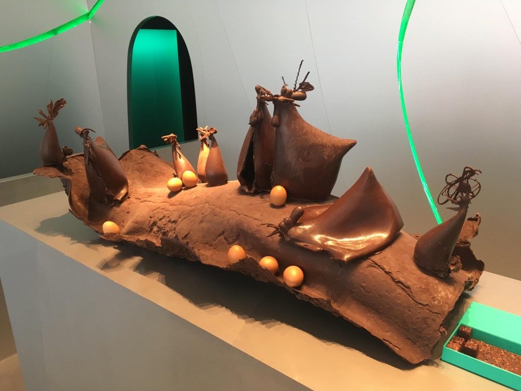 Il suffit de pénétrer les lieux pour observer les détails et le découpage de l’objet dans son entièreté. Les fines lignes constituées de verre rétro-éclairé ressemblent, dans leur matière même comme dans leur veinage, à une pierre semi précieuse, jaillissement de vif émeraude au coeur de ce plié de métal. Au centre, un véritable autel comme suspendu au-dessus du sol par un même rayon vert offre en surface l’ensemble des collections de miniatures chocolat, présentées sous verre, objets de goût et de convoitise, ici plus que jamais sacralisés.
