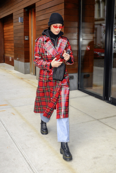 Bella Hadid portait un Trench en laine tartan laminée Burberry hier à New York.