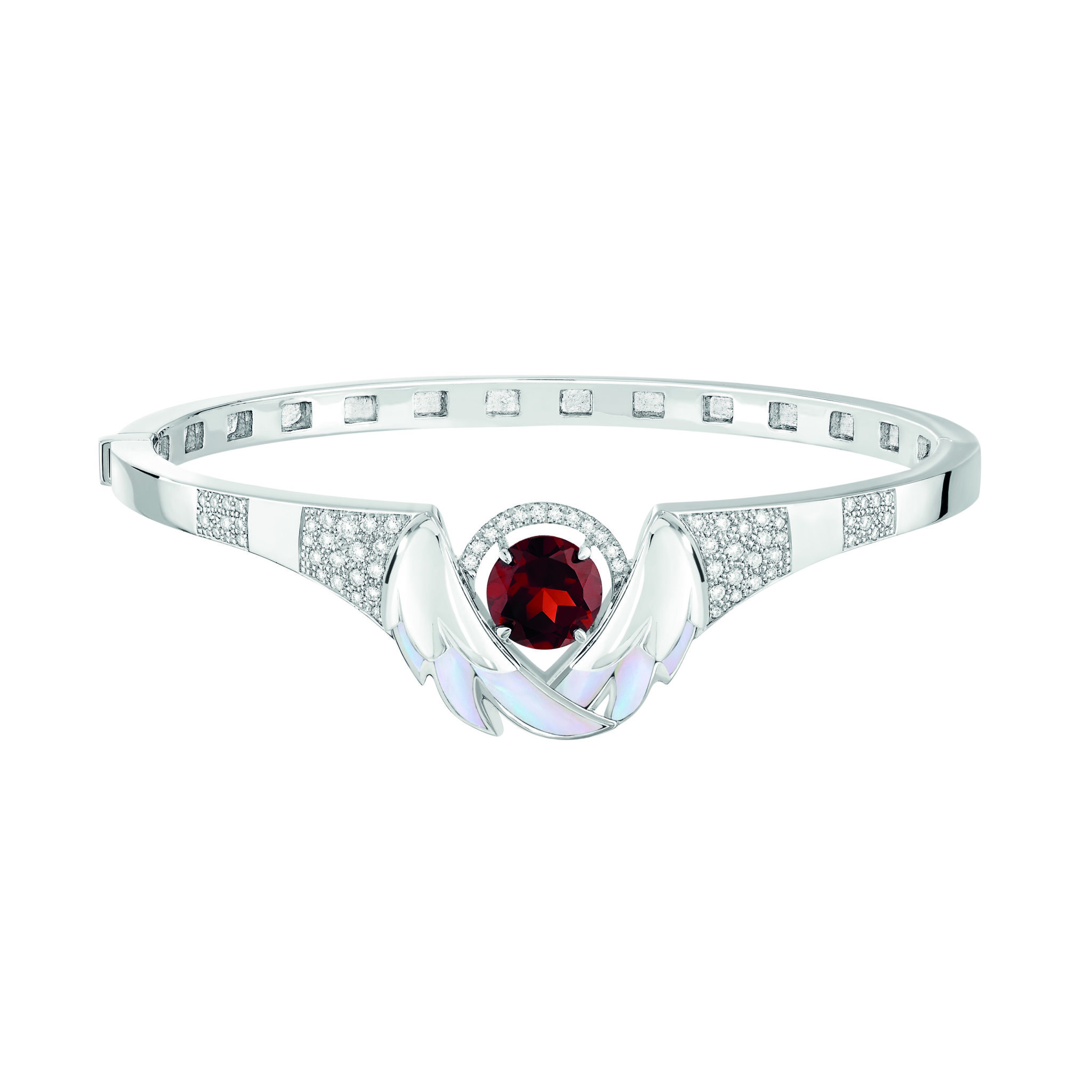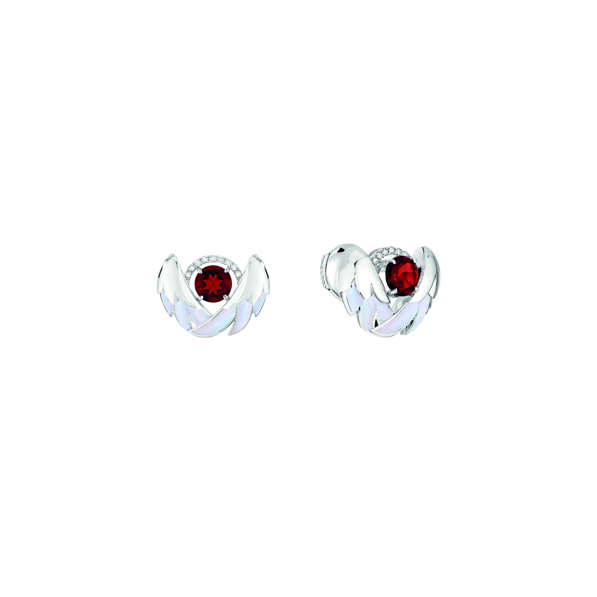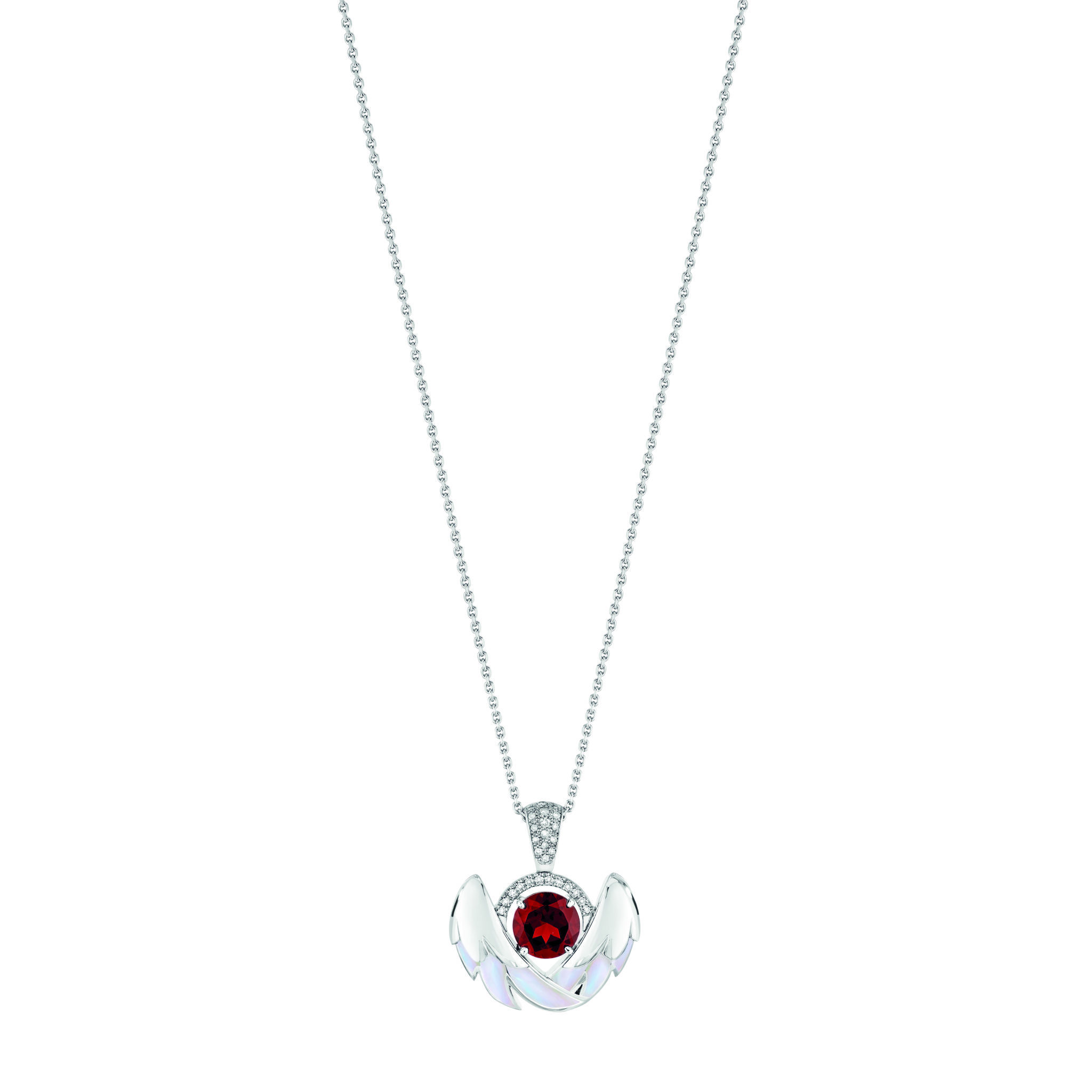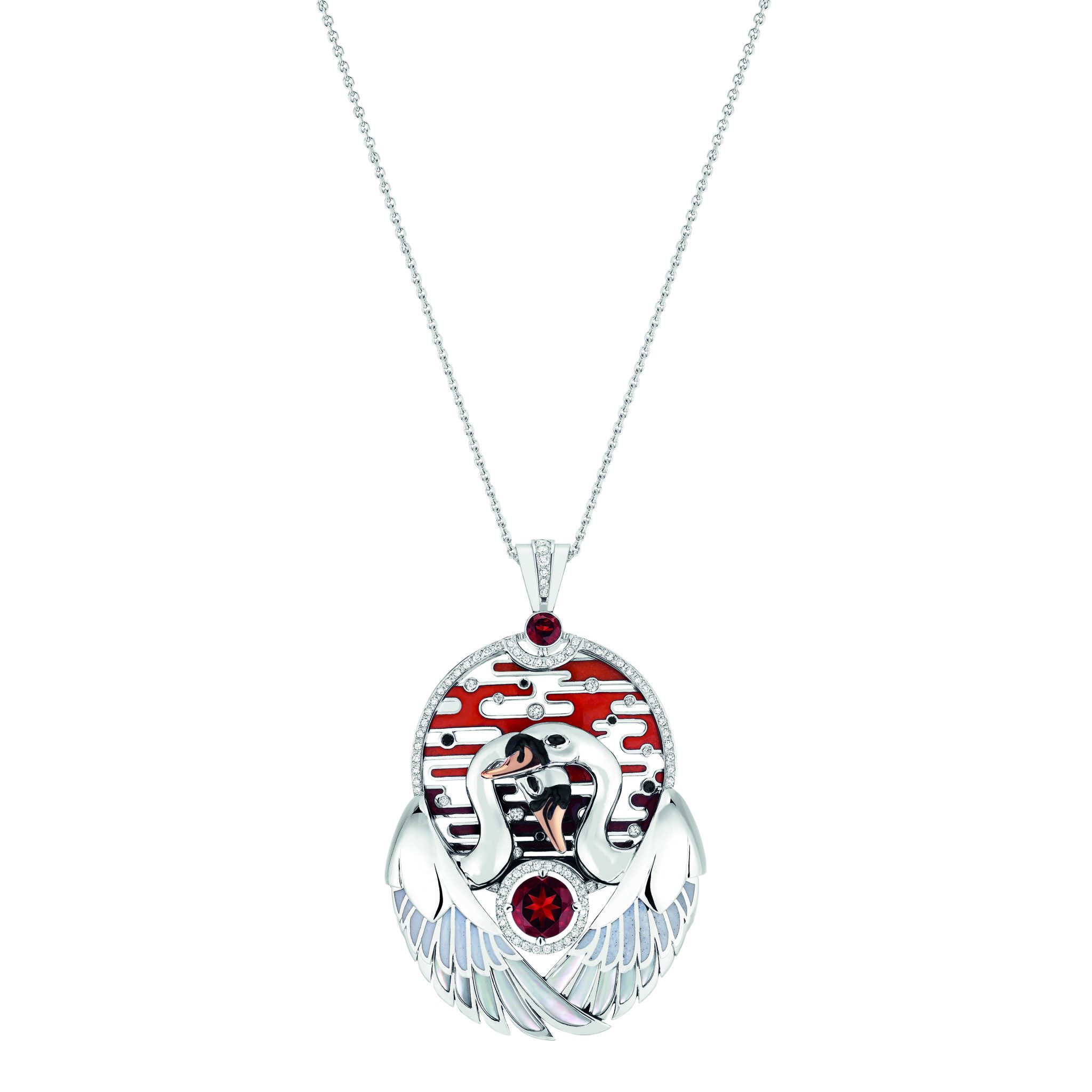 Hommage à la célèbre composition de Tchaïkovski, la collection Cygnes dévoile deux cygnes enlacés dominant le paysage d’un lac au soleil couchant sur un grand pendentif. Cette représentation romancée évoque la symbolique amoureuse associée au cygne. Le grenat serti en pierre de centre sur les cinq pièces de la parure rappelle la célèbre couleur rouge symbolisant l’amour et l’Opéra de Paris alors que la blancheur et l’élégance du cygne sont mis en lumière par l’or blanc, la nacre et les pavages de diamants.