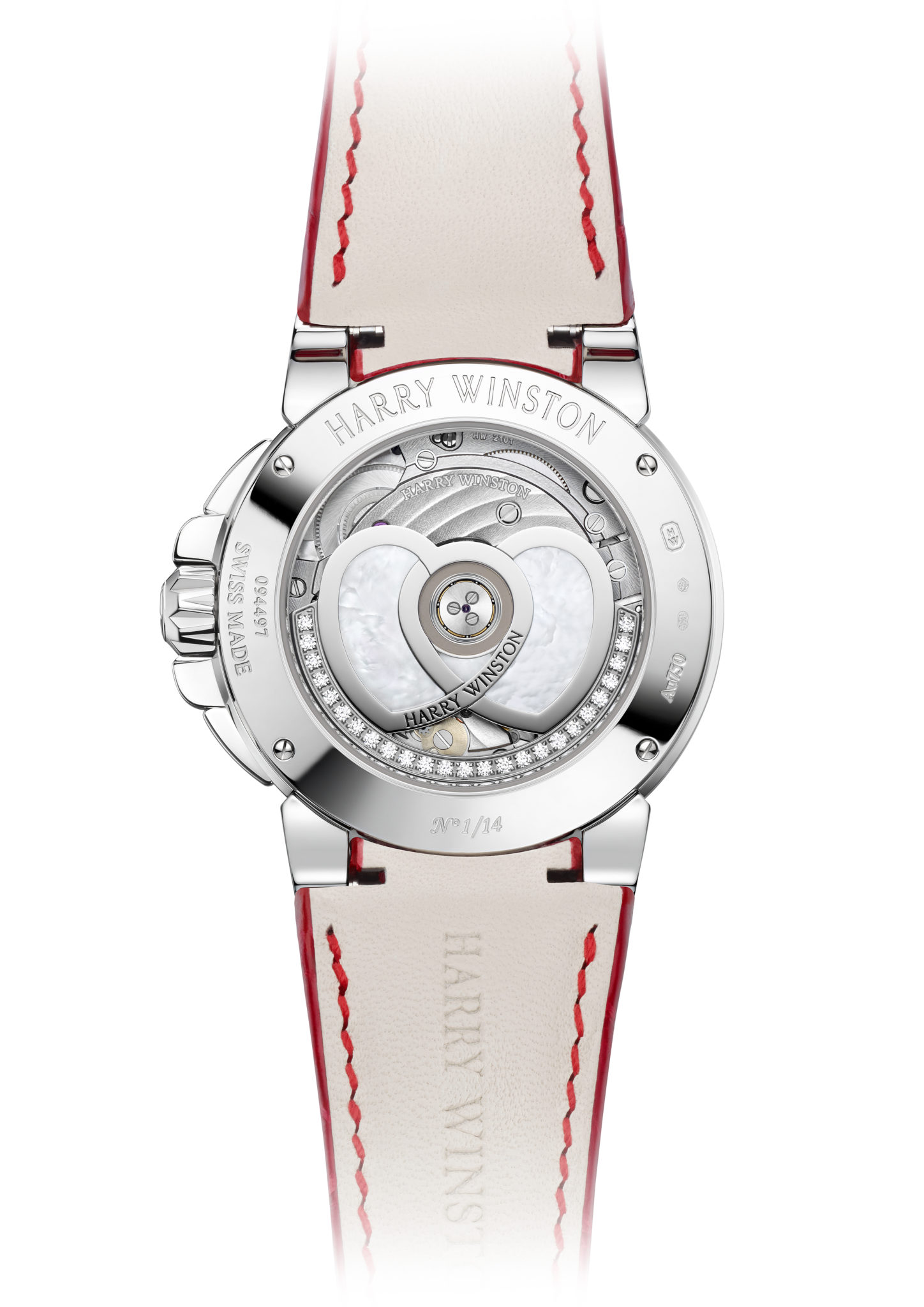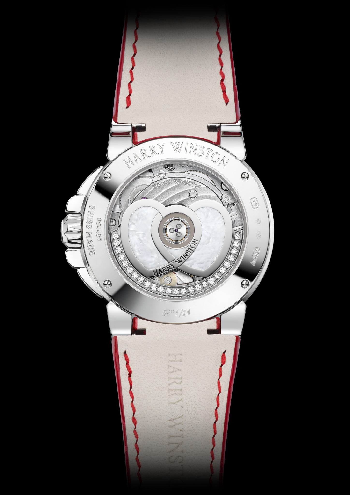 L’esprit romantique de la Saint-Valentin transparaît dans les moindres détails de cette montre. Le mouvement mécanique suisse à remontage automatique, visible à travers la glace saphir sur le fond de la boîte, révèle une charmante nouveauté. Le rotor est composé de deux cœurs entrelacés qui oscillent à l’unisson pour animer les fonctions heures, minutes et secondes rétrogrades. Façonnés en or blanc et incrustés de nacre, ces deux cœurs sont lovés au centre d’un ruban de diamants taille brillant, qui permet à la montre d’afficher l’heure avec précision pendant 65 heures. Le spiral plat en silicium et les technologies de pointe utilisés pour ces montres contribueront à leur fonctionnement irréprochable pendant de longues années, tout en optimisant l’isochronisme global du mouvement.