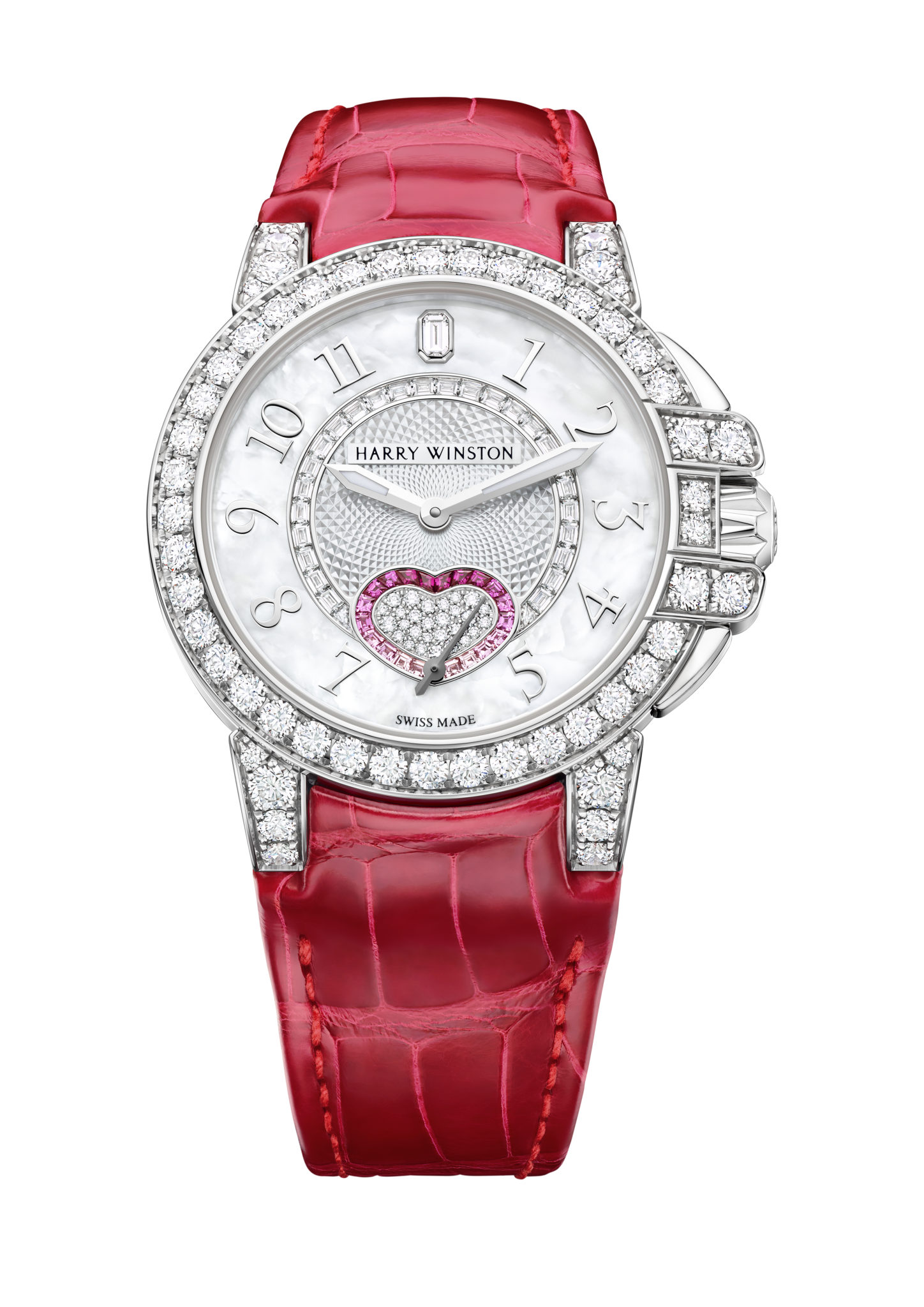 Quand Harry Winston est entré dans le monde de la Haute Horlogerie en 1989, ses pierres précieuses de haute qualité, caractéristiques de la Maison, ont tout naturellement continué à jouer un rôle majeur. Elles se sont parfaitement intégrées à ces nouvelles créations délicates et hautement perfectionnées. La montre Ocean Valentine’s Day en or blanc 18 carats, incrustée de diamants, de nacre et de pierres précieuses de tailles et de formes différentes, ne fait pas exception. Cette nouvelle montre illustre le talent et la créativité extraordinaire des légendaires sertisseurs Harry Winston. La composition dynamique et architecturale du cadran joue sur différentes textures, techniques de sertissage et matériaux : le motif central, en décor guilloché de nacre blanche est entouré d’un cercle de 28 diamants taille baguette sertis avec savoir faire, qui laisse ensuite place à un anneau de nacre blanche iridescente accueillant les chiffres appliqués en or 18 carats
