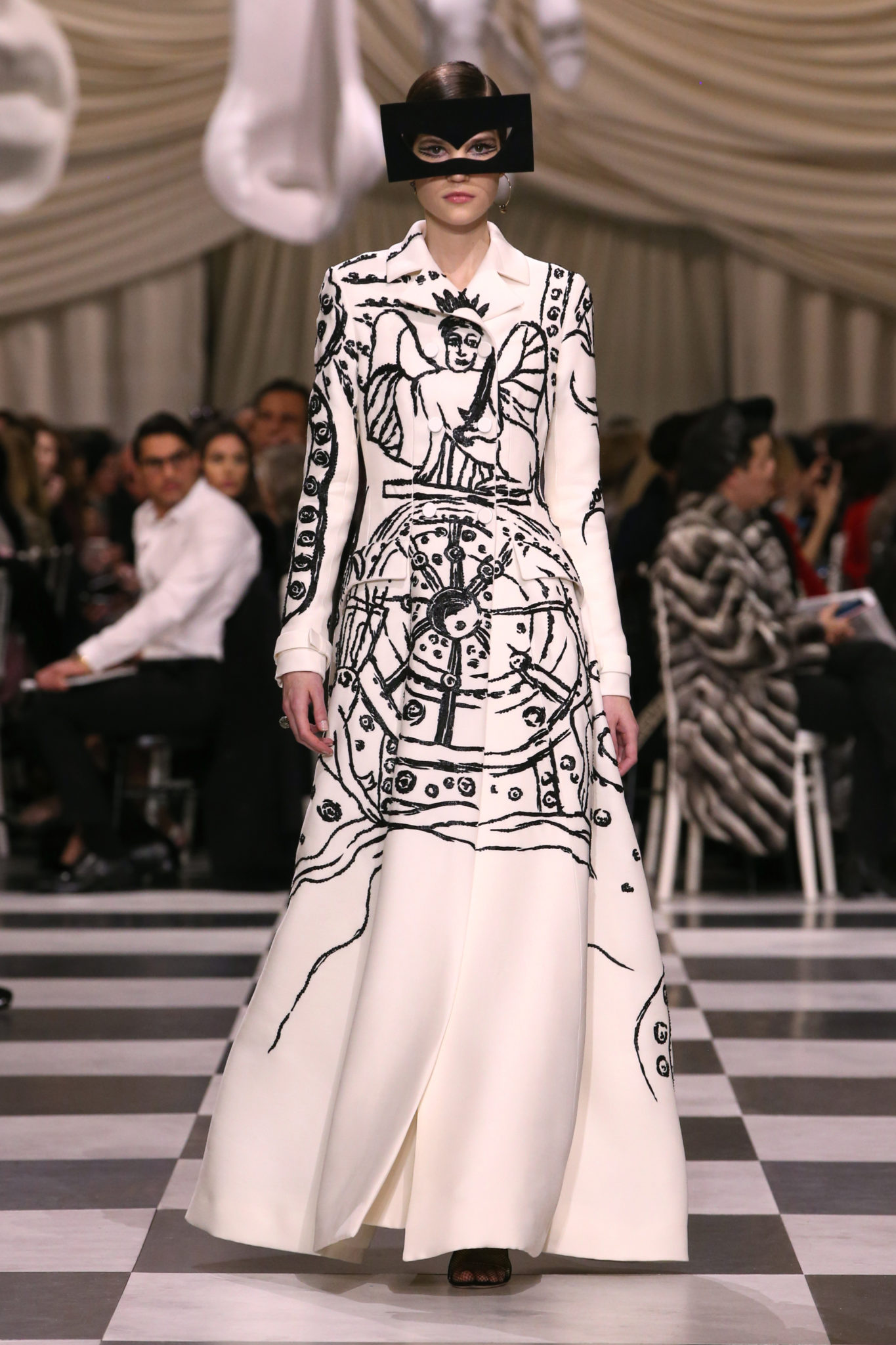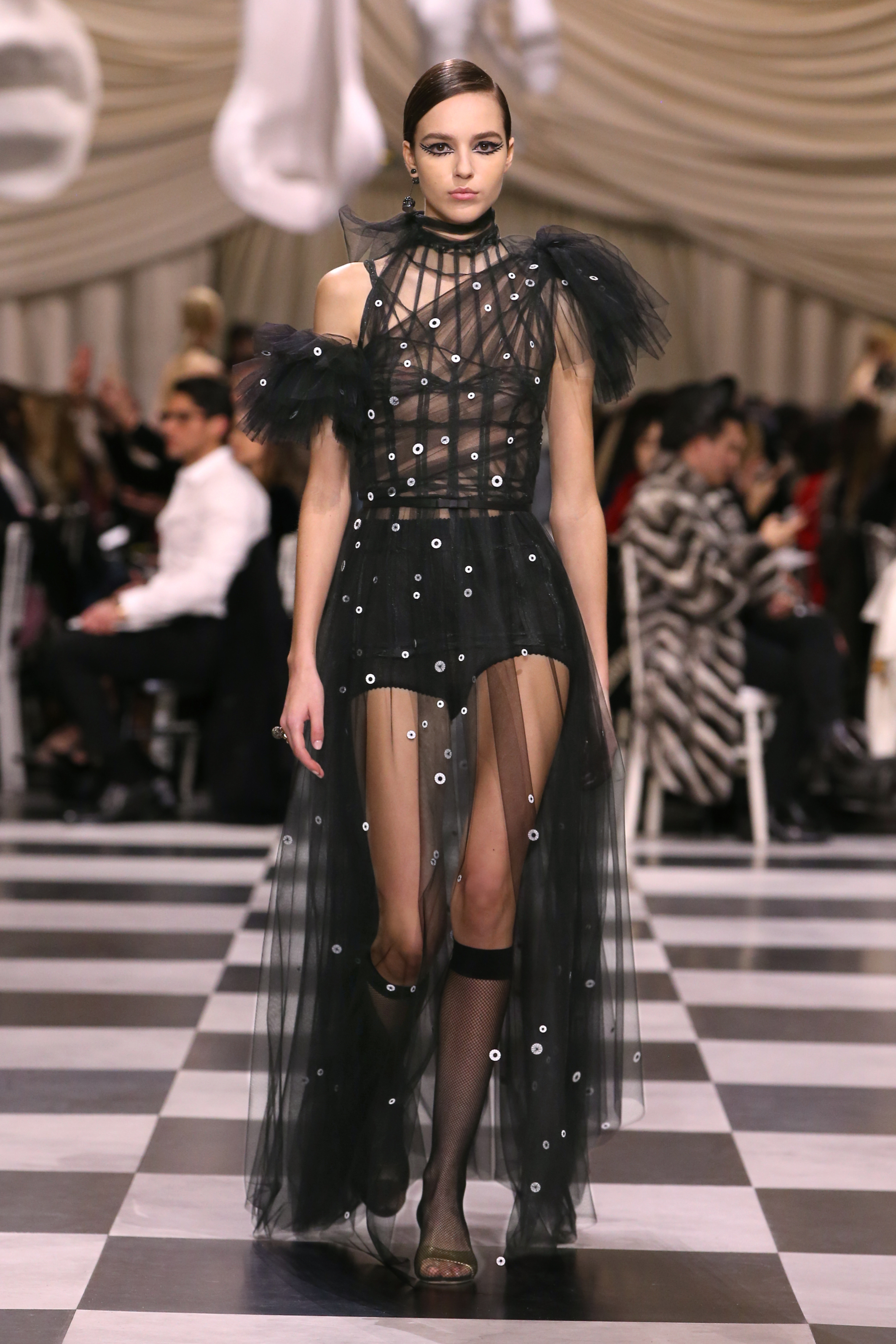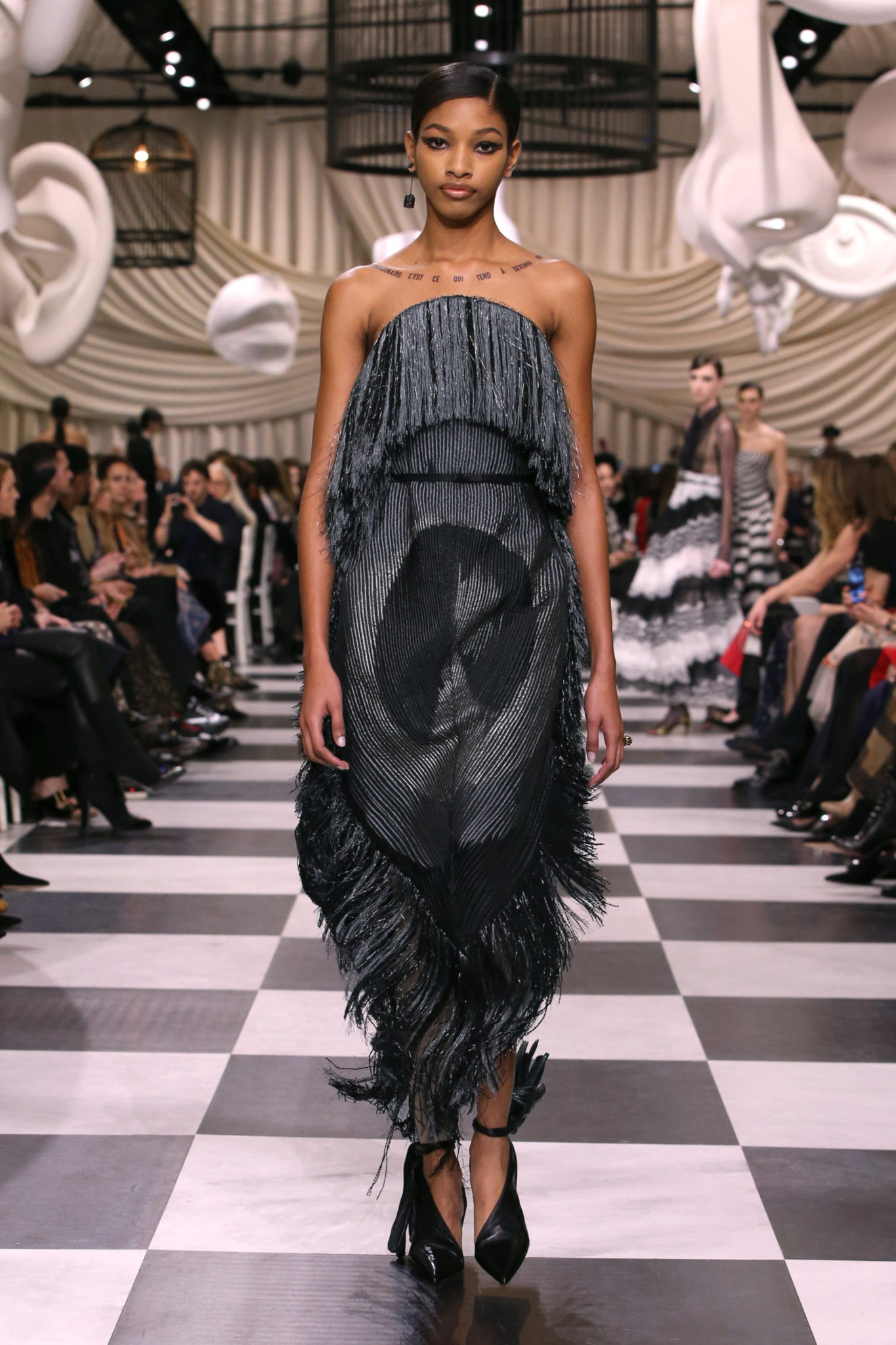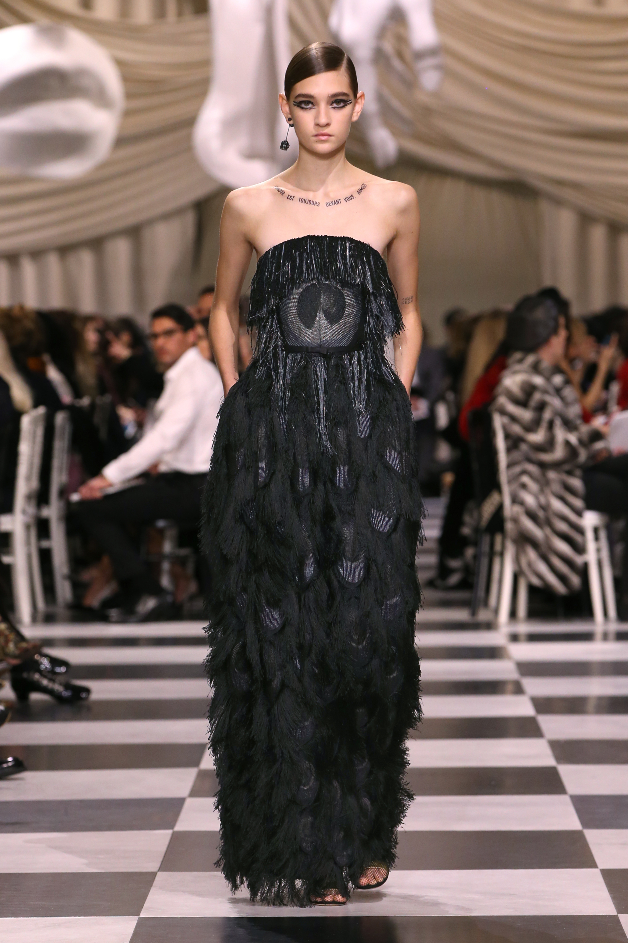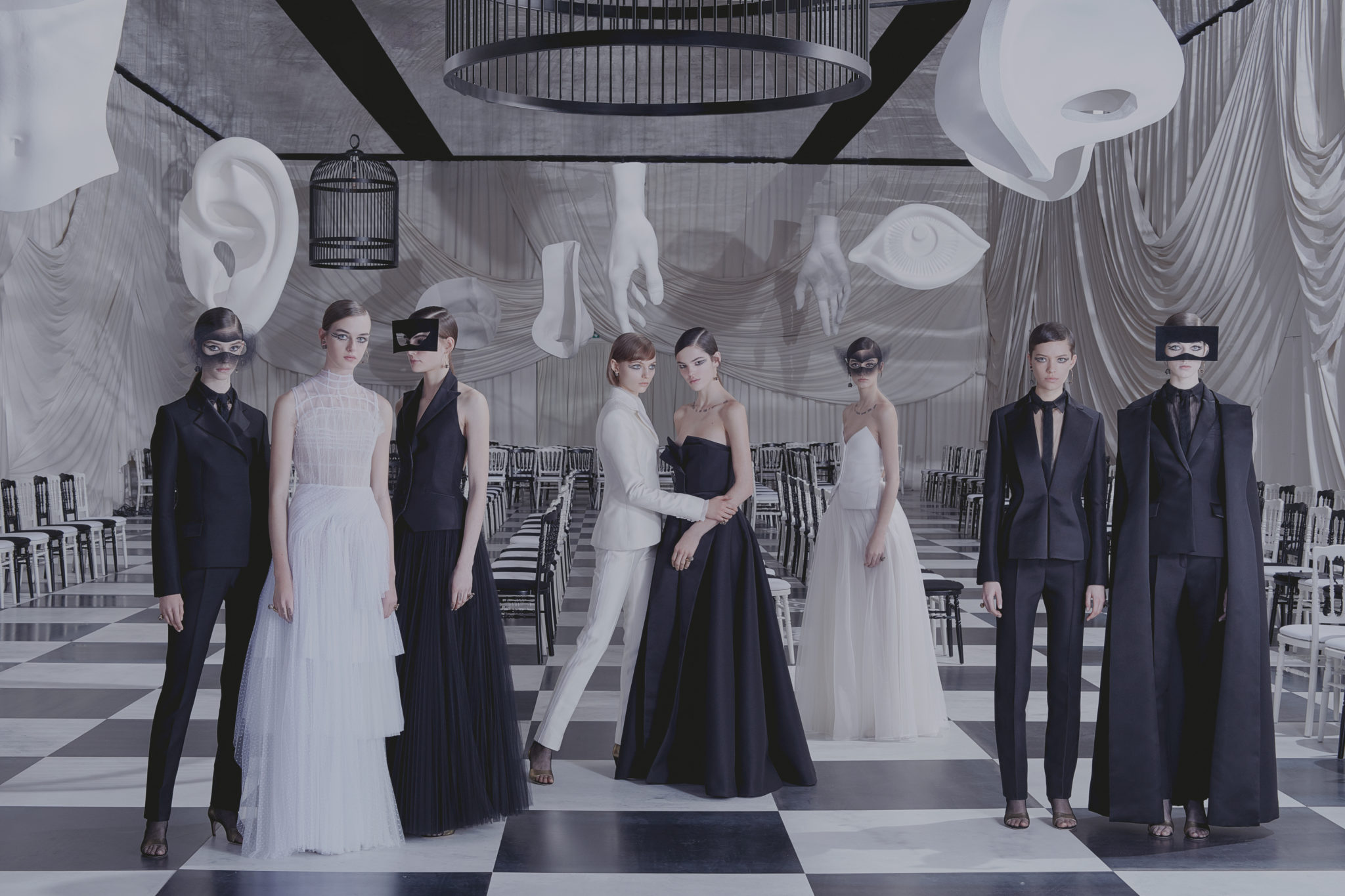 L’histoire de la haute couture est liée à l’histoire de l’art moderne. Le couturier est un créateur à part entière, et le mot « atelier » désigne aussi bien le lieu d’expression de l’artiste que celui du couturier. Mais le véritable atelier de l’artiste demeure son esprit. C’est dans cette dimension, en équilibre entre rêve et réalité, entre imagination et réalisation, que Maria Grazia Chiuri, la Directrice Artistique des collections femme de la Maison, mène ses recherches et ses travaux d’exploration. Parce que la haute couture incarne le rêve de la mode. C’est un lieu où il est possible d’évoluer librement pour expérimenter des techniques, des matières et des formes. S’immerger au cœur du mouvement surréaliste lui a permis d’apporter un souffle imaginatif à cette collection de haute couture printemps-été 2018, pour un dépaysement et un renversement optique permanent.Le surréalisme touche également aux mots, aux textes évocateurs qui ont guidé Maria Grazia Chiuri dans la création d’une collection principalement en noir et blanc, parsemée d’illusions et de surprises.Ne jamais se fier à la première impression… Ainsi, les grands plis de la robe du soir blanche bordés de noir s’ouvrent comme des pages, à la manière d’un livre ; la cage, motif récurrent des œuvres surréalistes, est transfigurée en un réseau de tissu tubulaire noir qui enserre le corps et souligne les jeux de transparence, tandis qu’un filet de pêche en fils d’argent se mêle à la densité du velours. Mais c’est avant tout le charisme de Leonor Fini qui définit l’attitude stricte et radicale de la collection. Leonor Fini qui, après avoir quitté l’Italie pour Paris, avait, à l’époque, organisé sa première exposition précisément dans la galerie de Christian Dior, avec qui elle s’était liée d’amitié. Lors de ses apparitions fantasmagoriques, elle portait souvent des créations Dior. Elle était l’incarnation de l’idée, alors révolutionnaire, qu’il faut toujours rester indépendante et se réinventer soi-même, représentant ainsi tout le champ des réalités possibles. Elle utilisait les vêtements pour se définir et se mettre en scène, pour s’affirmer, aussi bien en public qu’en privé : influente, stricte et élégante, dans des poses empruntées aux portraits masculins de la Renaissance, dans une interaction continue entre vie et œuvre d’art, mêlant le naturel et l’artificiel. C’est dans cette dimension suspendue entre rêve et réalité qu’évoluent les merveilles de la haute couture. Il en va de même pour les tenues de jour, dont Christian Dior a su réinterpréter les formes, notamment en utilisant des tissus masculins, et desquelles Maria Grazia Chiuri s’inspire pour proposer une série de tailleurs. Ceux-ci reprennent les courbes de Dior pour les remettre au goût du jour et s’accordent avec des jupes aux multiples contrastes. Fidèles à la tradition surréaliste du fétichisme du corps déconstruit, les accessoires marquent leur présence d’une manière fantastique : un bas résille voile une sandale, des gants enserrent une cheville. C’est dans cette manière de voir et de se faire voir, dans ce regard plongé dans l’inconscient et porté sur le monde que Maria Grazia Chiuri marie broderies et merveilles. Des ornements précieux et délicats qui, sur une robe habitée par une fantasmagorie flamboyante de plumes de paon, deviennent des yeux qui scrutent et expriment le mystère, mais aussi la puissance de la spiritualité des femmes d’aujourd’hui.