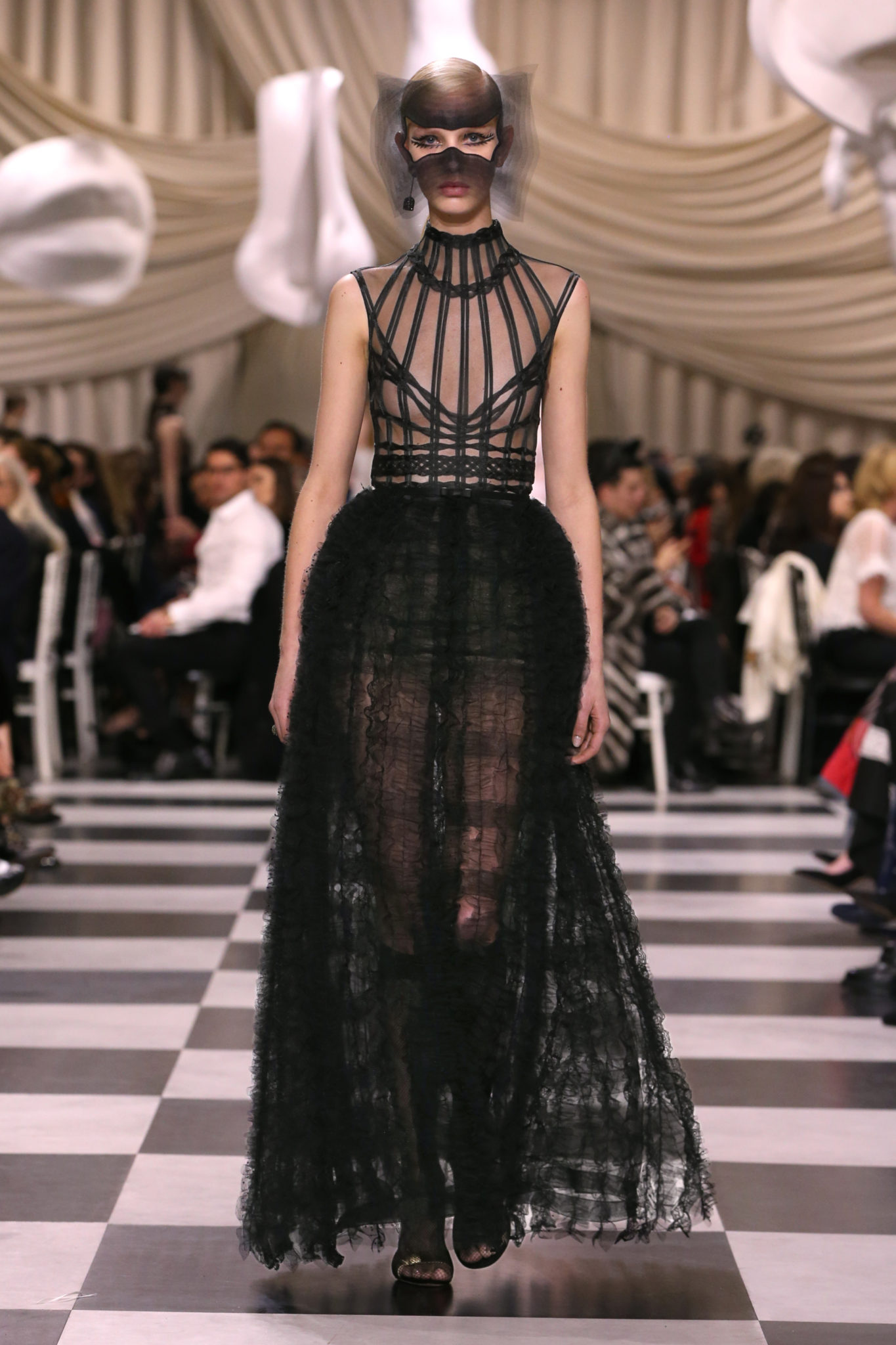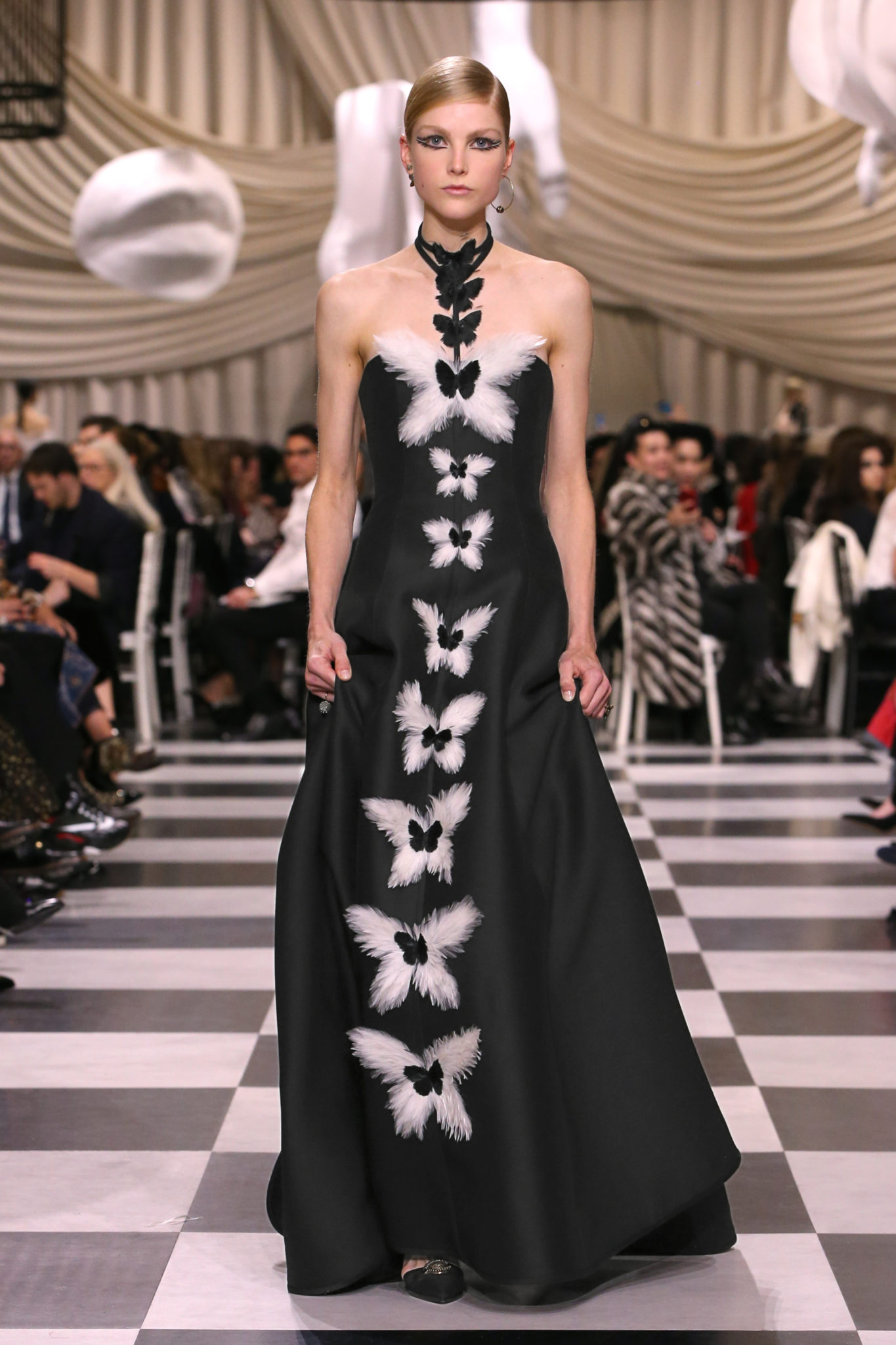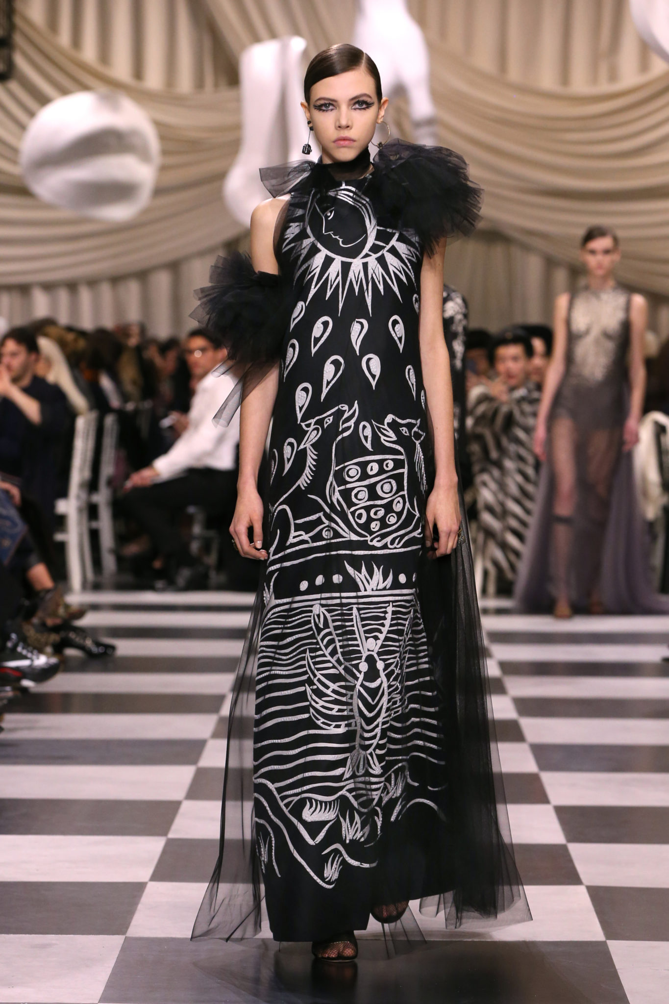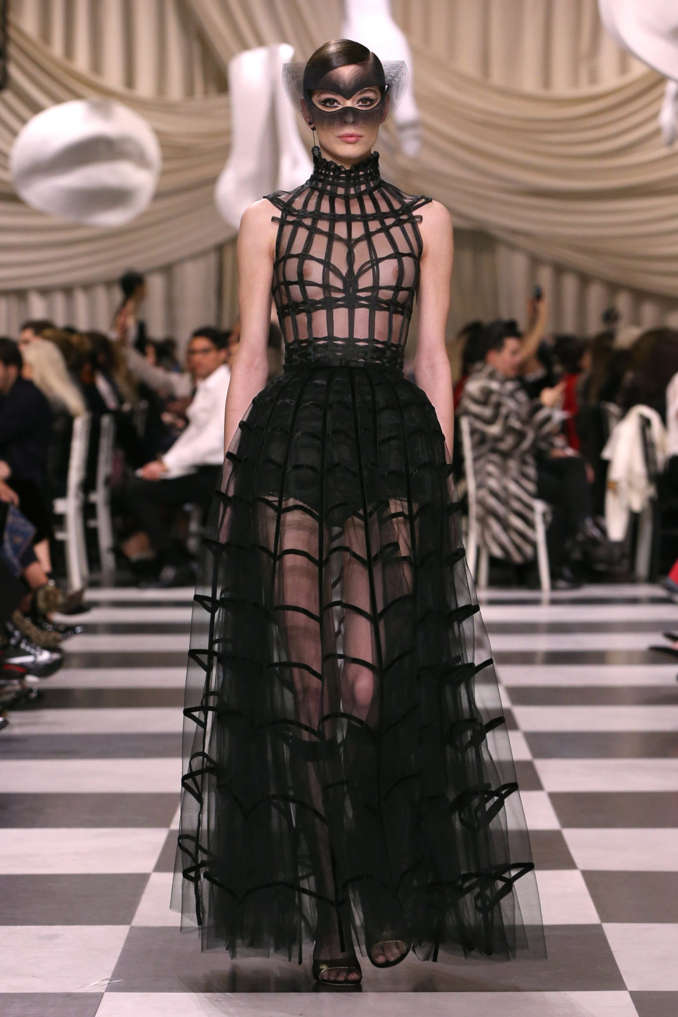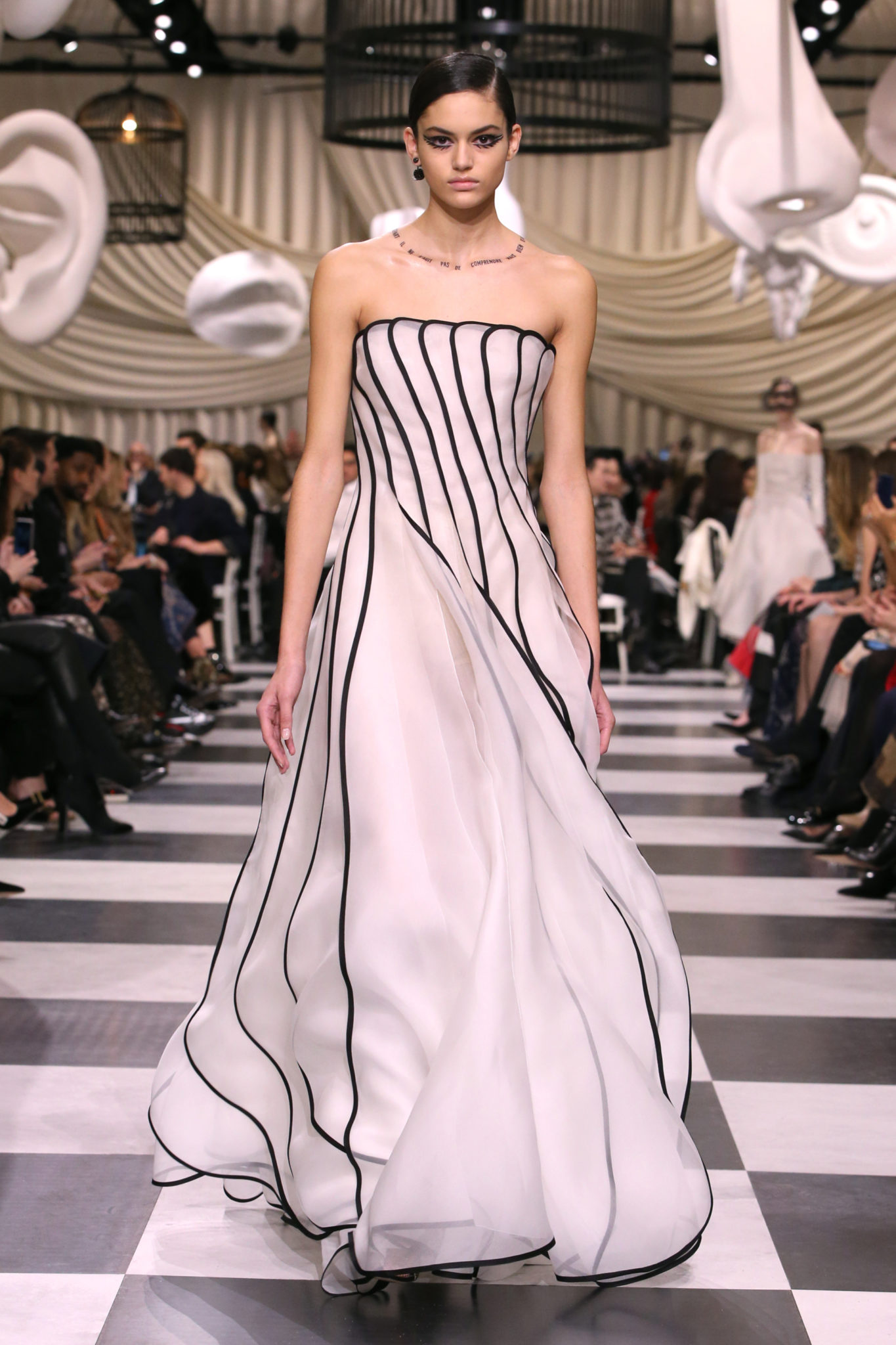 L’histoire de la haute couture est liée à l’histoire de l’art moderne. Le couturier est un créateur à part entière, et le mot « atelier » désigne aussi bien le lieu d’expression de l’artiste que celui du couturier. Mais le véritable atelier de l’artiste demeure son esprit. C’est dans cette dimension, en équilibre entre rêve et réalité, entre imagination et réalisation, que Maria Grazia Chiuri, la Directrice Artistique des collections femme de la Maison, mène ses recherches et ses travaux d’exploration. Parce que la haute couture incarne le rêve de la mode. C’est un lieu où il est possible d’évoluer librement pour expérimenter des techniques, des matières et des formes. S’immerger au cœur du mouvement surréaliste lui a permis d’apporter un souffle imaginatif à cette collection de haute couture printemps-été 2018, pour un dépaysement et un renversement optique permanent.Le surréalisme touche également aux mots, aux textes évocateurs qui ont guidé Maria Grazia Chiuri dans la création d’une collection principalement en noir et blanc, parsemée d’illusions et de surprises.Ne jamais se fier à la première impression… Ainsi, les grands plis de la robe du soir blanche bordés de noir s’ouvrent comme des pages, à la manière d’un livre ; la cage, motif récurrent des œuvres surréalistes, est transfigurée en un réseau de tissu tubulaire noir qui enserre le corps et souligne les jeux de transparence, tandis qu’un filet de pêche en fils d’argent se mêle à la densité du velours. Mais c’est avant tout le charisme de Leonor Fini qui définit l’attitude stricte et radicale de la collection. Leonor Fini qui, après avoir quitté l’Italie pour Paris, avait, à l’époque, organisé sa première exposition précisément dans la galerie de Christian Dior, avec qui elle s’était liée d’amitié. Lors de ses apparitions fantasmagoriques, elle portait souvent des créations Dior. Elle était l’incarnation de l’idée, alors révolutionnaire, qu’il faut toujours rester indépendante et se réinventer soi-même, représentant ainsi tout le champ des réalités possibles. Elle utilisait les vêtements pour se définir et se mettre en scène, pour s’affirmer, aussi bien en public qu’en privé : influente, stricte et élégante, dans des poses empruntées aux portraits masculins de la Renaissance, dans une interaction continue entre vie et œuvre d’art, mêlant le naturel et l’artificiel. C’est dans cette dimension suspendue entre rêve et réalité qu’évoluent les merveilles de la haute couture. Il en va de même pour les tenues de jour, dont Christian Dior a su réinterpréter les formes, notamment en utilisant des tissus masculins, et desquelles Maria Grazia Chiuri s’inspire pour proposer une série de tailleurs. Ceux-ci reprennent les courbes de Dior pour les remettre au goût du jour et s’accordent avec des jupes aux multiples contrastes. Fidèles à la tradition surréaliste du fétichisme du corps déconstruit, les accessoires marquent leur présence d’une manière fantastique : un bas résille voile une sandale, des gants enserrent une cheville. C’est dans cette manière de voir et de se faire voir, dans ce regard plongé dans l’inconscient et porté sur le monde que Maria Grazia Chiuri marie broderies et merveilles. Des ornements précieux et délicats qui, sur une robe habitée par une fantasmagorie flamboyante de plumes de paon, deviennent des yeux qui scrutent et expriment le mystère, mais aussi la puissance de la spiritualité des femmes d’aujourd’hui.