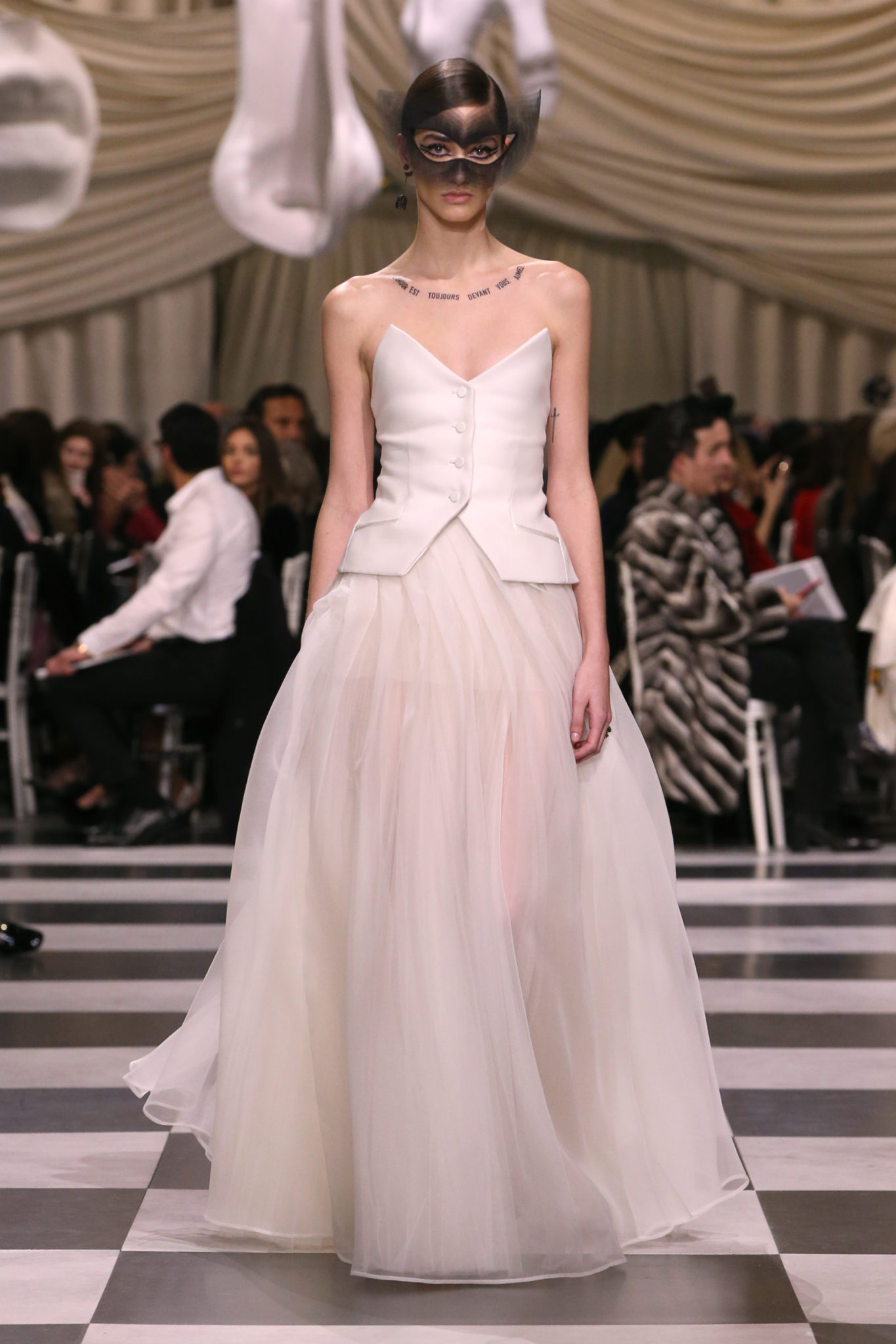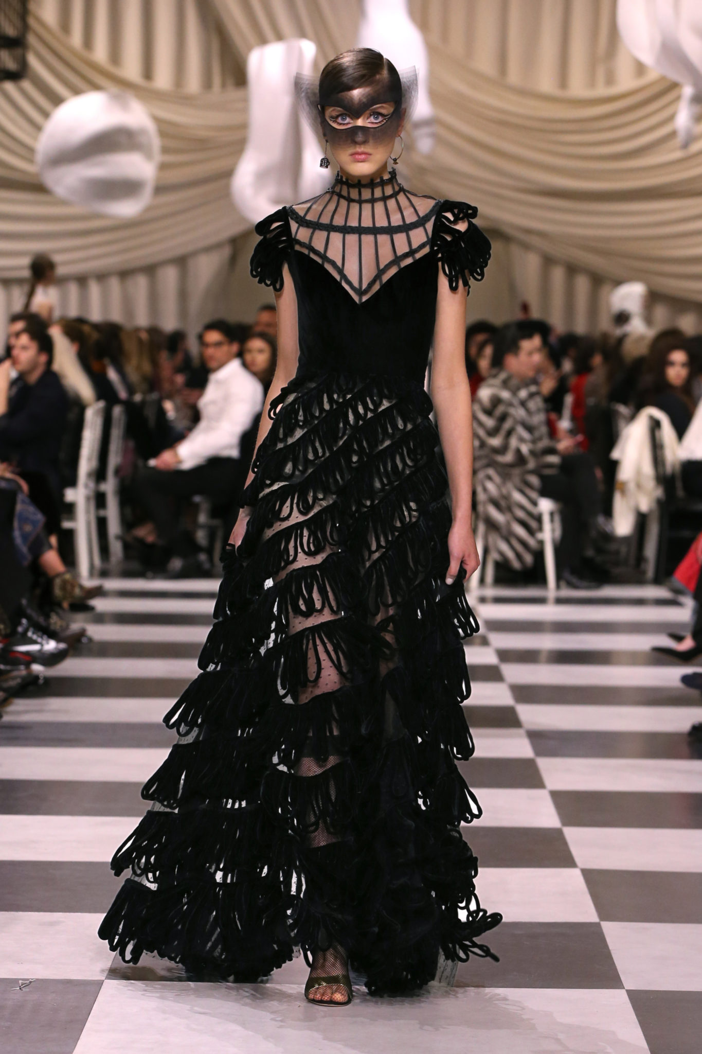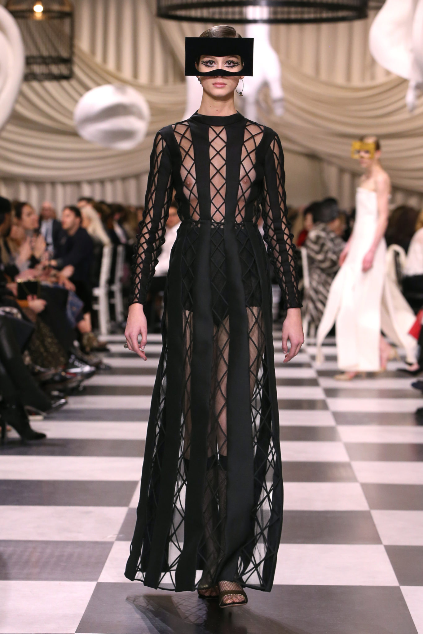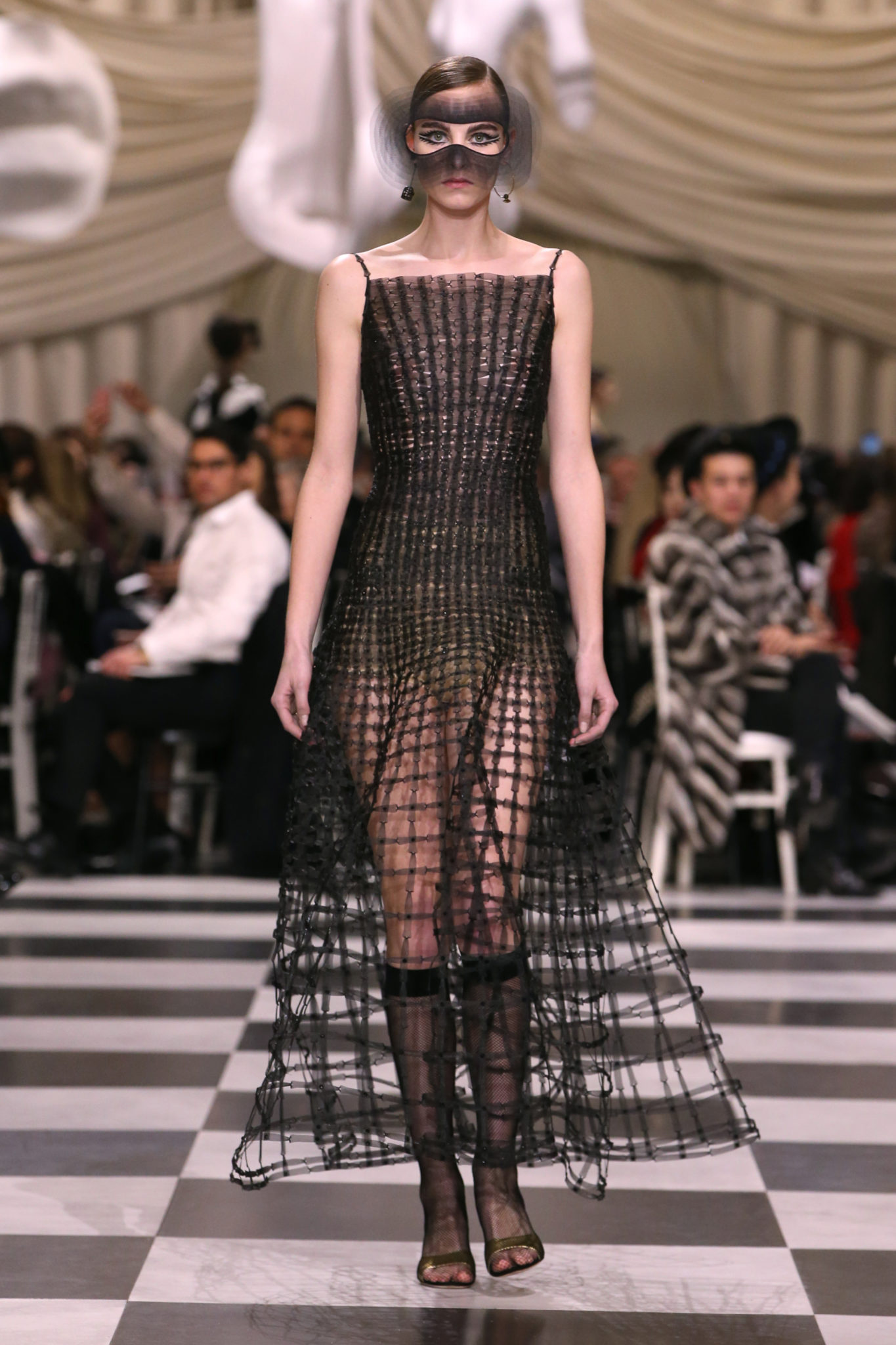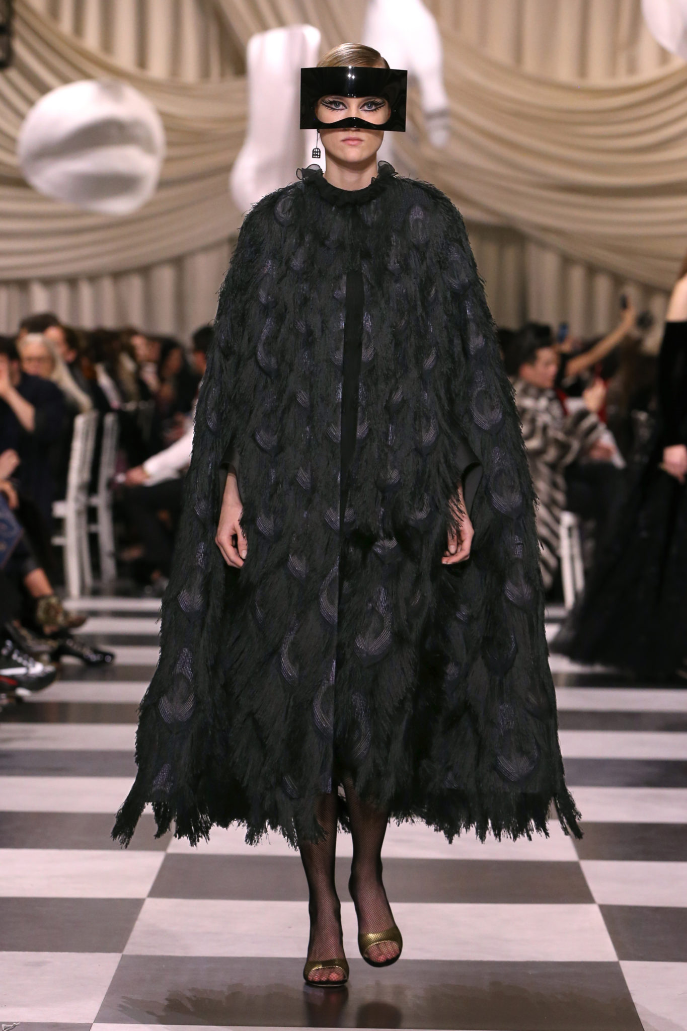 L’histoire de la haute couture est liée à l’histoire de l’art moderne. Le couturier est un créateur à part entière, et le mot « atelier » désigne aussi bien le lieu d’expression de l’artiste que celui du couturier. Mais le véritable atelier de l’artiste demeure son esprit. C’est dans cette dimension, en équilibre entre rêve et réalité, entre imagination et réalisation, que Maria Grazia Chiuri, la Directrice Artistique des collections femme de la Maison, mène ses recherches et ses travaux d’exploration. Parce que la haute couture incarne le rêve de la mode. C’est un lieu où il est possible d’évoluer librement pour expérimenter des techniques, des matières et des formes. S’immerger au cœur du mouvement surréaliste lui a permis d’apporter un souffle imaginatif à cette collection de haute couture printemps-été 2018, pour un dépaysement et un renversement optique permanent.Le surréalisme touche également aux mots, aux textes évocateurs qui ont guidé Maria Grazia Chiuri dans la création d’une collection principalement en noir et blanc, parsemée d’illusions et de surprises.Ne jamais se fier à la première impression… Ainsi, les grands plis de la robe du soir blanche bordés de noir s’ouvrent comme des pages, à la manière d’un livre ; la cage, motif récurrent des œuvres surréalistes, est transfigurée en un réseau de tissu tubulaire noir qui enserre le corps et souligne les jeux de transparence, tandis qu’un filet de pêche en fils d’argent se mêle à la densité du velours. Mais c’est avant tout le charisme de Leonor Fini qui définit l’attitude stricte et radicale de la collection. Leonor Fini qui, après avoir quitté l’Italie pour Paris, avait, à l’époque, organisé sa première exposition précisément dans la galerie de Christian Dior, avec qui elle s’était liée d’amitié. Lors de ses apparitions fantasmagoriques, elle portait souvent des créations Dior. Elle était l’incarnation de l’idée, alors révolutionnaire, qu’il faut toujours rester indépendante et se réinventer soi-même, représentant ainsi tout le champ des réalités possibles. Elle utilisait les vêtements pour se définir et se mettre en scène, pour s’affirmer, aussi bien en public qu’en privé : influente, stricte et élégante, dans des poses empruntées aux portraits masculins de la Renaissance, dans une interaction continue entre vie et œuvre d’art, mêlant le naturel et l’artificiel. C’est dans cette dimension suspendue entre rêve et réalité qu’évoluent les merveilles de la haute couture. Il en va de même pour les tenues de jour, dont Christian Dior a su réinterpréter les formes, notamment en utilisant des tissus masculins, et desquelles Maria Grazia Chiuri s’inspire pour proposer une série de tailleurs. Ceux-ci reprennent les courbes de Dior pour les remettre au goût du jour et s’accordent avec des jupes aux multiples contrastes. Fidèles à la tradition surréaliste du fétichisme du corps déconstruit, les accessoires marquent leur présence d’une manière fantastique : un bas résille voile une sandale, des gants enserrent une cheville. C’est dans cette manière de voir et de se faire voir, dans ce regard plongé dans l’inconscient et porté sur le monde que Maria Grazia Chiuri marie broderies et merveilles. Des ornements précieux et délicats qui, sur une robe habitée par une fantasmagorie flamboyante de plumes de paon, deviennent des yeux qui scrutent et expriment le mystère, mais aussi la puissance de la spiritualité des femmes d’aujourd’hui.