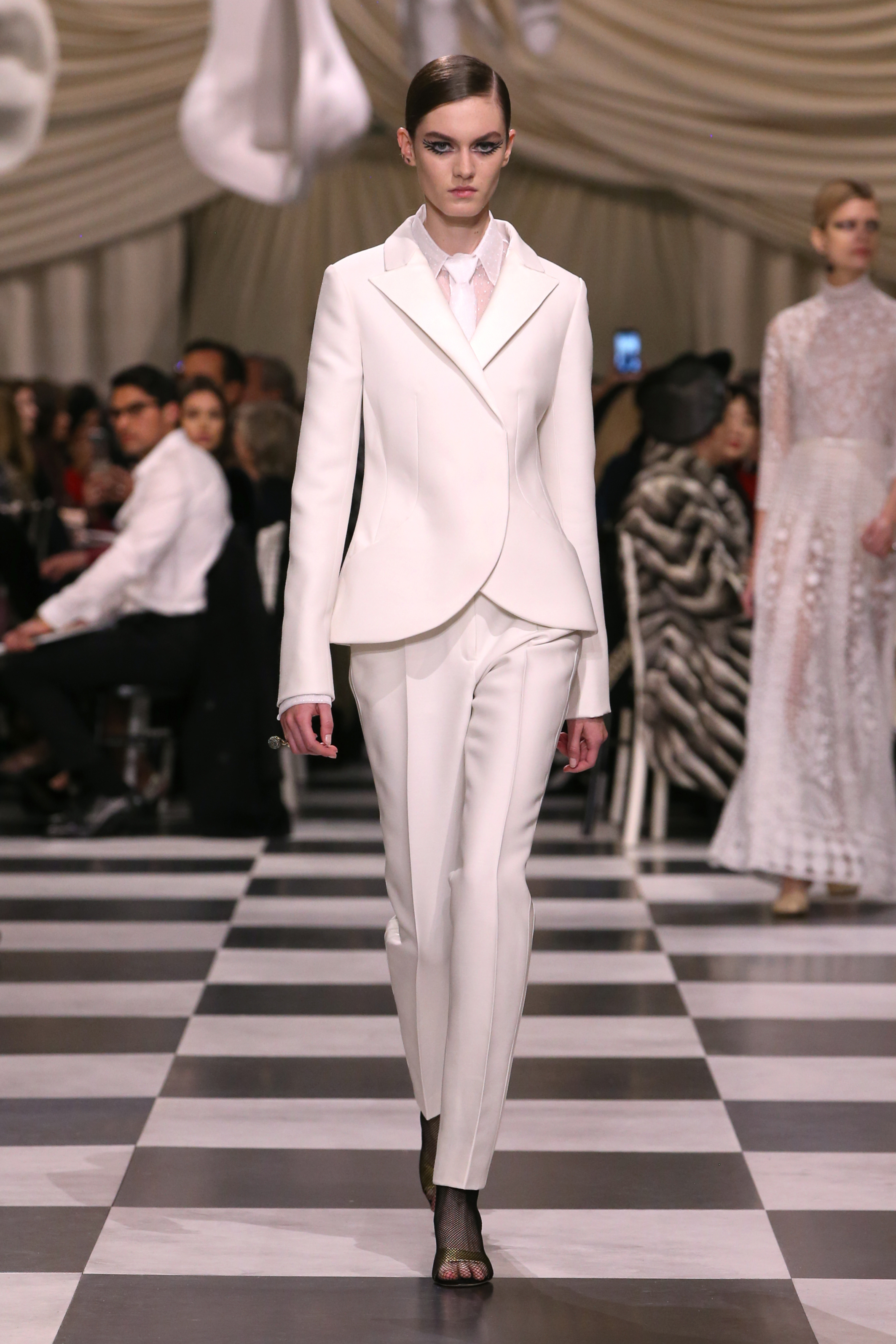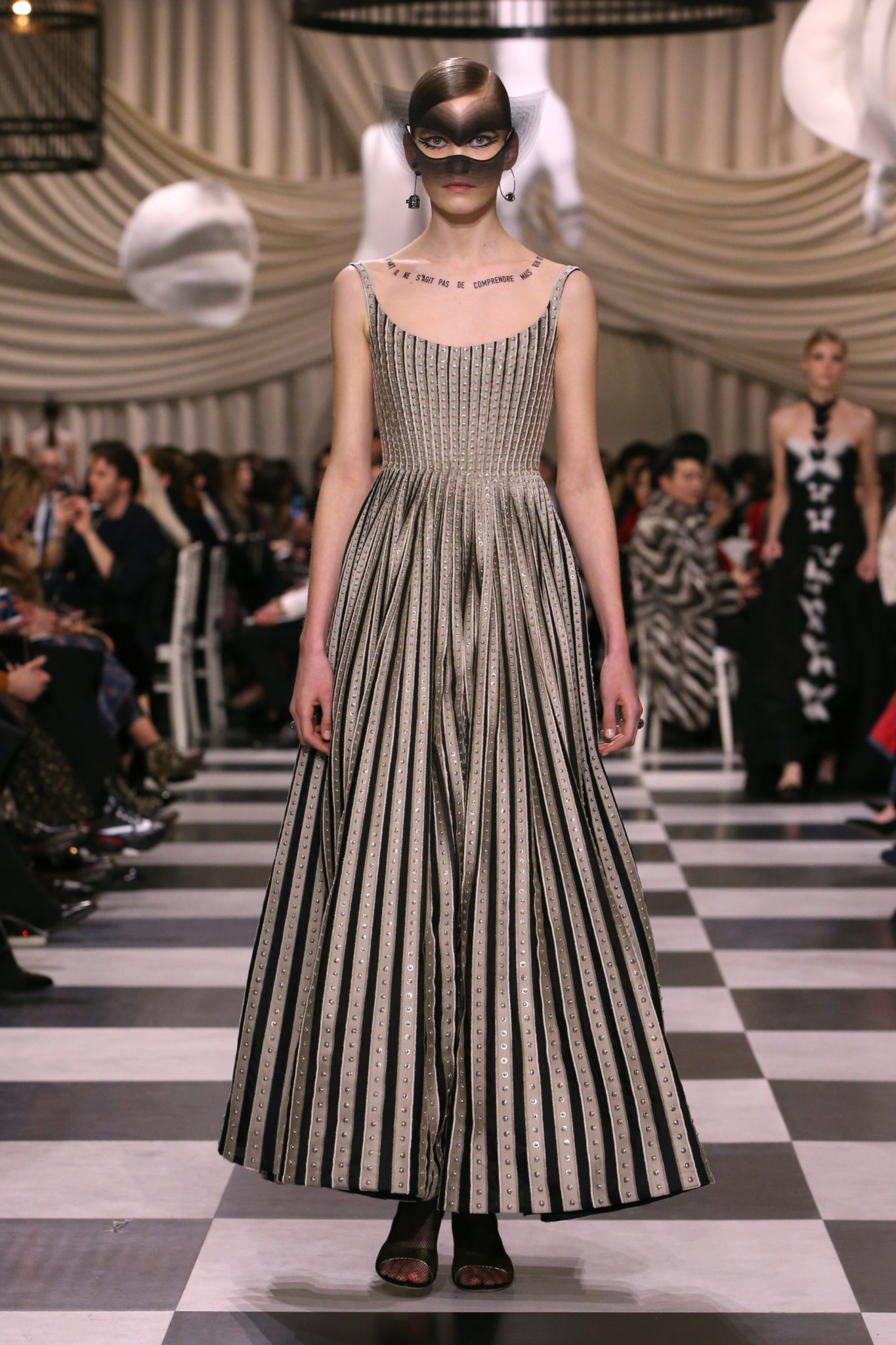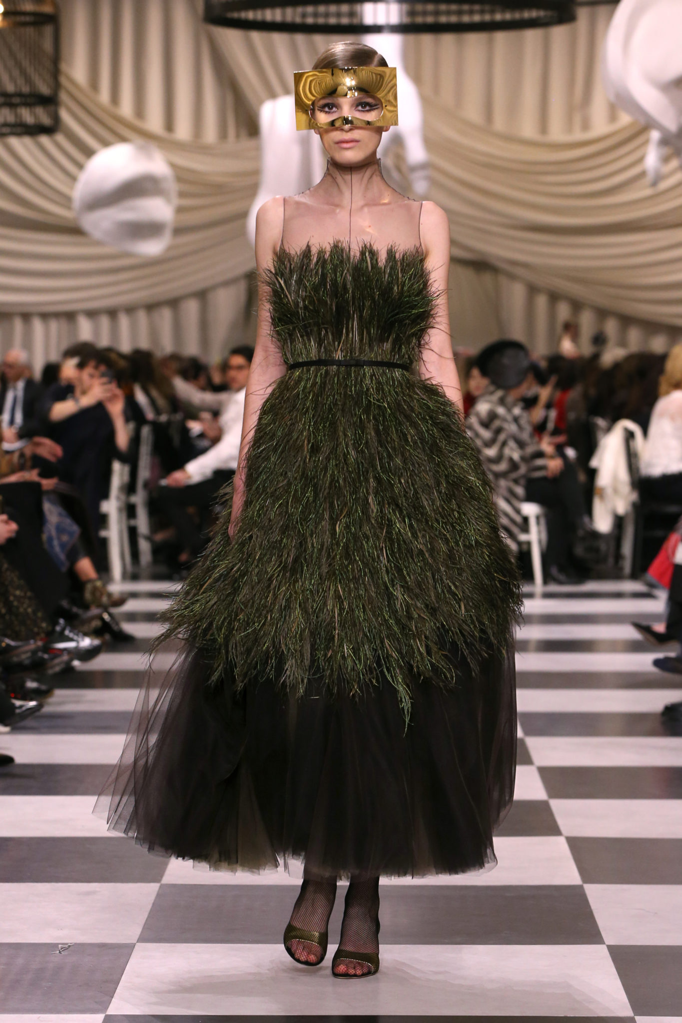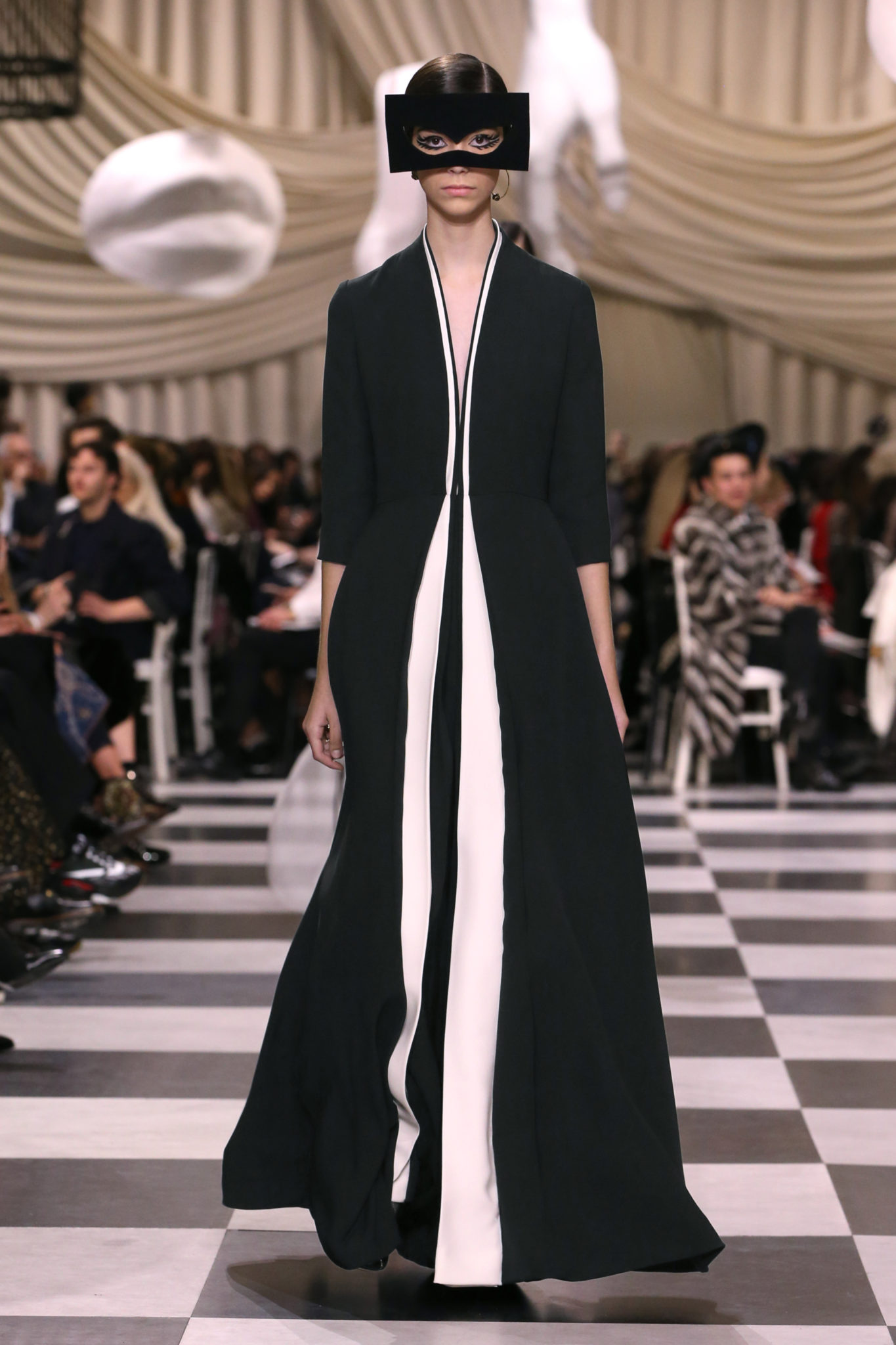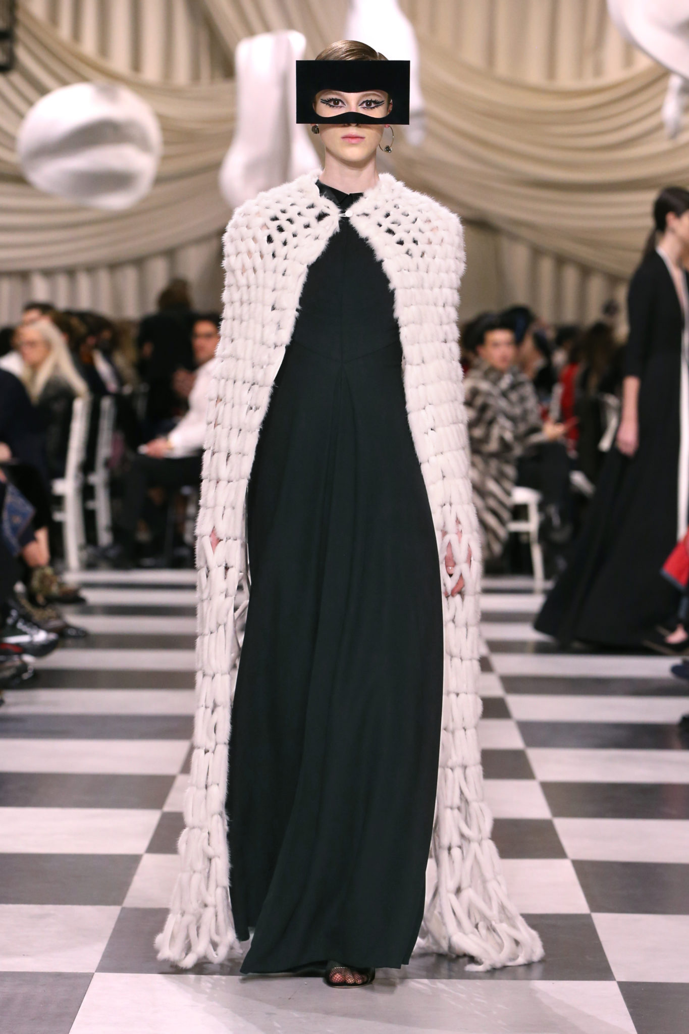 L’histoire de la haute couture est liée à l’histoire de l’art moderne. Le couturier est un créateur à part entière, et le mot « atelier » désigne aussi bien le lieu d’expression de l’artiste que celui du couturier. Mais le véritable atelier de l’artiste demeure son esprit. C’est dans cette dimension, en équilibre entre rêve et réalité, entre imagination et réalisation, que Maria Grazia Chiuri, la Directrice Artistique des collections femme de la Maison, mène ses recherches et ses travaux d’exploration. Parce que la haute couture incarne le rêve de la mode. C’est un lieu où il est possible d’évoluer librement pour expérimenter des techniques, des matières et des formes. S’immerger au cœur du mouvement surréaliste lui a permis d’apporter un souffle imaginatif à cette collection de haute couture printemps-été 2018, pour un dépaysement et un renversement optique permanent.Le surréalisme touche également aux mots, aux textes évocateurs qui ont guidé Maria Grazia Chiuri dans la création d’une collection principalement en noir et blanc, parsemée d’illusions et de surprises.Ne jamais se fier à la première impression… Ainsi, les grands plis de la robe du soir blanche bordés de noir s’ouvrent comme des pages, à la manière d’un livre ; la cage, motif récurrent des œuvres surréalistes, est transfigurée en un réseau de tissu tubulaire noir qui enserre le corps et souligne les jeux de transparence, tandis qu’un filet de pêche en fils d’argent se mêle à la densité du velours. Mais c’est avant tout le charisme de Leonor Fini qui définit l’attitude stricte et radicale de la collection. Leonor Fini qui, après avoir quitté l’Italie pour Paris, avait, à l’époque, organisé sa première exposition précisément dans la galerie de Christian Dior, avec qui elle s’était liée d’amitié. Lors de ses apparitions fantasmagoriques, elle portait souvent des créations Dior. Elle était l’incarnation de l’idée, alors révolutionnaire, qu’il faut toujours rester indépendante et se réinventer soi-même, représentant ainsi tout le champ des réalités possibles. Elle utilisait les vêtements pour se définir et se mettre en scène, pour s’affirmer, aussi bien en public qu’en privé : influente, stricte et élégante, dans des poses empruntées aux portraits masculins de la Renaissance, dans une interaction continue entre vie et œuvre d’art, mêlant le naturel et l’artificiel. C’est dans cette dimension suspendue entre rêve et réalité qu’évoluent les merveilles de la haute couture. Il en va de même pour les tenues de jour, dont Christian Dior a su réinterpréter les formes, notamment en utilisant des tissus masculins, et desquelles Maria Grazia Chiuri s’inspire pour proposer une série de tailleurs. Ceux-ci reprennent les courbes de Dior pour les remettre au goût du jour et s’accordent avec des jupes aux multiples contrastes. Fidèles à la tradition surréaliste du fétichisme du corps déconstruit, les accessoires marquent leur présence d’une manière fantastique : un bas résille voile une sandale, des gants enserrent une cheville. C’est dans cette manière de voir et de se faire voir, dans ce regard plongé dans l’inconscient et porté sur le monde que Maria Grazia Chiuri marie broderies et merveilles. Des ornements précieux et délicats qui, sur une robe habitée par une fantasmagorie flamboyante de plumes de paon, deviennent des yeux qui scrutent et expriment le mystère, mais aussi la puissance de la spiritualité des femmes d’aujourd’hui.
