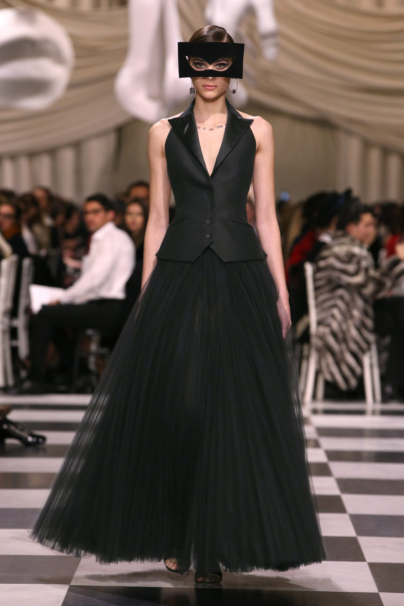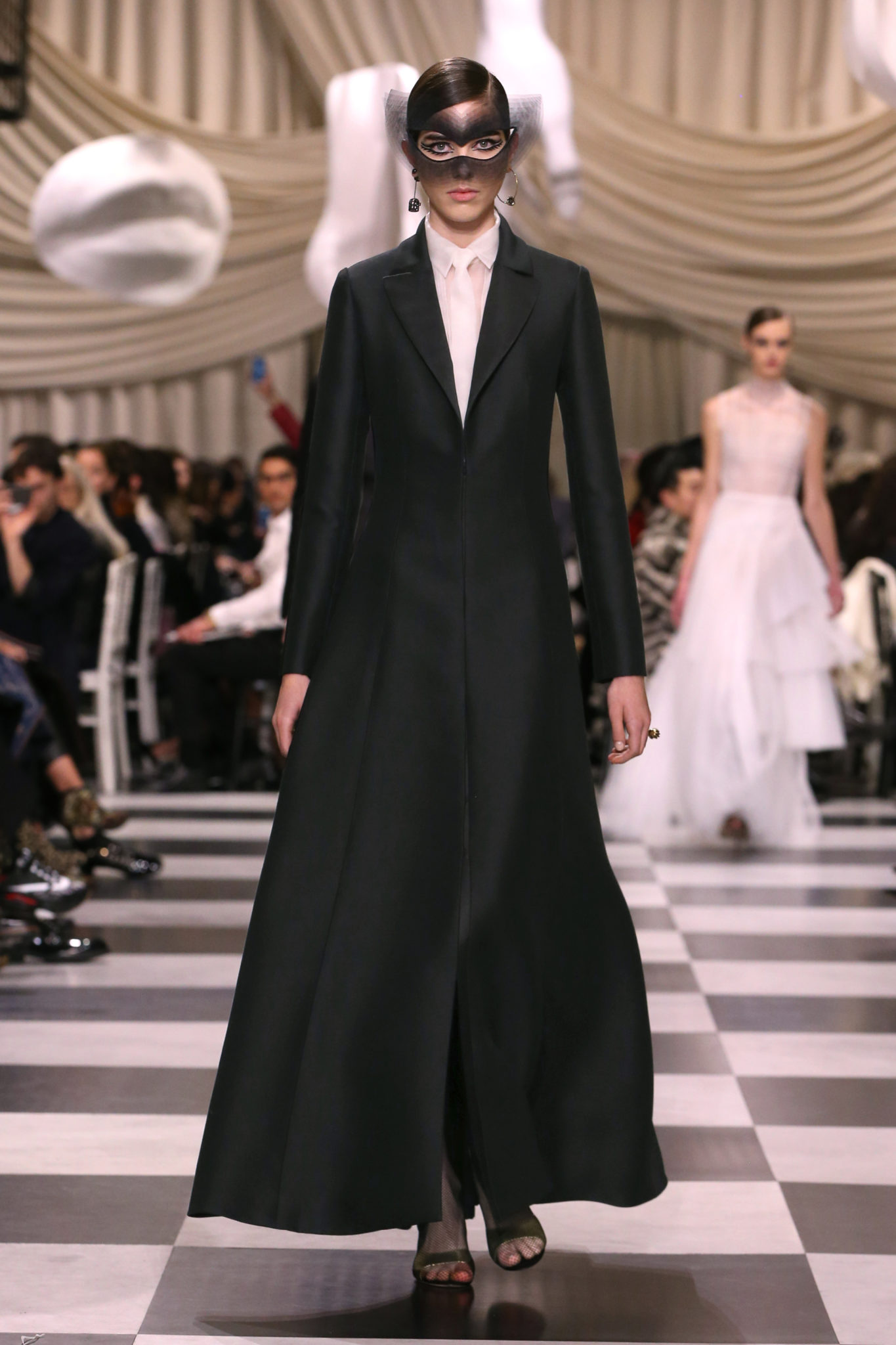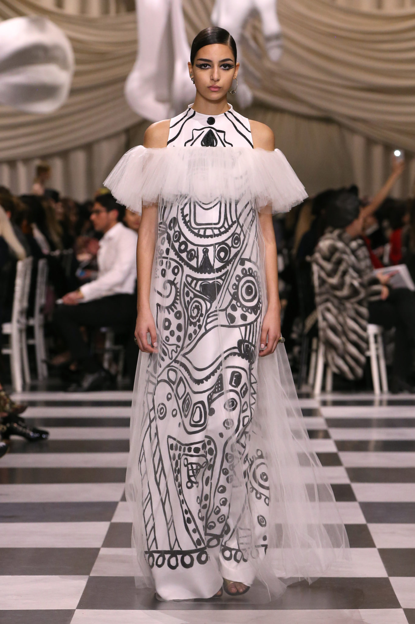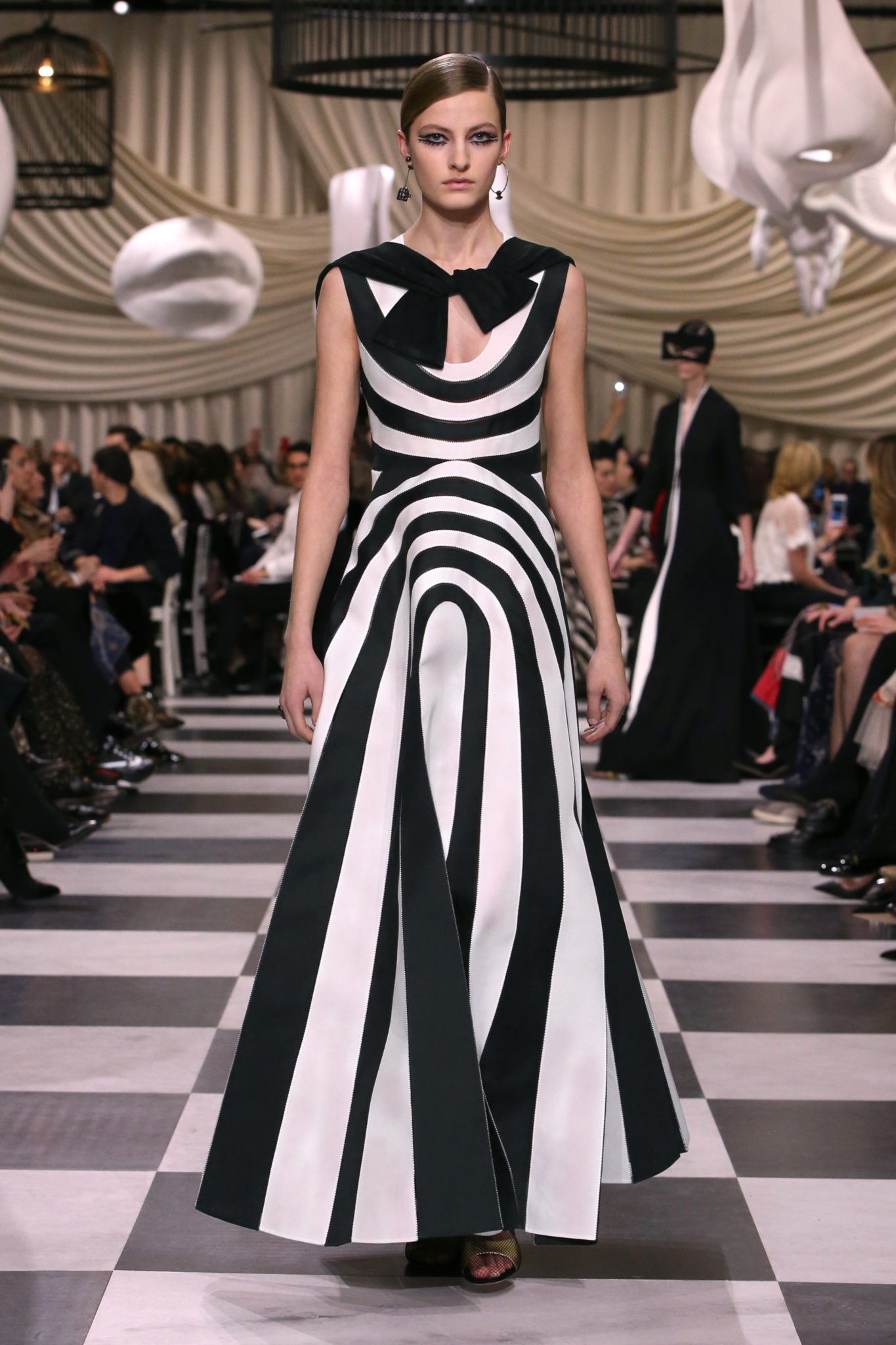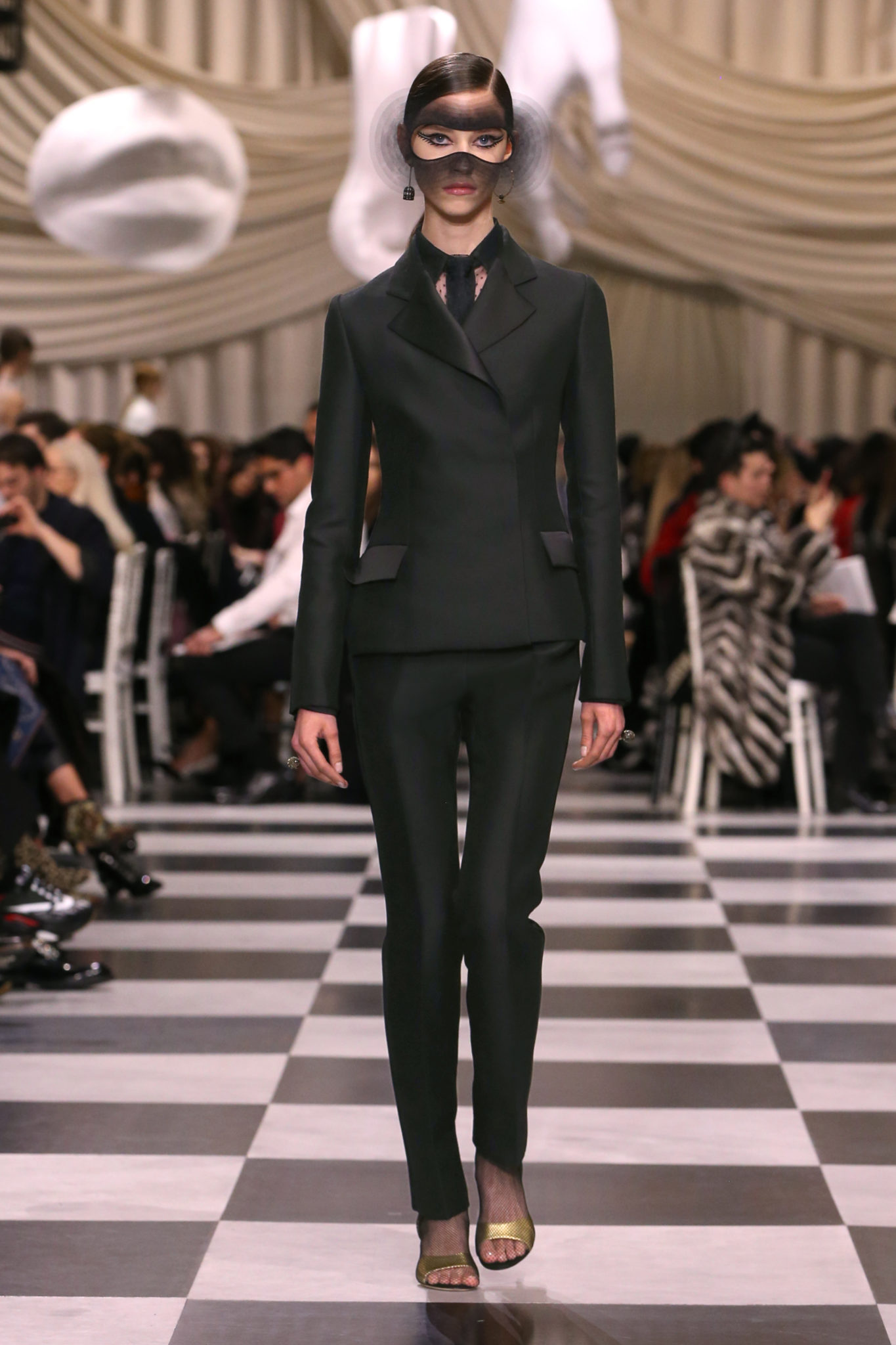 L’histoire de la haute couture est liée à l’histoire de l’art moderne. Le couturier est un créateur à part entière, et le mot « atelier » désigne aussi bien le lieu d’expression de l’artiste que celui du couturier. Mais le véritable atelier de l’artiste demeure son esprit. C’est dans cette dimension, en équilibre entre rêve et réalité, entre imagination et réalisation, que Maria Grazia Chiuri, la Directrice Artistique des collections femme de la Maison, mène ses recherches et ses travaux d’exploration. Parce que la haute couture incarne le rêve de la mode. C’est un lieu où il est possible d’évoluer librement pour expérimenter des techniques, des matières et des formes. S’immerger au cœur du mouvement surréaliste lui a permis d’apporter un souffle imaginatif à cette collection de haute couture printemps-été 2018, pour un dépaysement et un renversement optique permanent.Le surréalisme touche également aux mots, aux textes évocateurs qui ont guidé Maria Grazia Chiuri dans la création d’une collection principalement en noir et blanc, parsemée d’illusions et de surprises.Ne jamais se fier à la première impression… Ainsi, les grands plis de la robe du soir blanche bordés de noir s’ouvrent comme des pages, à la manière d’un livre ; la cage, motif récurrent des œuvres surréalistes, est transfigurée en un réseau de tissu tubulaire noir qui enserre le corps et souligne les jeux de transparence, tandis qu’un filet de pêche en fils d’argent se mêle à la densité du velours. Mais c’est avant tout le charisme de Leonor Fini qui définit l’attitude stricte et radicale de la collection. Leonor Fini qui, après avoir quitté l’Italie pour Paris, avait, à l’époque, organisé sa première exposition précisément dans la galerie de Christian Dior, avec qui elle s’était liée d’amitié. Lors de ses apparitions fantasmagoriques, elle portait souvent des créations Dior. Elle était l’incarnation de l’idée, alors révolutionnaire, qu’il faut toujours rester indépendante et se réinventer soi-même, représentant ainsi tout le champ des réalités possibles. Elle utilisait les vêtements pour se définir et se mettre en scène, pour s’affirmer, aussi bien en public qu’en privé : influente, stricte et élégante, dans des poses empruntées aux portraits masculins de la Renaissance, dans une interaction continue entre vie et œuvre d’art, mêlant le naturel et l’artificiel. C’est dans cette dimension suspendue entre rêve et réalité qu’évoluent les merveilles de la haute couture. Il en va de même pour les tenues de jour, dont Christian Dior a su réinterpréter les formes, notamment en utilisant des tissus masculins, et desquelles Maria Grazia Chiuri s’inspire pour proposer une série de tailleurs. Ceux-ci reprennent les courbes de Dior pour les remettre au goût du jour et s’accordent avec des jupes aux multiples contrastes. Fidèles à la tradition surréaliste du fétichisme du corps déconstruit, les accessoires marquent leur présence d’une manière fantastique : un bas résille voile une sandale, des gants enserrent une cheville. C’est dans cette manière de voir et de se faire voir, dans ce regard plongé dans l’inconscient et porté sur le monde que Maria Grazia Chiuri marie broderies et merveilles. Des ornements précieux et délicats qui, sur une robe habitée par une fantasmagorie flamboyante de plumes de paon, deviennent des yeux qui scrutent et expriment le mystère, mais aussi la puissance de la spiritualité des femmes d’aujourd’hui.