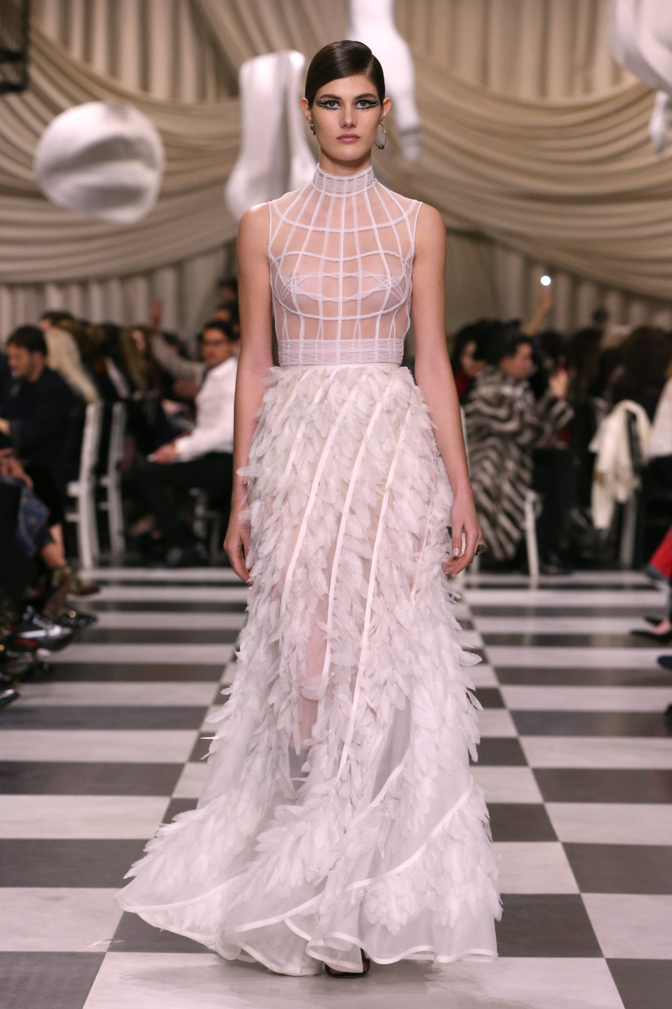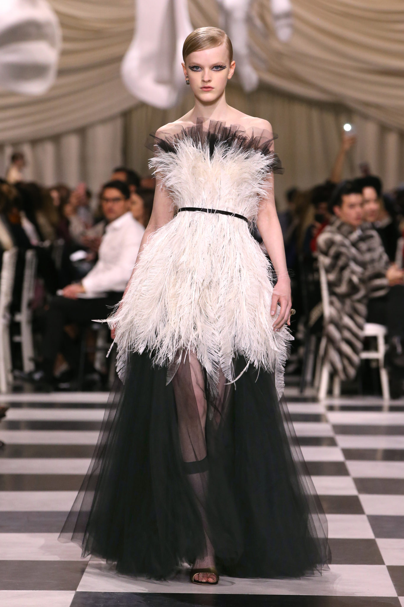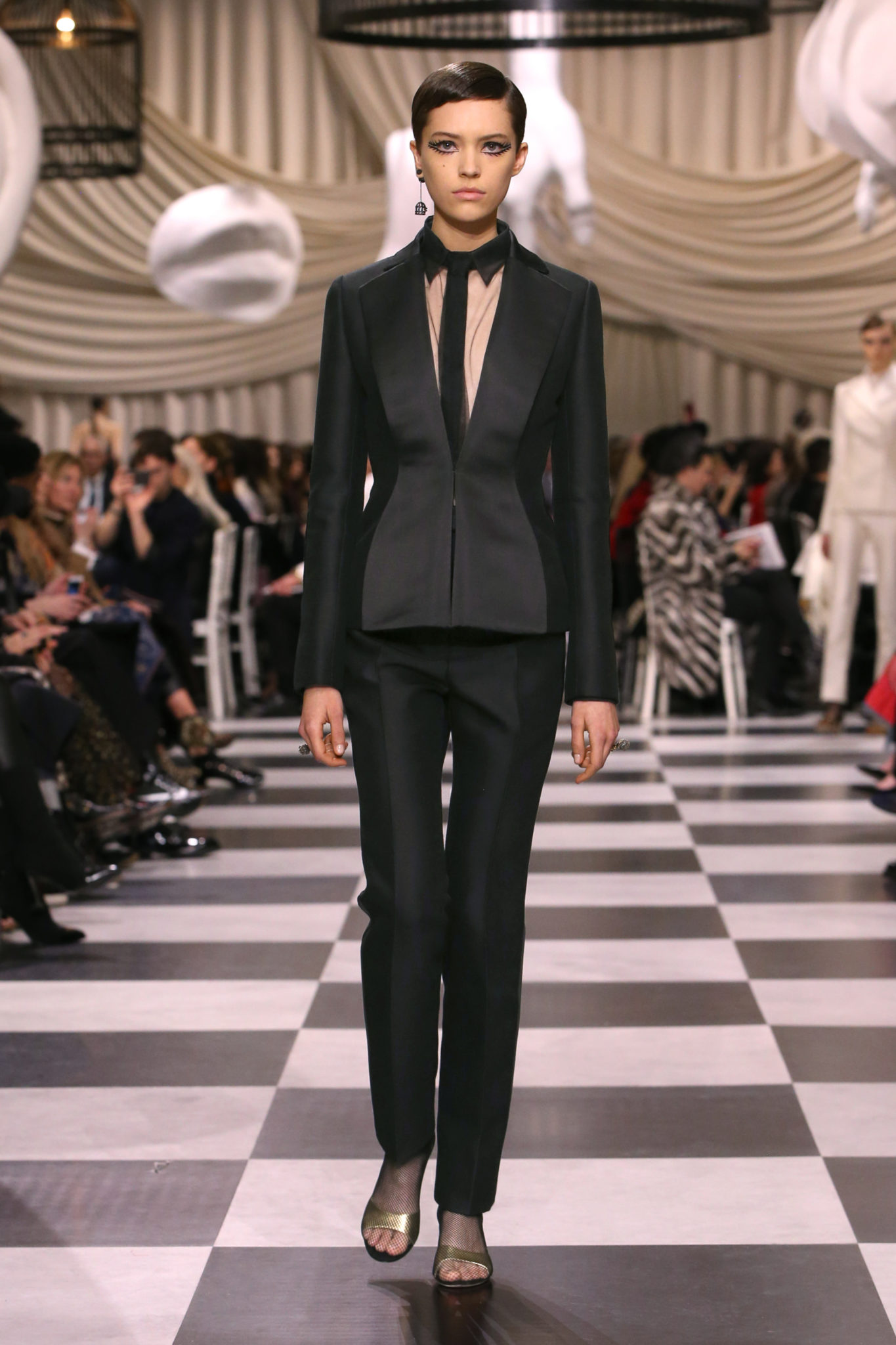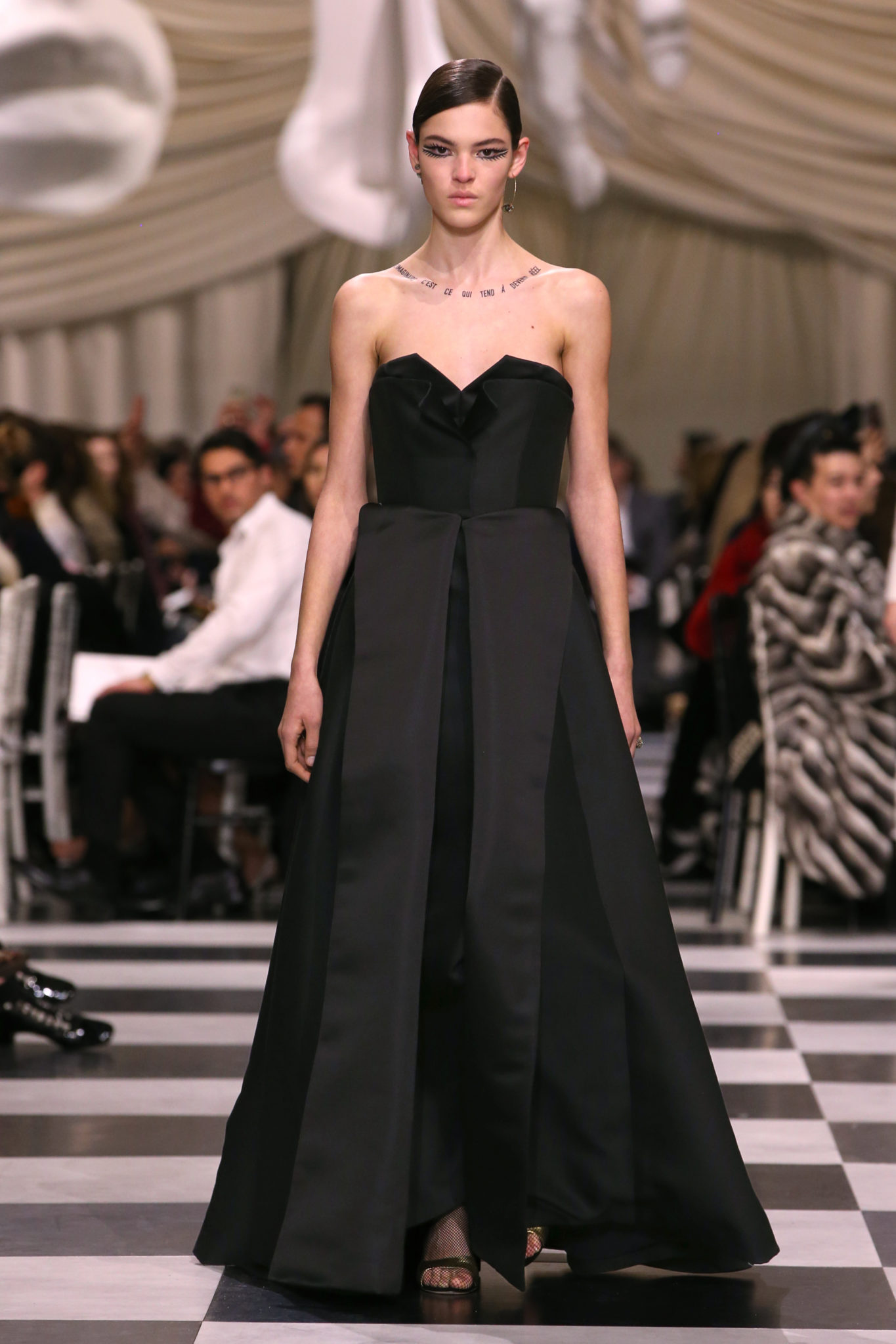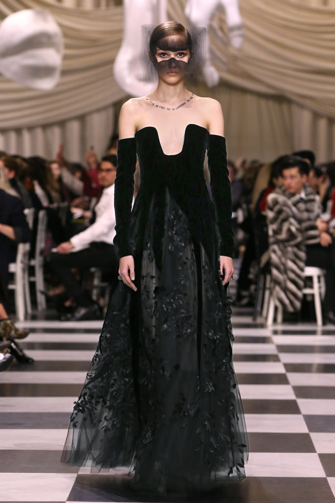 L’histoire de la haute couture est liée à l’histoire de l’art moderne. Le couturier est un créateur à part entière, et le mot « atelier » désigne aussi bien le lieu d’expression de l’artiste que celui du couturier. Mais le véritable atelier de l’artiste demeure son esprit. C’est dans cette dimension, en équilibre entre rêve et réalité, entre imagination et réalisation, que Maria Grazia Chiuri, la Directrice Artistique des collections femme de la Maison, mène ses recherches et ses travaux d’exploration. Parce que la haute couture incarne le rêve de la mode. C’est un lieu où il est possible d’évoluer librement pour expérimenter des techniques, des matières et des formes. S’immerger au cœur du mouvement surréaliste lui a permis d’apporter un souffle imaginatif à cette collection de haute couture printemps-été 2018, pour un dépaysement et un renversement optique permanent.Le surréalisme touche également aux mots, aux textes évocateurs qui ont guidé Maria Grazia Chiuri dans la création d’une collection principalement en noir et blanc, parsemée d’illusions et de surprises.Ne jamais se fier à la première impression… Ainsi, les grands plis de la robe du soir blanche bordés de noir s’ouvrent comme des pages, à la manière d’un livre ; la cage, motif récurrent des œuvres surréalistes, est transfigurée en un réseau de tissu tubulaire noir qui enserre le corps et souligne les jeux de transparence, tandis qu’un filet de pêche en fils d’argent se mêle à la densité du velours. Mais c’est avant tout le charisme de Leonor Fini qui définit l’attitude stricte et radicale de la collection. Leonor Fini qui, après avoir quitté l’Italie pour Paris, avait, à l’époque, organisé sa première exposition précisément dans la galerie de Christian Dior, avec qui elle s’était liée d’amitié. Lors de ses apparitions fantasmagoriques, elle portait souvent des créations Dior. Elle était l’incarnation de l’idée, alors révolutionnaire, qu’il faut toujours rester indépendante et se réinventer soi-même, représentant ainsi tout le champ des réalités possibles. Elle utilisait les vêtements pour se définir et se mettre en scène, pour s’affirmer, aussi bien en public qu’en privé : influente, stricte et élégante, dans des poses empruntées aux portraits masculins de la Renaissance, dans une interaction continue entre vie et œuvre d’art, mêlant le naturel et l’artificiel. C’est dans cette dimension suspendue entre rêve et réalité qu’évoluent les merveilles de la haute couture. Il en va de même pour les tenues de jour, dont Christian Dior a su réinterpréter les formes, notamment en utilisant des tissus masculins, et desquelles Maria Grazia Chiuri s’inspire pour proposer une série de tailleurs. Ceux-ci reprennent les courbes de Dior pour les remettre au goût du jour et s’accordent avec des jupes aux multiples contrastes. Fidèles à la tradition surréaliste du fétichisme du corps déconstruit, les accessoires marquent leur présence d’une manière fantastique : un bas résille voile une sandale, des gants enserrent une cheville. C’est dans cette manière de voir et de se faire voir, dans ce regard plongé dans l’inconscient et porté sur le monde que Maria Grazia Chiuri marie broderies et merveilles. Des ornements précieux et délicats qui, sur une robe habitée par une fantasmagorie flamboyante de plumes de paon, deviennent des yeux qui scrutent et expriment le mystère, mais aussi la puissance de la spiritualité des femmes d’aujourd’hui.