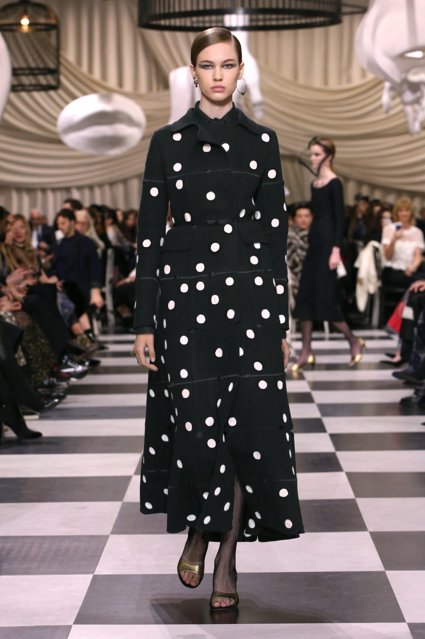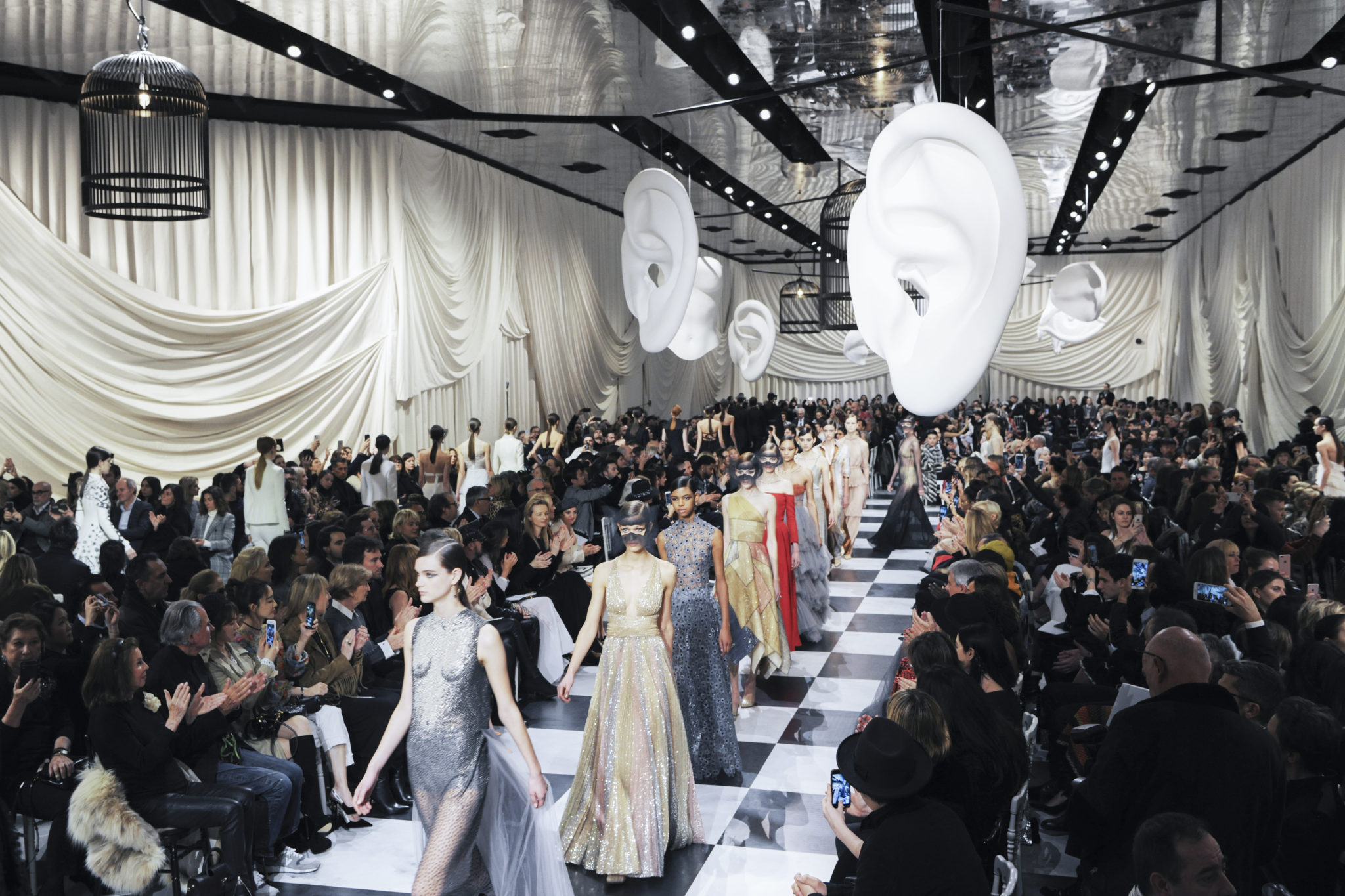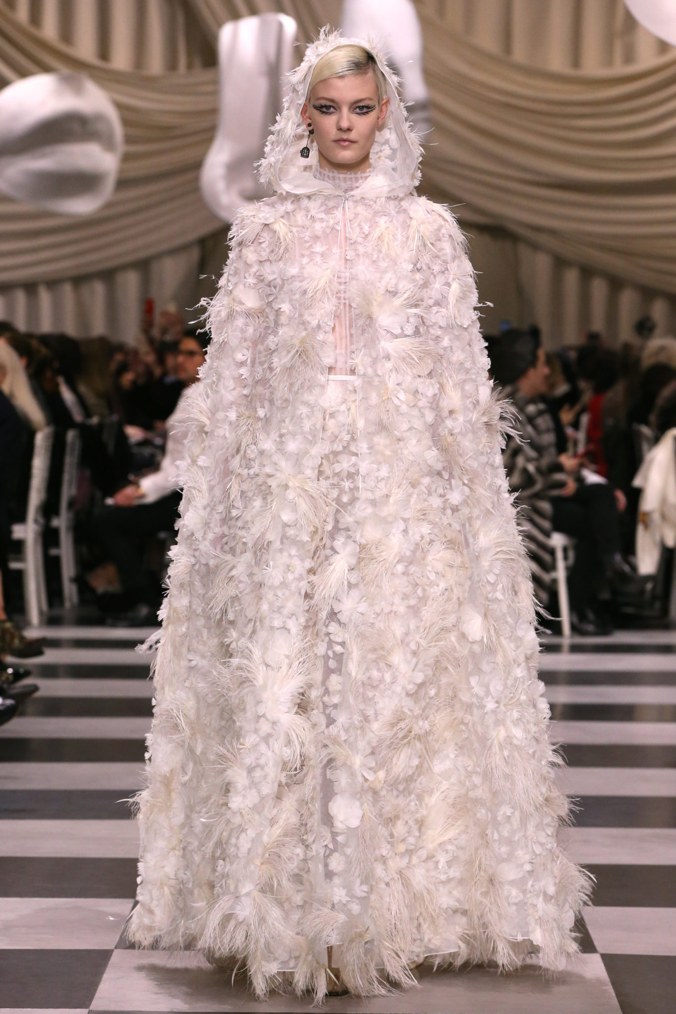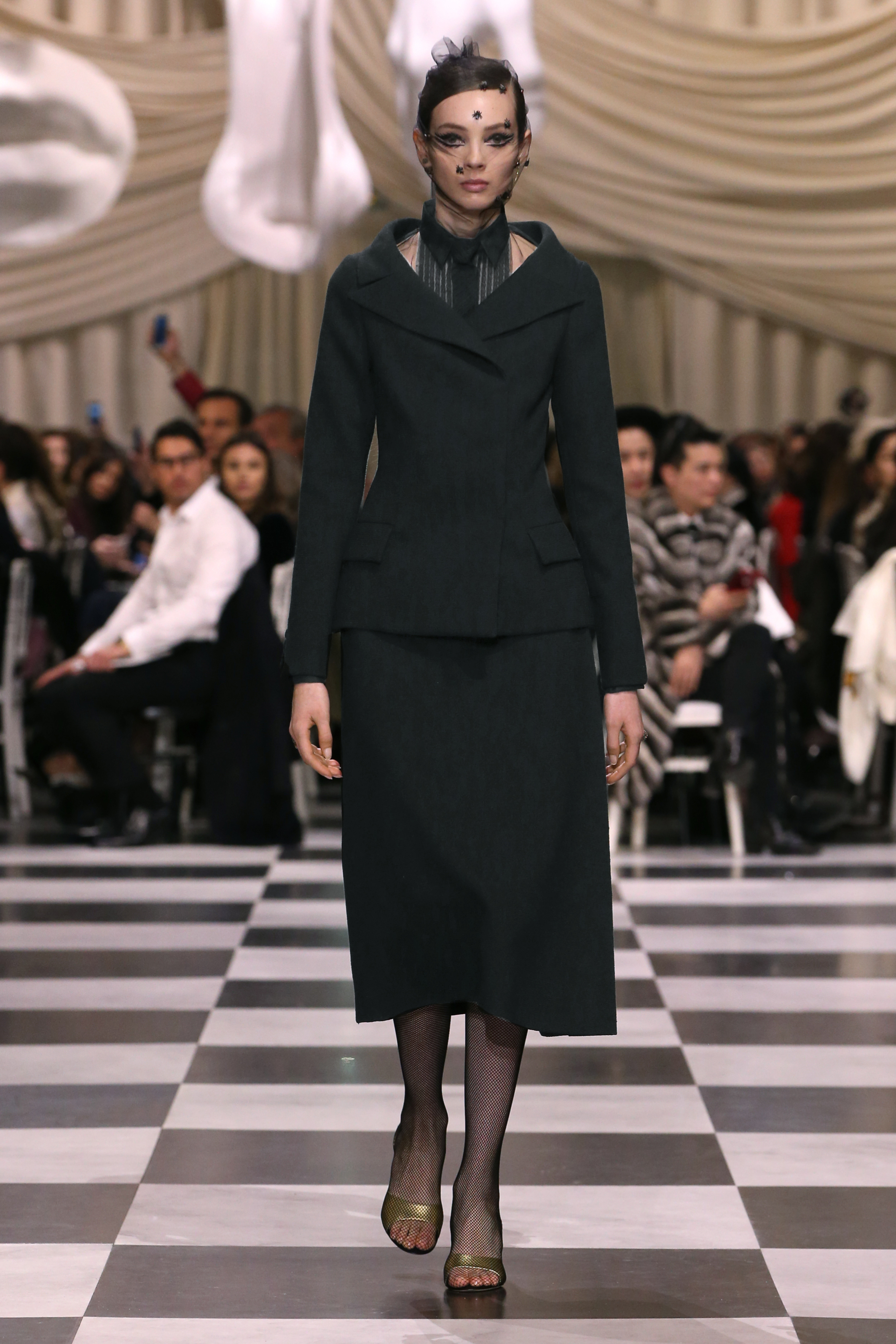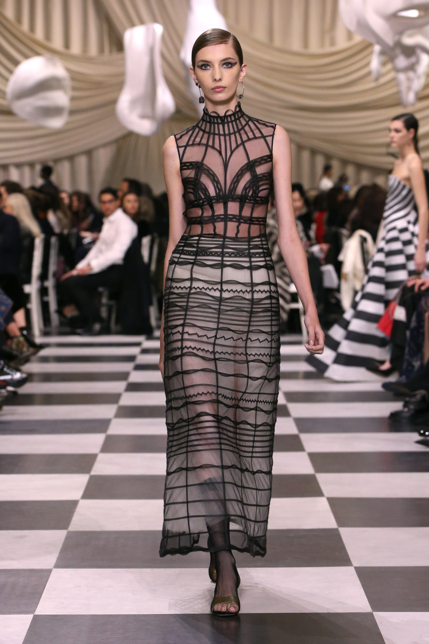 L’histoire de la haute couture est liée à l’histoire de l’art moderne. Le couturier est un créateur à part entière, et le mot « atelier » désigne aussi bien le lieu d’expression de l’artiste que celui du couturier. Mais le véritable atelier de l’artiste demeure son esprit. C’est dans cette dimension, en équilibre entre rêve et réalité, entre imagination et réalisation, que Maria Grazia Chiuri, la Directrice Artistique des collections femme de la Maison, mène ses recherches et ses travaux d’exploration. Parce que la haute couture incarne le rêve de la mode. C’est un lieu où il est possible d’évoluer librement pour expérimenter des techniques, des matières et des formes. S’immerger au cœur du mouvement surréaliste lui a permis d’apporter un souffle imaginatif à cette collection de haute couture printemps-été 2018, pour un dépaysement et un renversement optique permanent.Le surréalisme touche également aux mots, aux textes évocateurs qui ont guidé Maria Grazia Chiuri dans la création d’une collection principalement en noir et blanc, parsemée d’illusions et de surprises.Ne jamais se fier à la première impression… Ainsi, les grands plis de la robe du soir blanche bordés de noir s’ouvrent comme des pages, à la manière d’un livre ; la cage, motif récurrent des œuvres surréalistes, est transfigurée en un réseau de tissu tubulaire noir qui enserre le corps et souligne les jeux de transparence, tandis qu’un filet de pêche en fils d’argent se mêle à la densité du velours. Mais c’est avant tout le charisme de Leonor Fini qui définit l’attitude stricte et radicale de la collection. Leonor Fini qui, après avoir quitté l’Italie pour Paris, avait, à l’époque, organisé sa première exposition précisément dans la galerie de Christian Dior, avec qui elle s’était liée d’amitié. Lors de ses apparitions fantasmagoriques, elle portait souvent des créations Dior. Elle était l’incarnation de l’idée, alors révolutionnaire, qu’il faut toujours rester indépendante et se réinventer soi-même, représentant ainsi tout le champ des réalités possibles. Elle utilisait les vêtements pour se définir et se mettre en scène, pour s’affirmer, aussi bien en public qu’en privé : influente, stricte et élégante, dans des poses empruntées aux portraits masculins de la Renaissance, dans une interaction continue entre vie et œuvre d’art, mêlant le naturel et l’artificiel. C’est dans cette dimension suspendue entre rêve et réalité qu’évoluent les merveilles de la haute couture. Il en va de même pour les tenues de jour, dont Christian Dior a su réinterpréter les formes, notamment en utilisant des tissus masculins, et desquelles Maria Grazia Chiuri s’inspire pour proposer une série de tailleurs. Ceux-ci reprennent les courbes de Dior pour les remettre au goût du jour et s’accordent avec des jupes aux multiples contrastes. Fidèles à la tradition surréaliste du fétichisme du corps déconstruit, les accessoires marquent leur présence d’une manière fantastique : un bas résille voile une sandale, des gants enserrent une cheville. C’est dans cette manière de voir et de se faire voir, dans ce regard plongé dans l’inconscient et porté sur le monde que Maria Grazia Chiuri marie broderies et merveilles. Des ornements précieux et délicats qui, sur une robe habitée par une fantasmagorie flamboyante de plumes de paon, deviennent des yeux qui scrutent et expriment le mystère, mais aussi la puissance de la spiritualité des femmes d’aujourd’hui.