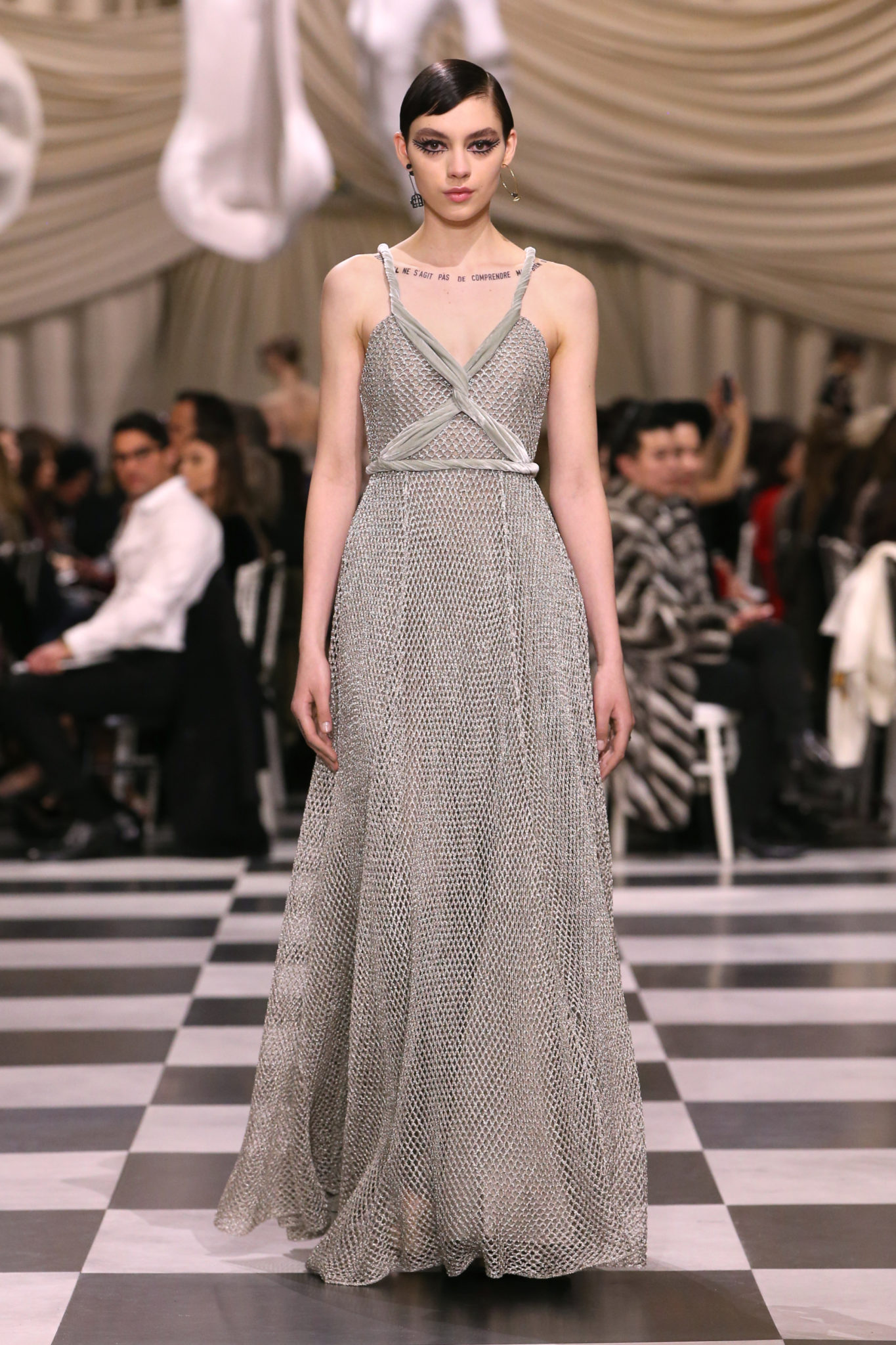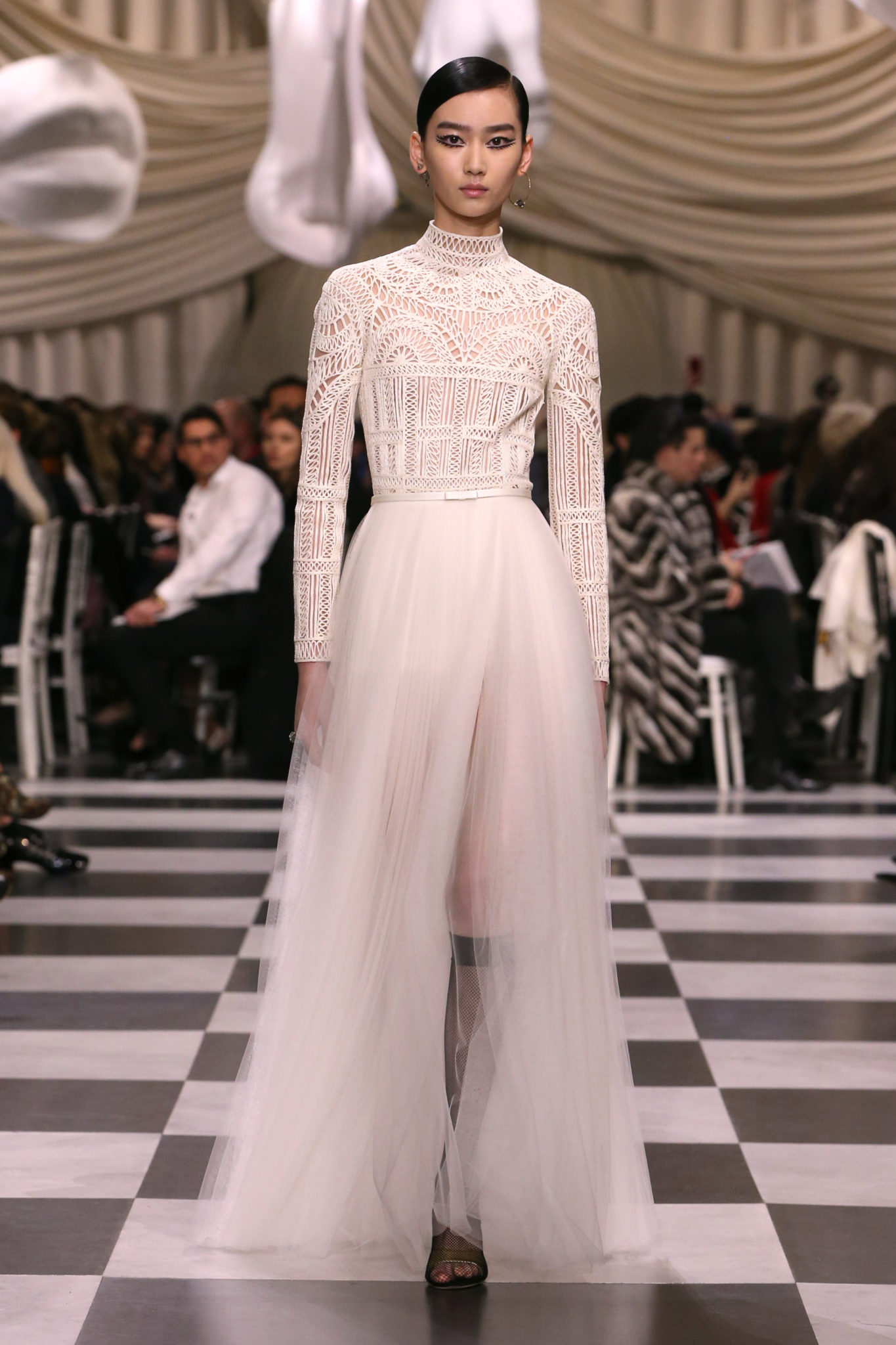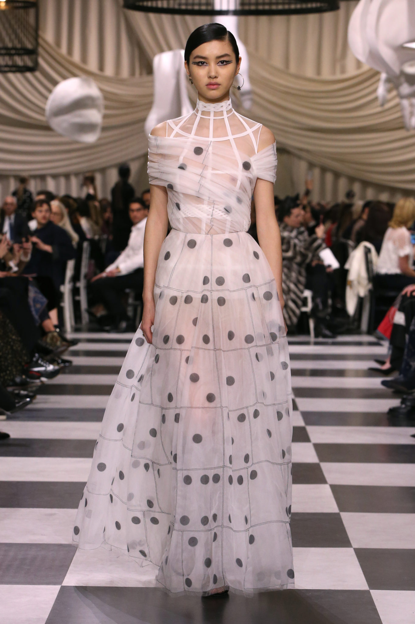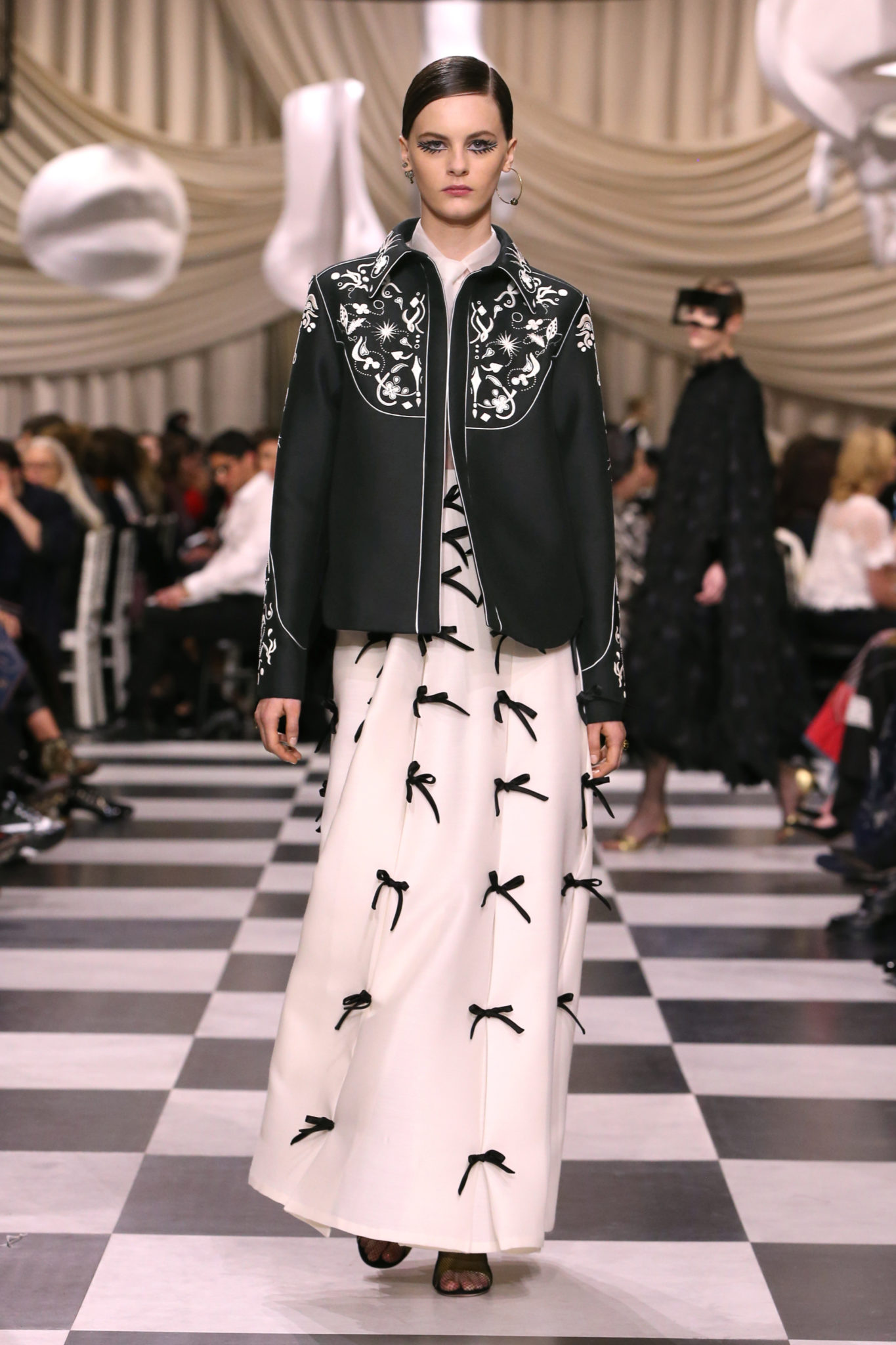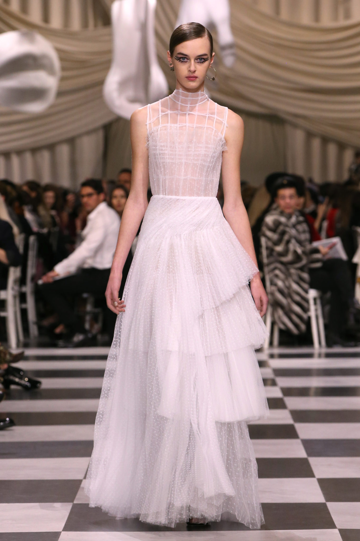 L’histoire de la haute couture est liée à l’histoire de l’art moderne. Le couturier est un créateur à part entière, et le mot « atelier » désigne aussi bien le lieu d’expression de l’artiste que celui du couturier. Mais le véritable atelier de l’artiste demeure son esprit. C’est dans cette dimension, en équilibre entre rêve et réalité, entre imagination et réalisation, que Maria Grazia Chiuri, la Directrice Artistique des collections femme de la Maison, mène ses recherches et ses travaux d’exploration. Parce que la haute couture incarne le rêve de la mode. C’est un lieu où il est possible d’évoluer librement pour expérimenter des techniques, des matières et des formes. S’immerger au cœur du mouvement surréaliste lui a permis d’apporter un souffle imaginatif à cette collection de haute couture printemps-été 2018, pour un dépaysement et un renversement optique permanent.Le surréalisme touche également aux mots, aux textes évocateurs qui ont guidé Maria Grazia Chiuri dans la création d’une collection principalement en noir et blanc, parsemée d’illusions et de surprises.Ne jamais se fier à la première impression… Ainsi, les grands plis de la robe du soir blanche bordés de noir s’ouvrent comme des pages, à la manière d’un livre ; la cage, motif récurrent des œuvres surréalistes, est transfigurée en un réseau de tissu tubulaire noir qui enserre le corps et souligne les jeux de transparence, tandis qu’un filet de pêche en fils d’argent se mêle à la densité du velours. Mais c’est avant tout le charisme de Leonor Fini qui définit l’attitude stricte et radicale de la collection. Leonor Fini qui, après avoir quitté l’Italie pour Paris, avait, à l’époque, organisé sa première exposition précisément dans la galerie de Christian Dior, avec qui elle s’était liée d’amitié. Lors de ses apparitions fantasmagoriques, elle portait souvent des créations Dior. Elle était l’incarnation de l’idée, alors révolutionnaire, qu’il faut toujours rester indépendante et se réinventer soi-même, représentant ainsi tout le champ des réalités possibles. Elle utilisait les vêtements pour se définir et se mettre en scène, pour s’affirmer, aussi bien en public qu’en privé : influente, stricte et élégante, dans des poses empruntées aux portraits masculins de la Renaissance, dans une interaction continue entre vie et œuvre d’art, mêlant le naturel et l’artificiel. C’est dans cette dimension suspendue entre rêve et réalité qu’évoluent les merveilles de la haute couture. Il en va de même pour les tenues de jour, dont Christian Dior a su réinterpréter les formes, notamment en utilisant des tissus masculins, et desquelles Maria Grazia Chiuri s’inspire pour proposer une série de tailleurs. Ceux-ci reprennent les courbes de Dior pour les remettre au goût du jour et s’accordent avec des jupes aux multiples contrastes. Fidèles à la tradition surréaliste du fétichisme du corps déconstruit, les accessoires marquent leur présence d’une manière fantastique : un bas résille voile une sandale, des gants enserrent une cheville. C’est dans cette manière de voir et de se faire voir, dans ce regard plongé dans l’inconscient et porté sur le monde que Maria Grazia Chiuri marie broderies et merveilles. Des ornements précieux et délicats qui, sur une robe habitée par une fantasmagorie flamboyante de plumes de paon, deviennent des yeux qui scrutent et expriment le mystère, mais aussi la puissance de la spiritualité des femmes d’aujourd’hui.