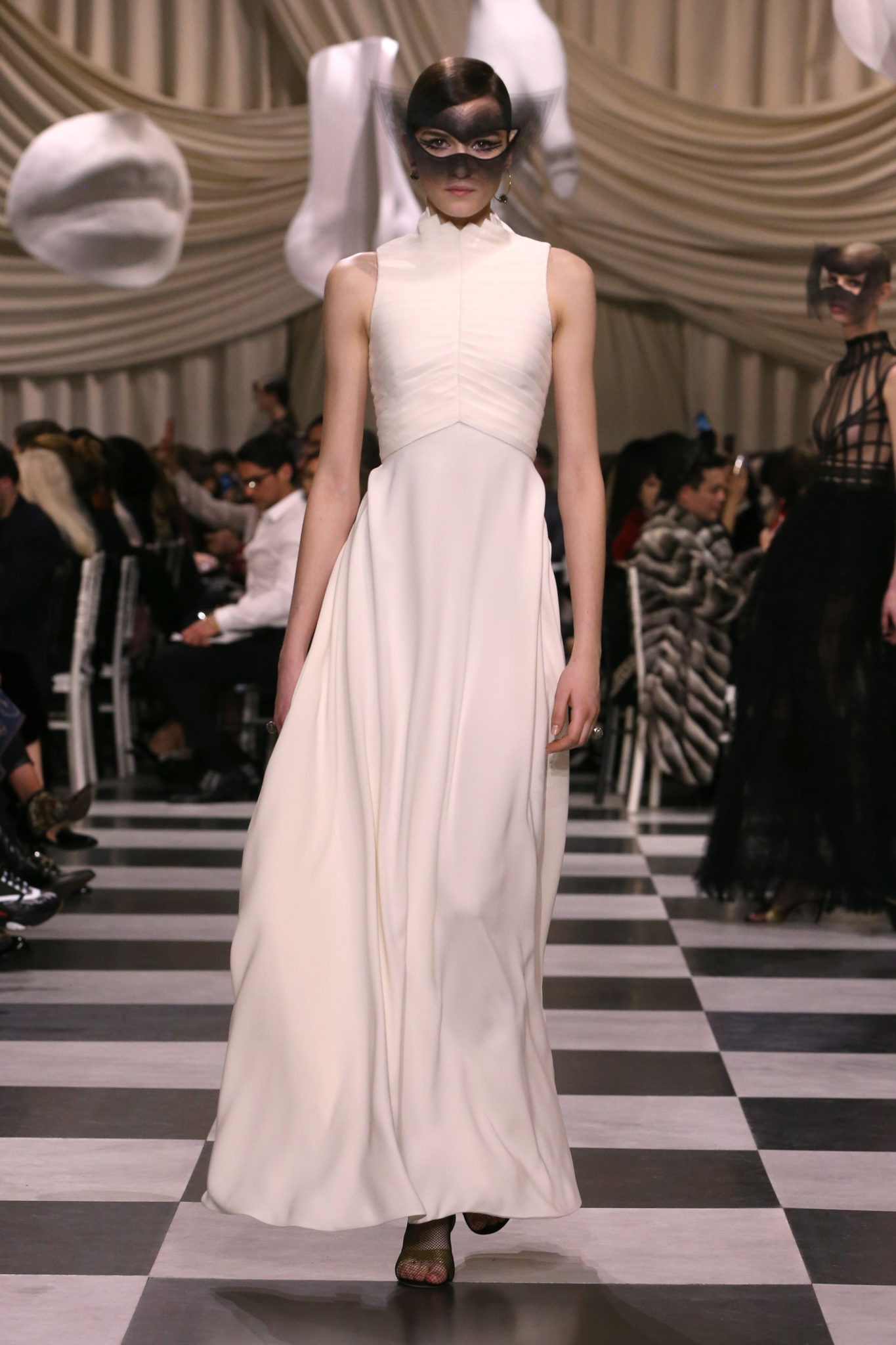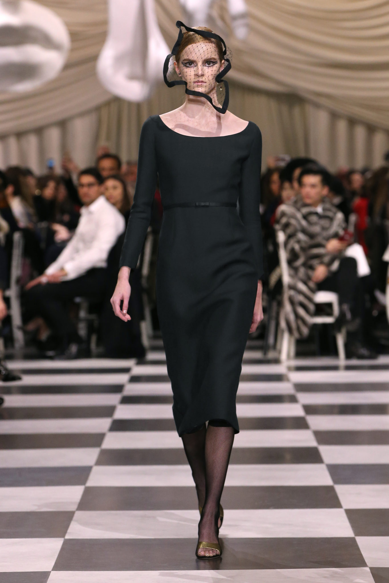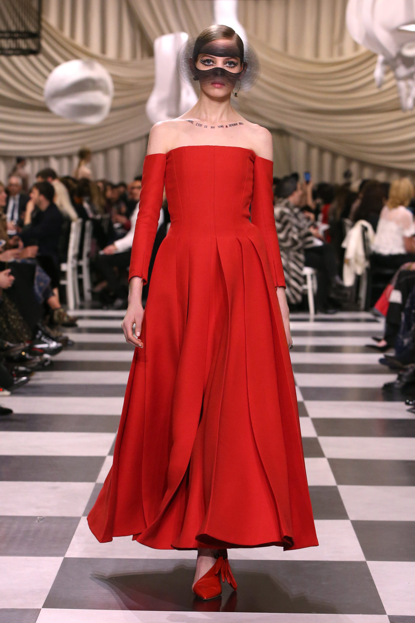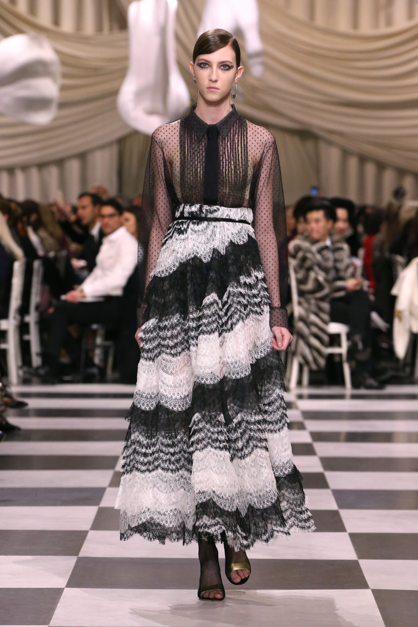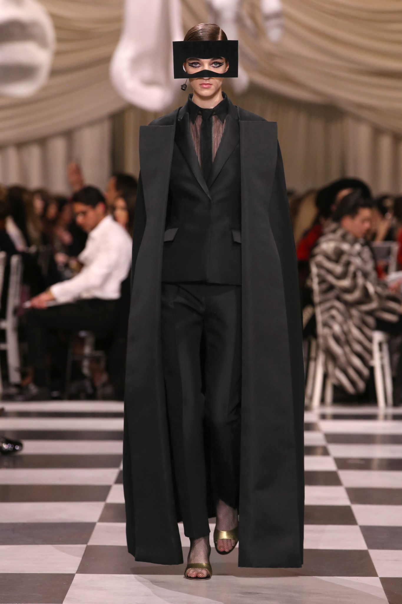 L’histoire de la haute couture est liée à l’histoire de l’art moderne. Le couturier est un créateur à part entière, et le mot « atelier » désigne aussi bien le lieu d’expression de l’artiste que celui du couturier. Mais le véritable atelier de l’artiste demeure son esprit. C’est dans cette dimension, en équilibre entre rêve et réalité, entre imagination et réalisation, que Maria Grazia Chiuri, la Directrice Artistique des collections femme de la Maison, mène ses recherches et ses travaux d’exploration. Parce que la haute couture incarne le rêve de la mode. C’est un lieu où il est possible d’évoluer librement pour expérimenter des techniques, des matières et des formes. S’immerger au cœur du mouvement surréaliste lui a permis d’apporter un souffle imaginatif à cette collection de haute couture printemps-été 2018, pour un dépaysement et un renversement optique permanent.Le surréalisme touche également aux mots, aux textes évocateurs qui ont guidé Maria Grazia Chiuri dans la création d’une collection principalement en noir et blanc, parsemée d’illusions et de surprises.Ne jamais se fier à la première impression… Ainsi, les grands plis de la robe du soir blanche bordés de noir s’ouvrent comme des pages, à la manière d’un livre ; la cage, motif récurrent des œuvres surréalistes, est transfigurée en un réseau de tissu tubulaire noir qui enserre le corps et souligne les jeux de transparence, tandis qu’un filet de pêche en fils d’argent se mêle à la densité du velours. Mais c’est avant tout le charisme de Leonor Fini qui définit l’attitude stricte et radicale de la collection. Leonor Fini qui, après avoir quitté l’Italie pour Paris, avait, à l’époque, organisé sa première exposition précisément dans la galerie de Christian Dior, avec qui elle s’était liée d’amitié. Lors de ses apparitions fantasmagoriques, elle portait souvent des créations Dior. Elle était l’incarnation de l’idée, alors révolutionnaire, qu’il faut toujours rester indépendante et se réinventer soi-même, représentant ainsi tout le champ des réalités possibles. Elle utilisait les vêtements pour se définir et se mettre en scène, pour s’affirmer, aussi bien en public qu’en privé : influente, stricte et élégante, dans des poses empruntées aux portraits masculins de la Renaissance, dans une interaction continue entre vie et œuvre d’art, mêlant le naturel et l’artificiel. C’est dans cette dimension suspendue entre rêve et réalité qu’évoluent les merveilles de la haute couture. Il en va de même pour les tenues de jour, dont Christian Dior a su réinterpréter les formes, notamment en utilisant des tissus masculins, et desquelles Maria Grazia Chiuri s’inspire pour proposer une série de tailleurs. Ceux-ci reprennent les courbes de Dior pour les remettre au goût du jour et s’accordent avec des jupes aux multiples contrastes. Fidèles à la tradition surréaliste du fétichisme du corps déconstruit, les accessoires marquent leur présence d’une manière fantastique : un bas résille voile une sandale, des gants enserrent une cheville. C’est dans cette manière de voir et de se faire voir, dans ce regard plongé dans l’inconscient et porté sur le monde que Maria Grazia Chiuri marie broderies et merveilles. Des ornements précieux et délicats qui, sur une robe habitée par une fantasmagorie flamboyante de plumes de paon, deviennent des yeux qui scrutent et expriment le mystère, mais aussi la puissance de la spiritualité des femmes d’aujourd’hui.