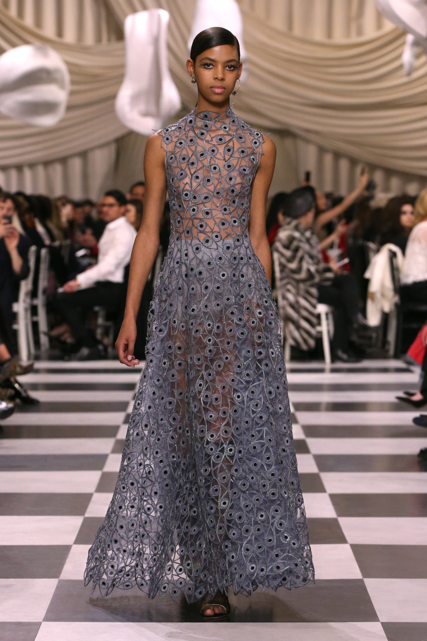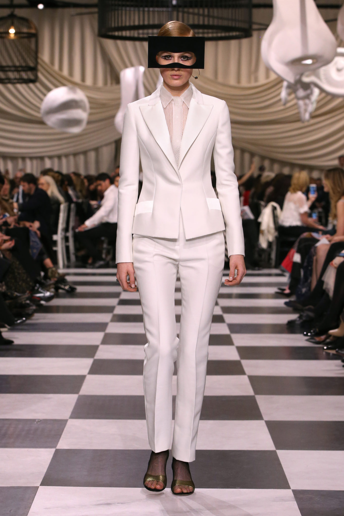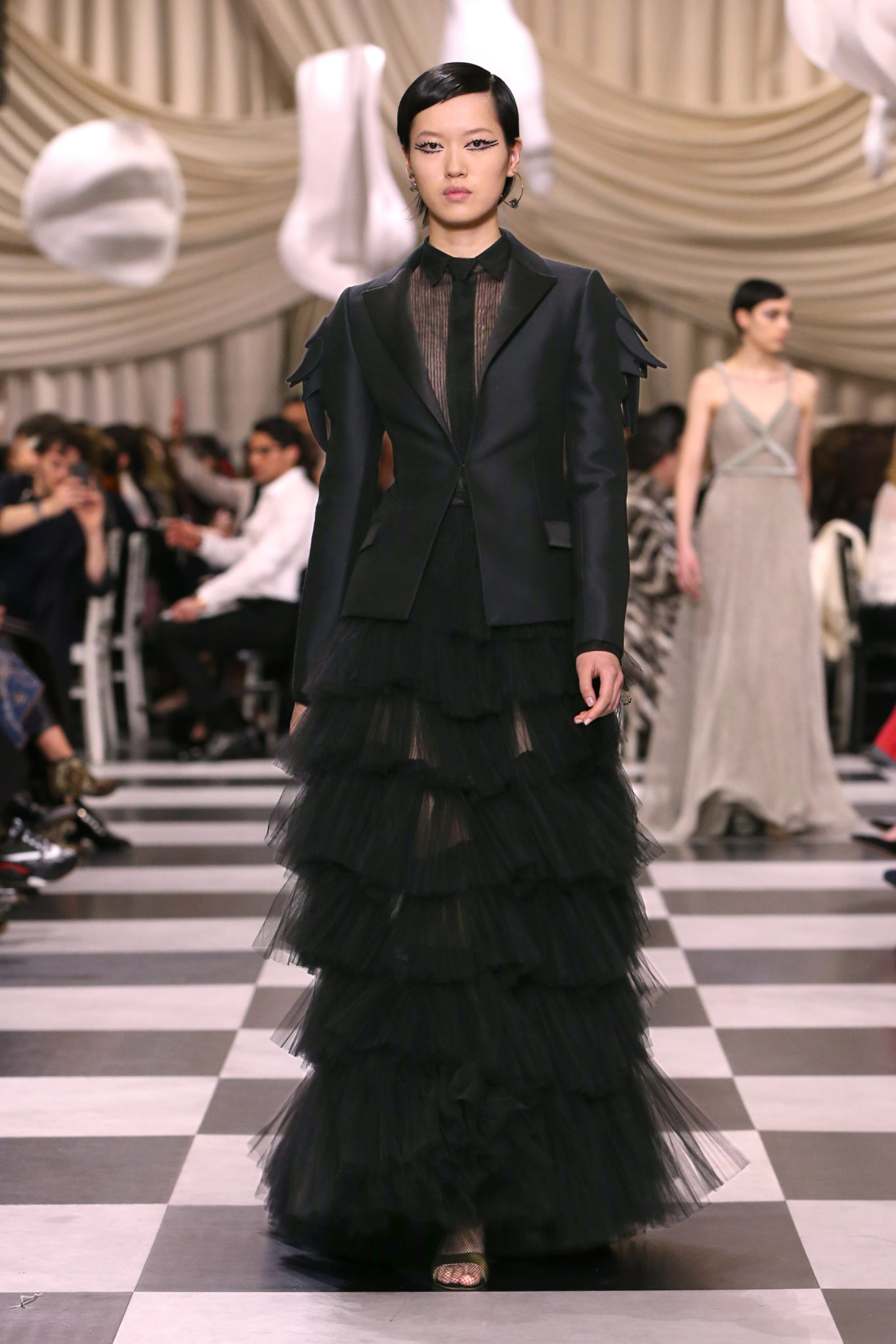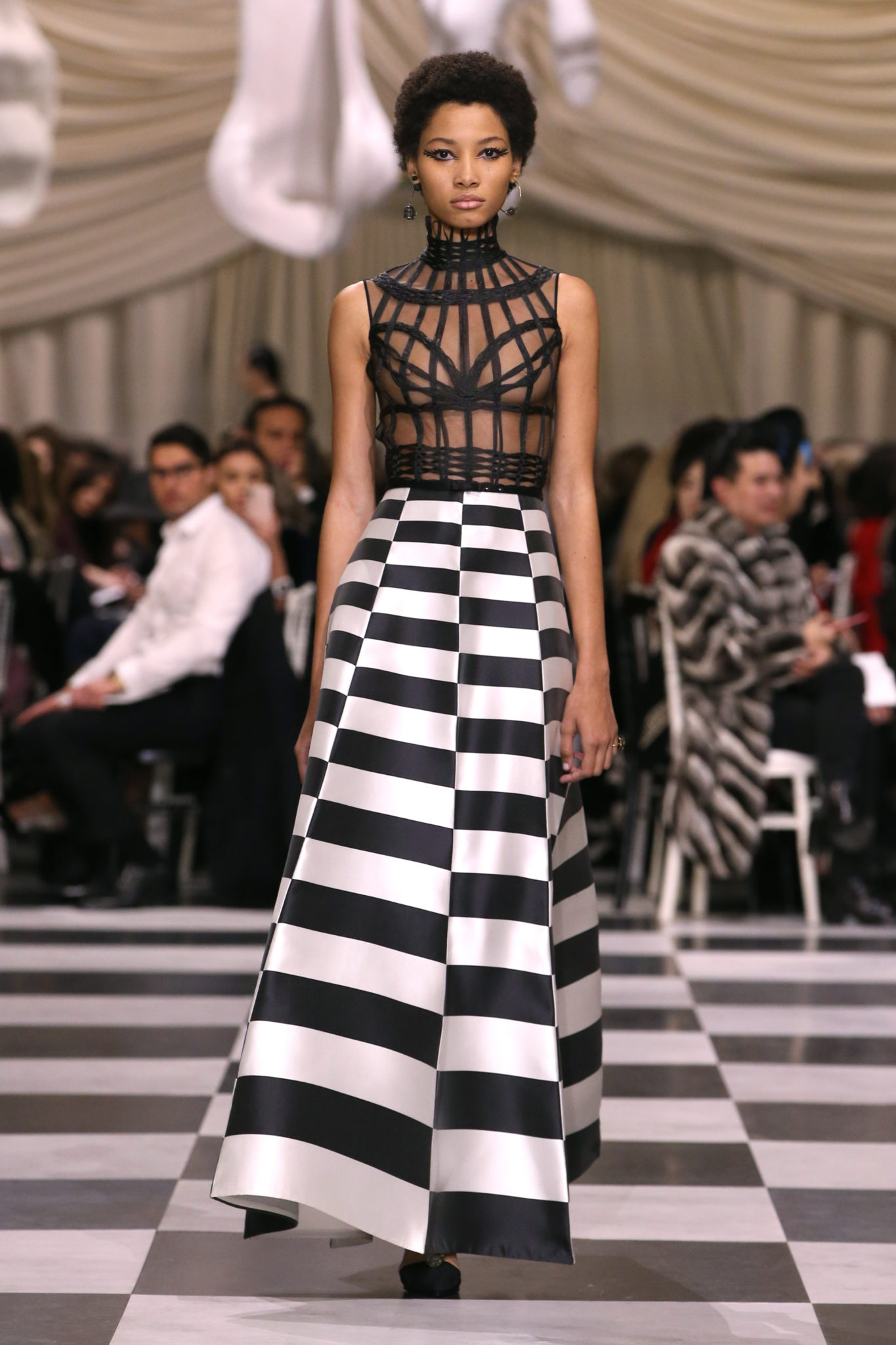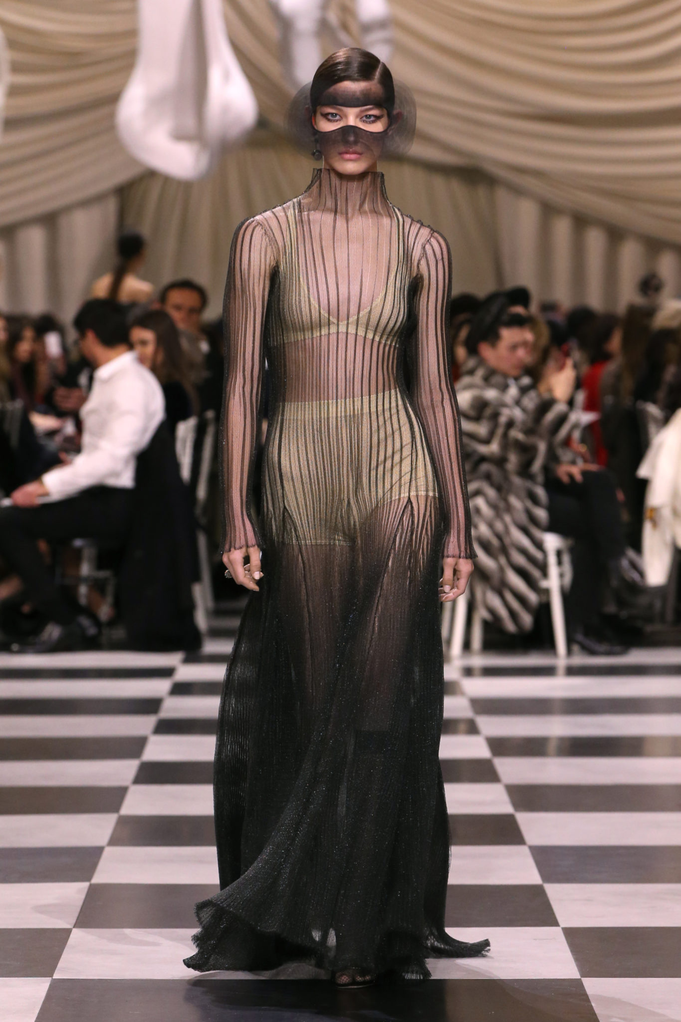L’histoire de la haute couture est liée à l’histoire de l’art moderne. Le couturier est un créateur à part entière, et le mot « atelier » désigne aussi bien le lieu d’expression de l’artiste que celui du couturier. Mais le véritable atelier de l’artiste demeure son esprit. C’est dans cette dimension, en équilibre entre rêve et réalité, entre imagination et réalisation, que Maria Grazia Chiuri, la Directrice Artistique des collections femme de la Maison, mène ses recherches et ses travaux d’exploration. Parce que la haute couture incarne le rêve de la mode. C’est un lieu où il est possible d’évoluer librement pour expérimenter des techniques, des matières et des formes. S’immerger au cœur du mouvement surréaliste lui a permis d’apporter un souffle imaginatif à cette collection de haute couture printemps-été 2018, pour un dépaysement et un renversement optique permanent.Le surréalisme touche également aux mots, aux textes évocateurs qui ont guidé Maria Grazia Chiuri dans la création d’une collection principalement en noir et blanc, parsemée d’illusions et de surprises.Ne jamais se fier à la première impression… Ainsi, les grands plis de la robe du soir blanche bordés de noir s’ouvrent comme des pages, à la manière d’un livre ; la cage, motif récurrent des œuvres surréalistes, est transfigurée en un réseau de tissu tubulaire noir qui enserre le corps et souligne les jeux de transparence, tandis qu’un filet de pêche en fils d’argent se mêle à la densité du velours. Mais c’est avant tout le charisme de Leonor Fini qui définit l’attitude stricte et radicale de la collection. Leonor Fini qui, après avoir quitté l’Italie pour Paris, avait, à l’époque, organisé sa première exposition précisément dans la galerie de Christian Dior, avec qui elle s’était liée d’amitié. Lors de ses apparitions fantasmagoriques, elle portait souvent des créations Dior. Elle était l’incarnation de l’idée, alors révolutionnaire, qu’il faut toujours rester indépendante et se réinventer soi-même, représentant ainsi tout le champ des réalités possibles. Elle utilisait les vêtements pour se définir et se mettre en scène, pour s’affirmer, aussi bien en public qu’en privé : influente, stricte et élégante, dans des poses empruntées aux portraits masculins de la Renaissance, dans une interaction continue entre vie et œuvre d’art, mêlant le naturel et l’artificiel. C’est dans cette dimension suspendue entre rêve et réalité qu’évoluent les merveilles de la haute couture. Il en va de même pour les tenues de jour, dont Christian Dior a su réinterpréter les formes, notamment en utilisant des tissus masculins, et desquelles Maria Grazia Chiuri s’inspire pour proposer une série de tailleurs. Ceux-ci reprennent les courbes de Dior pour les remettre au goût du jour et s’accordent avec des jupes aux multiples contrastes. Fidèles à la tradition surréaliste du fétichisme du corps déconstruit, les accessoires marquent leur présence d’une manière fantastique : un bas résille voile une sandale, des gants enserrent une cheville. C’est dans cette manière de voir et de se faire voir, dans ce regard plongé dans l’inconscient et porté sur le monde que Maria Grazia Chiuri marie broderies et merveilles. Des ornements précieux et délicats qui, sur une robe habitée par une fantasmagorie flamboyante de plumes de paon, deviennent des yeux qui scrutent et expriment le mystère, mais aussi la puissance de la spiritualité des femmes d’aujourd’hui.