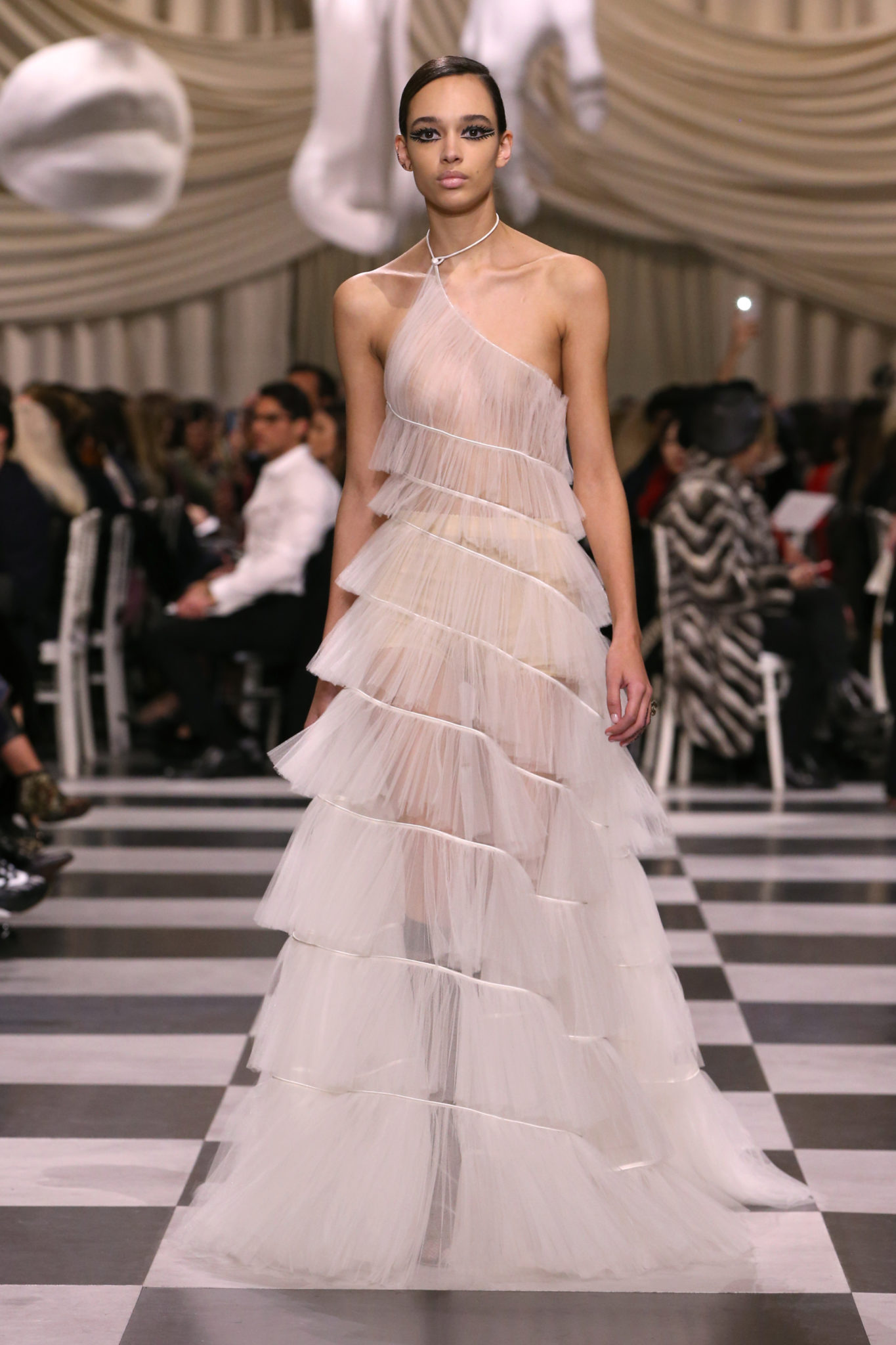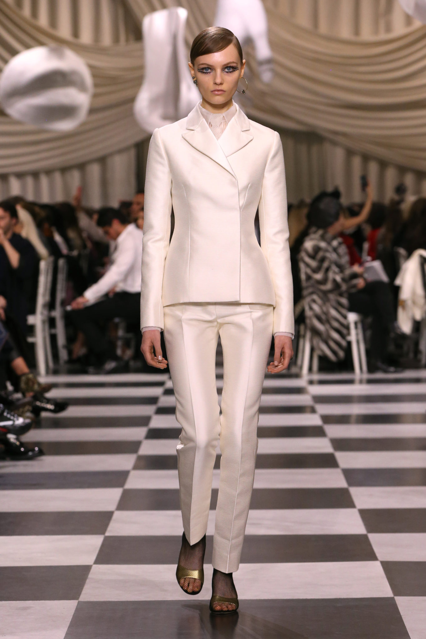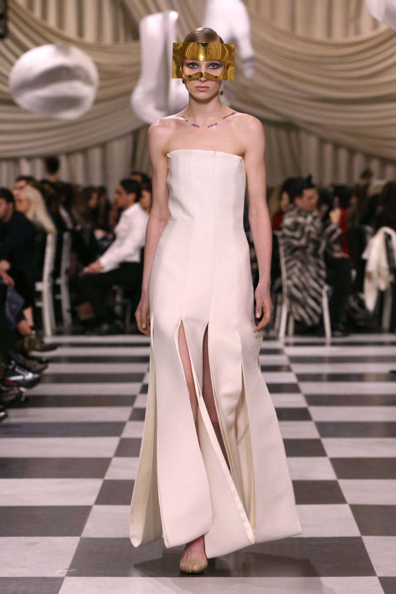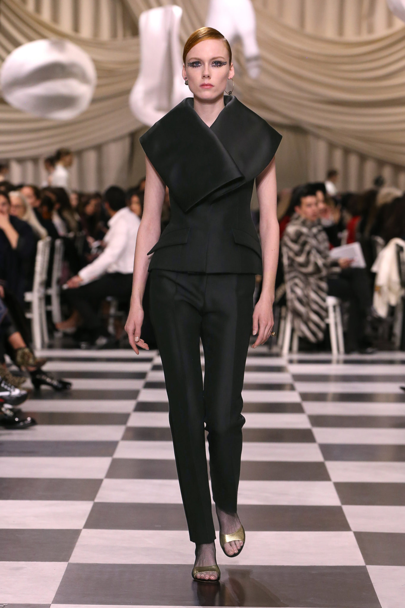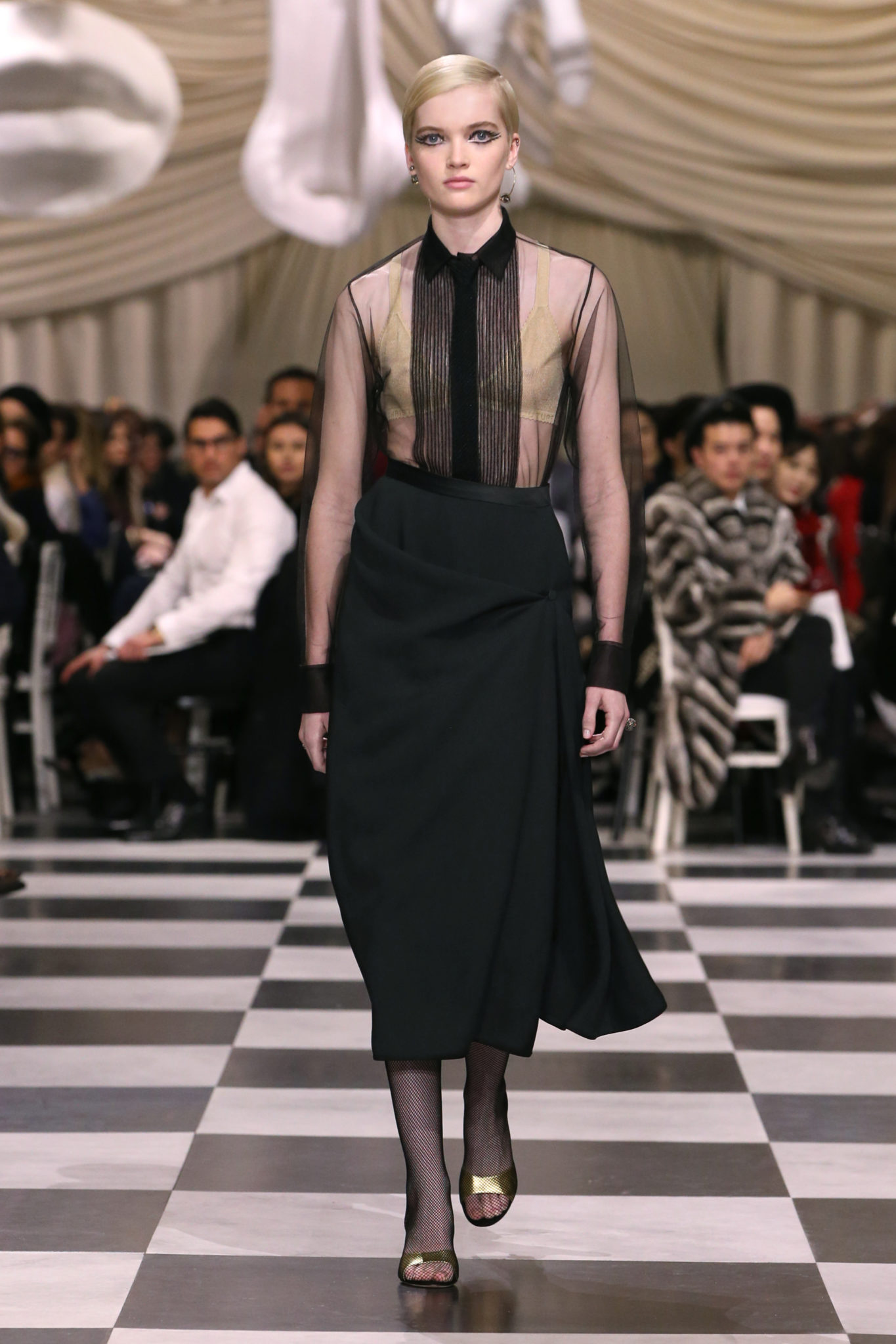 L’histoire de la haute couture est liée à l’histoire de l’art moderne. Le couturier est un créateur à part entière, et le mot « atelier » désigne aussi bien le lieu d’expression de l’artiste que celui du couturier. Mais le véritable atelier de l’artiste demeure son esprit. C’est dans cette dimension, en équilibre entre rêve et réalité, entre imagination et réalisation, que Maria Grazia Chiuri, la Directrice Artistique des collections femme de la Maison, mène ses recherches et ses travaux d’exploration. Parce que la haute couture incarne le rêve de la mode. C’est un lieu où il est possible d’évoluer librement pour expérimenter des techniques, des matières et des formes. S’immerger au cœur du mouvement surréaliste lui a permis d’apporter un souffle imaginatif à cette collection de haute couture printemps-été 2018, pour un dépaysement et un renversement optique permanent.Le surréalisme touche également aux mots, aux textes évocateurs qui ont guidé Maria Grazia Chiuri dans la création d’une collection principalement en noir et blanc, parsemée d’illusions et de surprises.Ne jamais se fier à la première impression… Ainsi, les grands plis de la robe du soir blanche bordés de noir s’ouvrent comme des pages, à la manière d’un livre ; la cage, motif récurrent des œuvres surréalistes, est transfigurée en un réseau de tissu tubulaire noir qui enserre le corps et souligne les jeux de transparence, tandis qu’un filet de pêche en fils d’argent se mêle à la densité du velours. Mais c’est avant tout le charisme de Leonor Fini qui définit l’attitude stricte et radicale de la collection. Leonor Fini qui, après avoir quitté l’Italie pour Paris, avait, à l’époque, organisé sa première exposition précisément dans la galerie de Christian Dior, avec qui elle s’était liée d’amitié. Lors de ses apparitions fantasmagoriques, elle portait souvent des créations Dior. Elle était l’incarnation de l’idée, alors révolutionnaire, qu’il faut toujours rester indépendante et se réinventer soi-même, représentant ainsi tout le champ des réalités possibles. Elle utilisait les vêtements pour se définir et se mettre en scène, pour s’affirmer, aussi bien en public qu’en privé : influente, stricte et élégante, dans des poses empruntées aux portraits masculins de la Renaissance, dans une interaction continue entre vie et œuvre d’art, mêlant le naturel et l’artificiel. C’est dans cette dimension suspendue entre rêve et réalité qu’évoluent les merveilles de la haute couture. Il en va de même pour les tenues de jour, dont Christian Dior a su réinterpréter les formes, notamment en utilisant des tissus masculins, et desquelles Maria Grazia Chiuri s’inspire pour proposer une série de tailleurs. Ceux-ci reprennent les courbes de Dior pour les remettre au goût du jour et s’accordent avec des jupes aux multiples contrastes. Fidèles à la tradition surréaliste du fétichisme du corps déconstruit, les accessoires marquent leur présence d’une manière fantastique : un bas résille voile une sandale, des gants enserrent une cheville. C’est dans cette manière de voir et de se faire voir, dans ce regard plongé dans l’inconscient et porté sur le monde que Maria Grazia Chiuri marie broderies et merveilles. Des ornements précieux et délicats qui, sur une robe habitée par une fantasmagorie flamboyante de plumes de paon, deviennent des yeux qui scrutent et expriment le mystère, mais aussi la puissance de la spiritualité des femmes d’aujourd’hui.