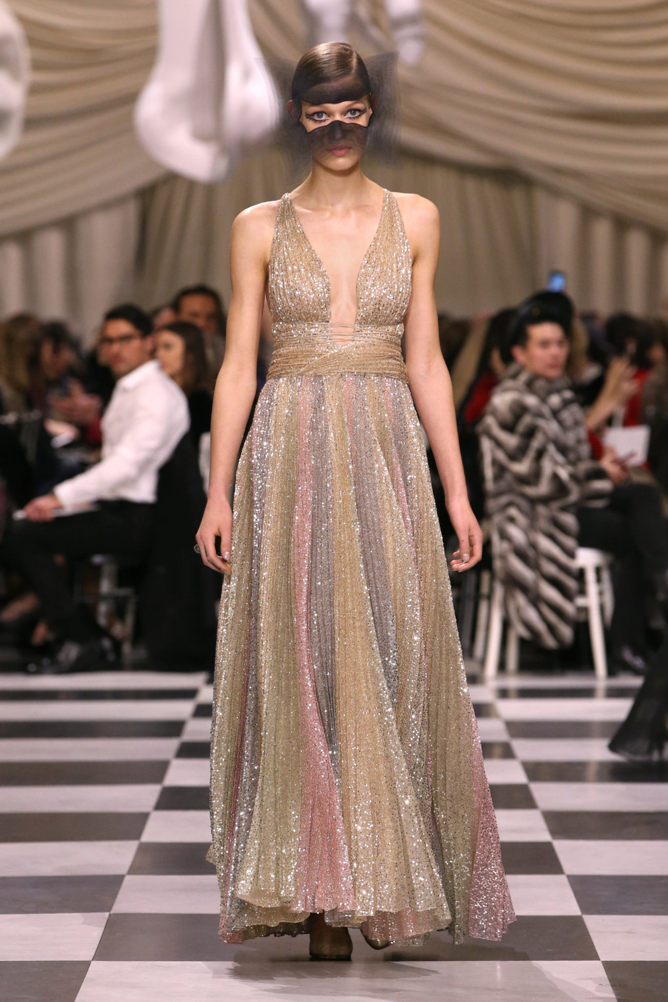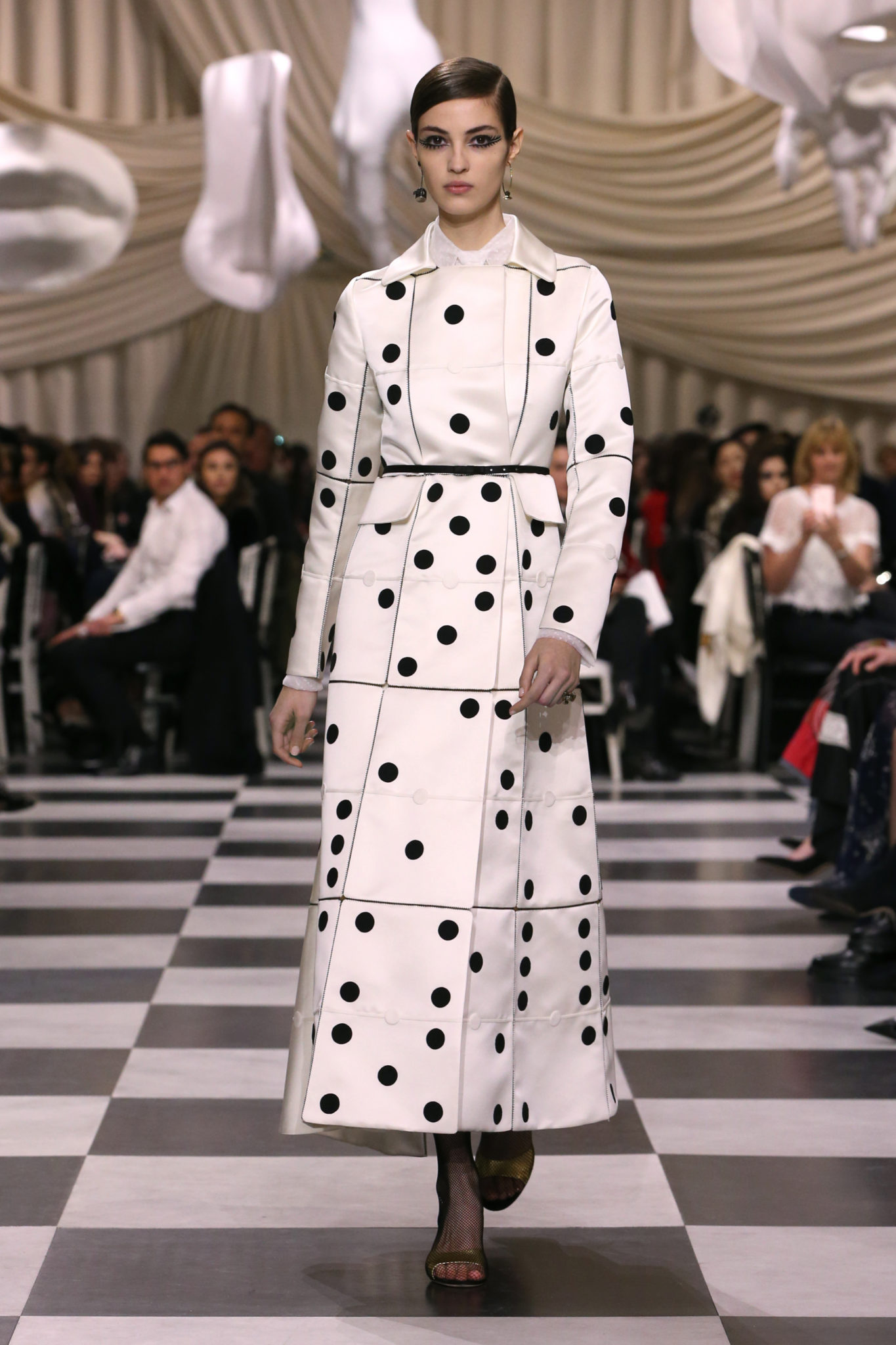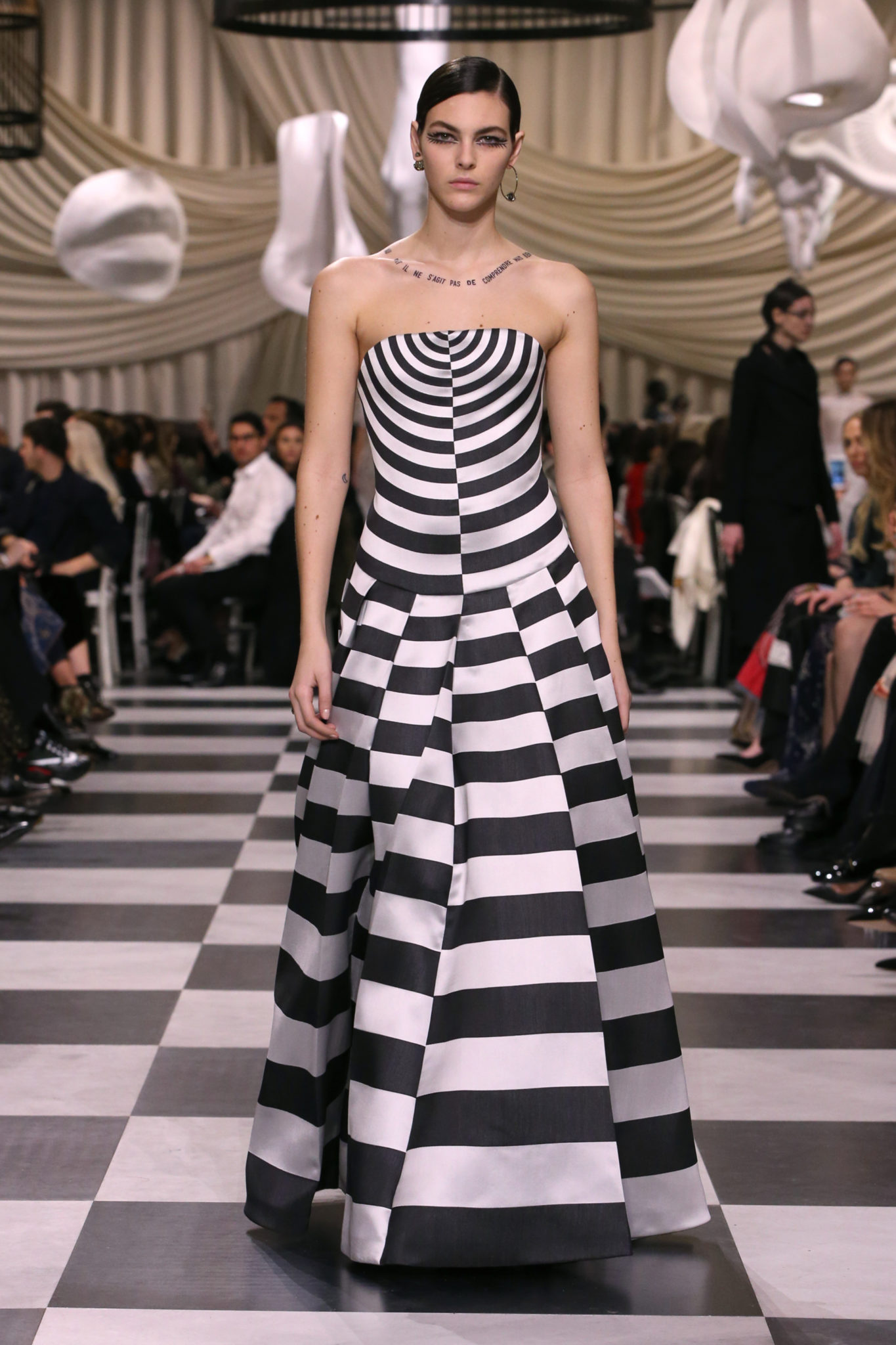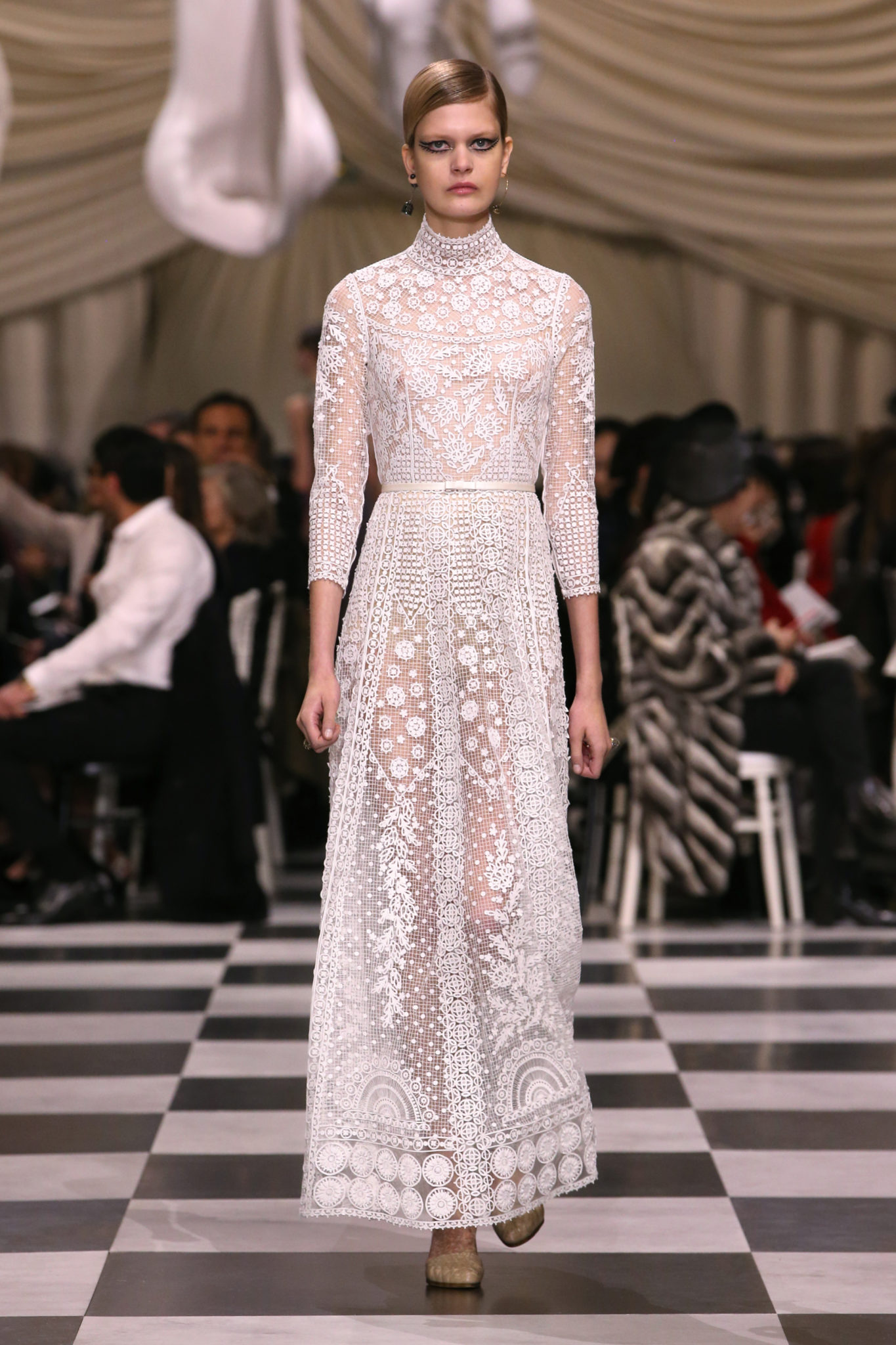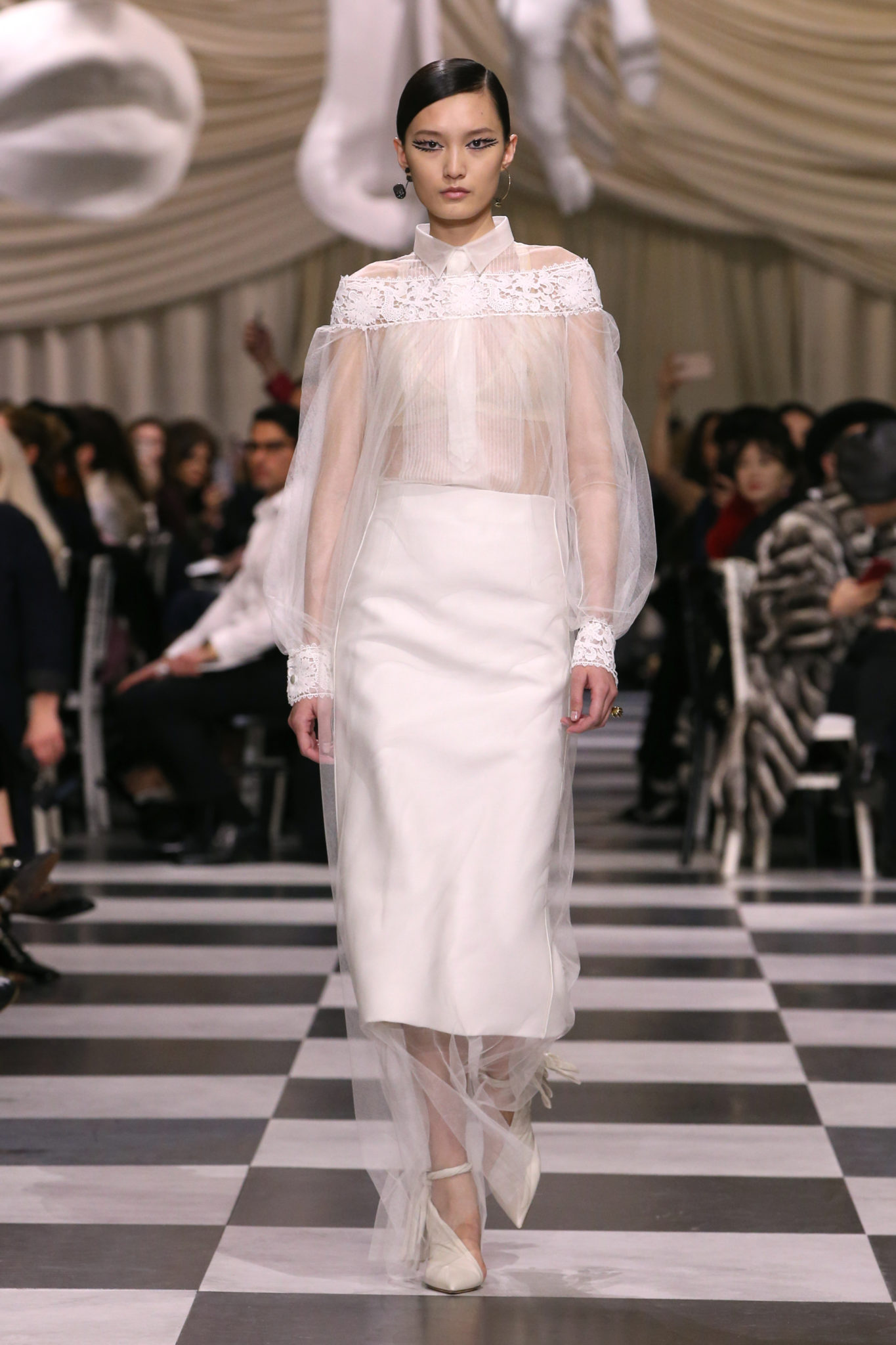 L’histoire de la haute couture est liée à l’histoire de l’art moderne. Le couturier est un créateur à part entière, et le mot « atelier » désigne aussi bien le lieu d’expression de l’artiste que celui du couturier. Mais le véritable atelier de l’artiste demeure son esprit. C’est dans cette dimension, en équilibre entre rêve et réalité, entre imagination et réalisation, que Maria Grazia Chiuri, la Directrice Artistique des collections femme de la Maison, mène ses recherches et ses travaux d’exploration. Parce que la haute couture incarne le rêve de la mode. C’est un lieu où il est possible d’évoluer librement pour expérimenter des techniques, des matières et des formes. S’immerger au cœur du mouvement surréaliste lui a permis d’apporter un souffle imaginatif à cette collection de haute couture printemps-été 2018, pour un dépaysement et un renversement optique permanent.Le surréalisme touche également aux mots, aux textes évocateurs qui ont guidé Maria Grazia Chiuri dans la création d’une collection principalement en noir et blanc, parsemée d’illusions et de surprises.Ne jamais se fier à la première impression… Ainsi, les grands plis de la robe du soir blanche bordés de noir s’ouvrent comme des pages, à la manière d’un livre ; la cage, motif récurrent des œuvres surréalistes, est transfigurée en un réseau de tissu tubulaire noir qui enserre le corps et souligne les jeux de transparence, tandis qu’un filet de pêche en fils d’argent se mêle à la densité du velours. Mais c’est avant tout le charisme de Leonor Fini qui définit l’attitude stricte et radicale de la collection. Leonor Fini qui, après avoir quitté l’Italie pour Paris, avait, à l’époque, organisé sa première exposition précisément dans la galerie de Christian Dior, avec qui elle s’était liée d’amitié. Lors de ses apparitions fantasmagoriques, elle portait souvent des créations Dior. Elle était l’incarnation de l’idée, alors révolutionnaire, qu’il faut toujours rester indépendante et se réinventer soi-même, représentant ainsi tout le champ des réalités possibles. Elle utilisait les vêtements pour se définir et se mettre en scène, pour s’affirmer, aussi bien en public qu’en privé : influente, stricte et élégante, dans des poses empruntées aux portraits masculins de la Renaissance, dans une interaction continue entre vie et œuvre d’art, mêlant le naturel et l’artificiel. C’est dans cette dimension suspendue entre rêve et réalité qu’évoluent les merveilles de la haute couture. Il en va de même pour les tenues de jour, dont Christian Dior a su réinterpréter les formes, notamment en utilisant des tissus masculins, et desquelles Maria Grazia Chiuri s’inspire pour proposer une série de tailleurs. Ceux-ci reprennent les courbes de Dior pour les remettre au goût du jour et s’accordent avec des jupes aux multiples contrastes. Fidèles à la tradition surréaliste du fétichisme du corps déconstruit, les accessoires marquent leur présence d’une manière fantastique : un bas résille voile une sandale, des gants enserrent une cheville. C’est dans cette manière de voir et de se faire voir, dans ce regard plongé dans l’inconscient et porté sur le monde que Maria Grazia Chiuri marie broderies et merveilles. Des ornements précieux et délicats qui, sur une robe habitée par une fantasmagorie flamboyante de plumes de paon, deviennent des yeux qui scrutent et expriment le mystère, mais aussi la puissance de la spiritualité des femmes d’aujourd’hui.