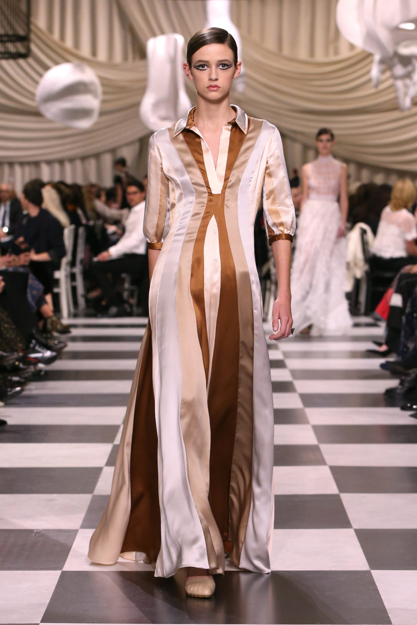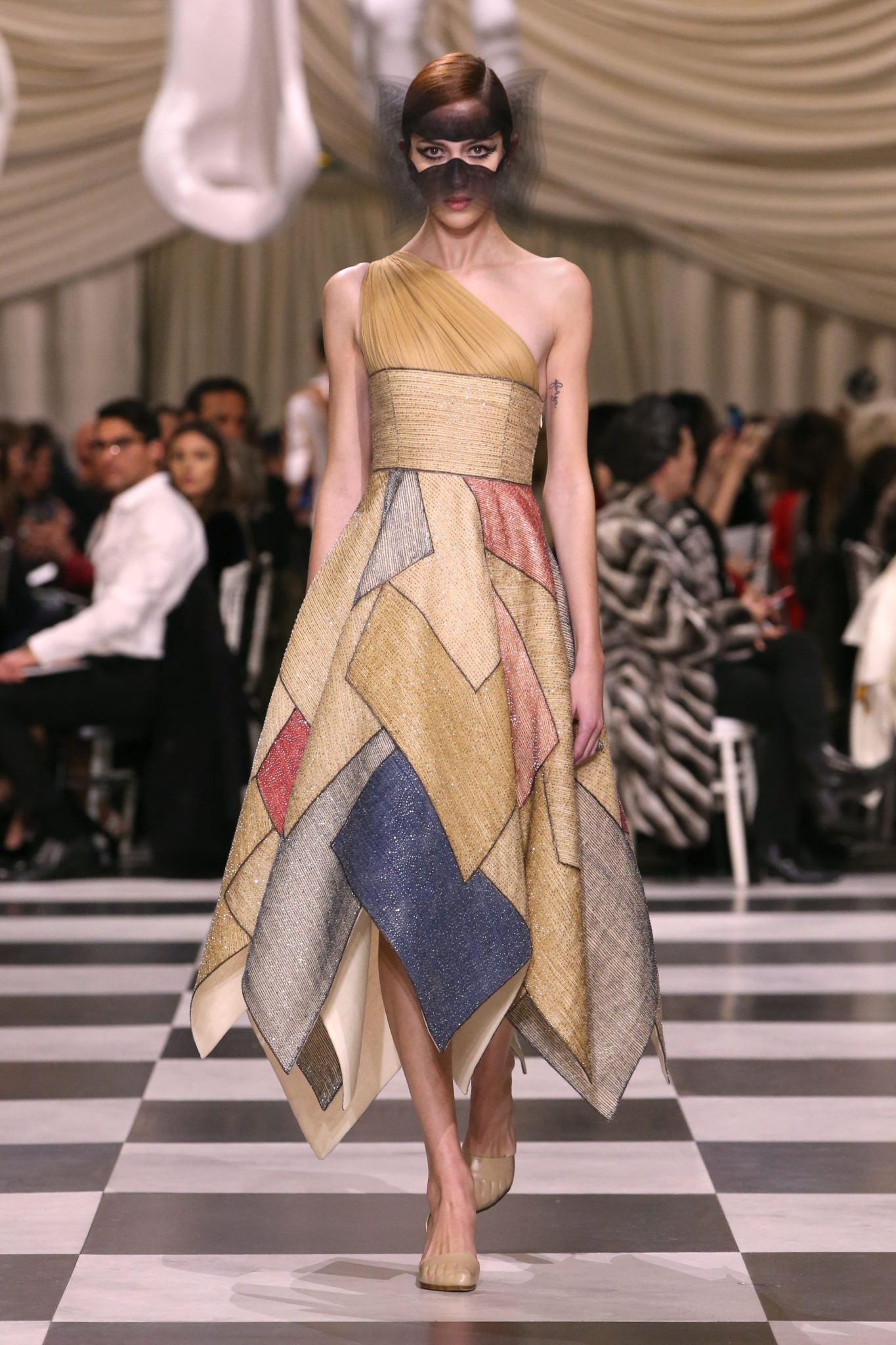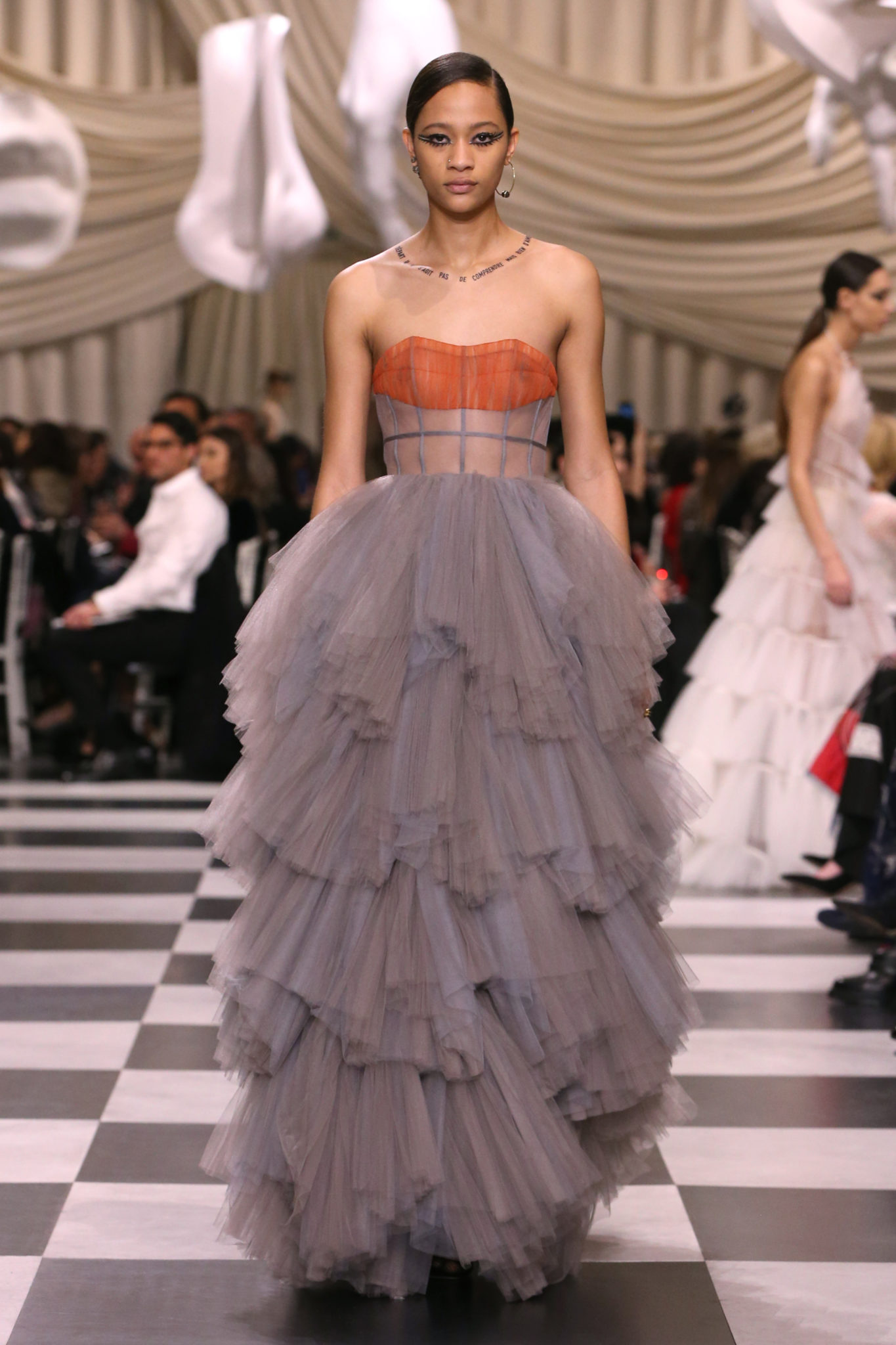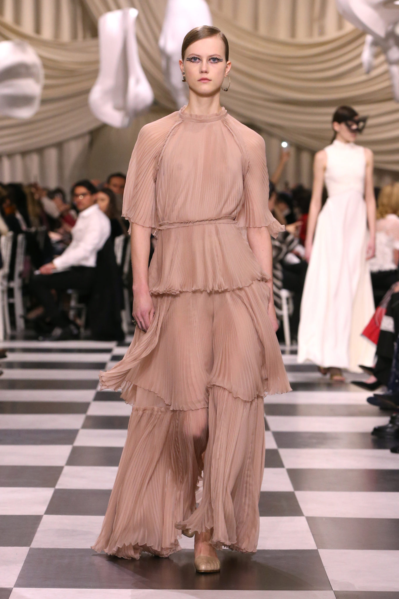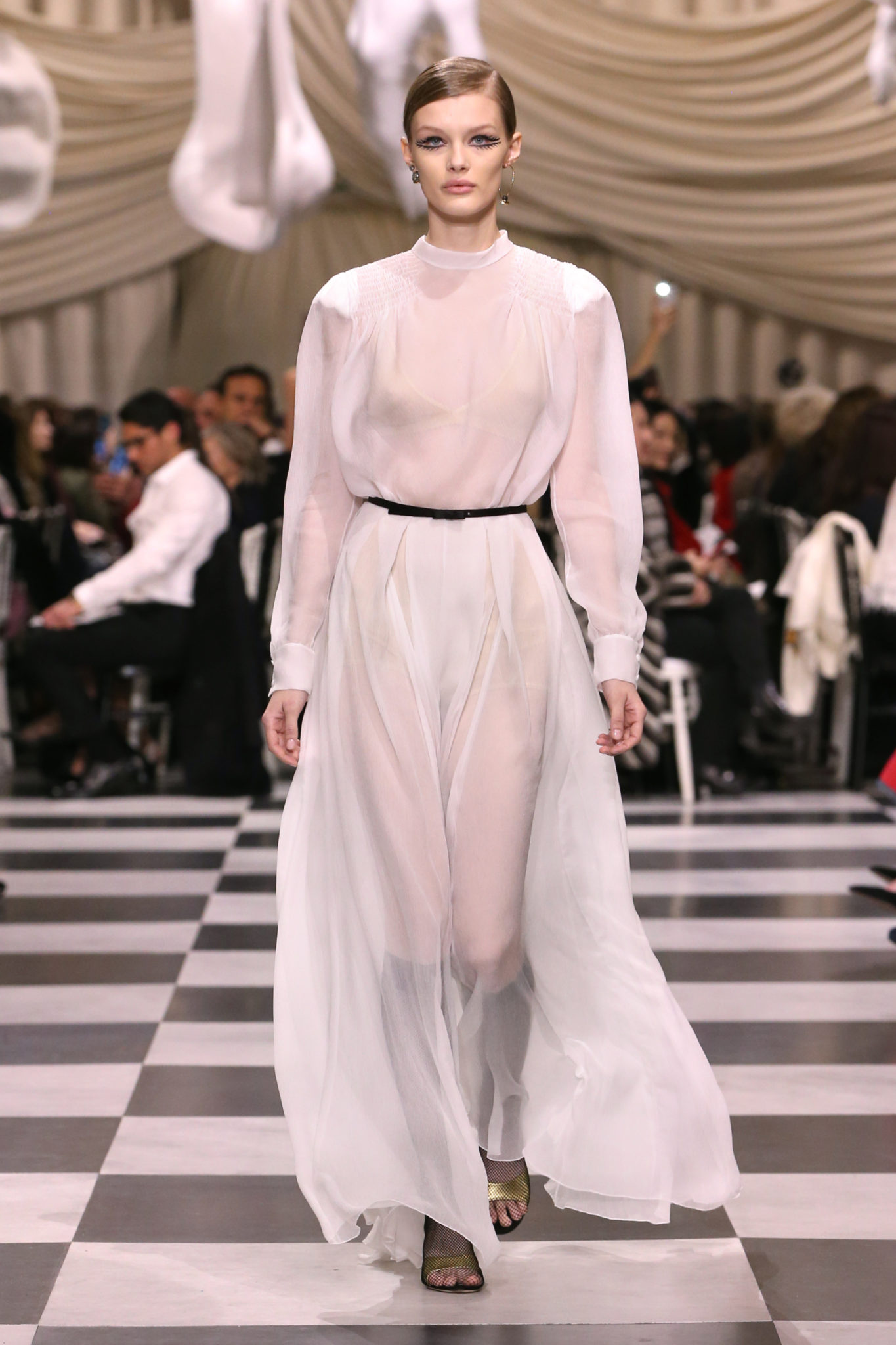 L’histoire de la haute couture est liée à l’histoire de l’art moderne. Le couturier est un créateur à part entière, et le mot « atelier » désigne aussi bien le lieu d’expression de l’artiste que celui du couturier. Mais le véritable atelier de l’artiste demeure son esprit. C’est dans cette dimension, en équilibre entre rêve et réalité, entre imagination et réalisation, que Maria Grazia Chiuri, la Directrice Artistique des collections femme de la Maison, mène ses recherches et ses travaux d’exploration. Parce que la haute couture incarne le rêve de la mode. C’est un lieu où il est possible d’évoluer librement pour expérimenter des techniques, des matières et des formes. S’immerger au cœur du mouvement surréaliste lui a permis d’apporter un souffle imaginatif à cette collection de haute couture printemps-été 2018, pour un dépaysement et un renversement optique permanent.Le surréalisme touche également aux mots, aux textes évocateurs qui ont guidé Maria Grazia Chiuri dans la création d’une collection principalement en noir et blanc, parsemée d’illusions et de surprises.Ne jamais se fier à la première impression… Ainsi, les grands plis de la robe du soir blanche bordés de noir s’ouvrent comme des pages, à la manière d’un livre ; la cage, motif récurrent des œuvres surréalistes, est transfigurée en un réseau de tissu tubulaire noir qui enserre le corps et souligne les jeux de transparence, tandis qu’un filet de pêche en fils d’argent se mêle à la densité du velours. Mais c’est avant tout le charisme de Leonor Fini qui définit l’attitude stricte et radicale de la collection. Leonor Fini qui, après avoir quitté l’Italie pour Paris, avait, à l’époque, organisé sa première exposition précisément dans la galerie de Christian Dior, avec qui elle s’était liée d’amitié. Lors de ses apparitions fantasmagoriques, elle portait souvent des créations Dior. Elle était l’incarnation de l’idée, alors révolutionnaire, qu’il faut toujours rester indépendante et se réinventer soi-même, représentant ainsi tout le champ des réalités possibles. Elle utilisait les vêtements pour se définir et se mettre en scène, pour s’affirmer, aussi bien en public qu’en privé : influente, stricte et élégante, dans des poses empruntées aux portraits masculins de la Renaissance, dans une interaction continue entre vie et œuvre d’art, mêlant le naturel et l’artificiel. C’est dans cette dimension suspendue entre rêve et réalité qu’évoluent les merveilles de la haute couture. Il en va de même pour les tenues de jour, dont Christian Dior a su réinterpréter les formes, notamment en utilisant des tissus masculins, et desquelles Maria Grazia Chiuri s’inspire pour proposer une série de tailleurs. Ceux-ci reprennent les courbes de Dior pour les remettre au goût du jour et s’accordent avec des jupes aux multiples contrastes. Fidèles à la tradition surréaliste du fétichisme du corps déconstruit, les accessoires marquent leur présence d’une manière fantastique : un bas résille voile une sandale, des gants enserrent une cheville. C’est dans cette manière de voir et de se faire voir, dans ce regard plongé dans l’inconscient et porté sur le monde que Maria Grazia Chiuri marie broderies et merveilles. Des ornements précieux et délicats qui, sur une robe habitée par une fantasmagorie flamboyante de plumes de paon, deviennent des yeux qui scrutent et expriment le mystère, mais aussi la puissance de la spiritualité des femmes d’aujourd’hui.
