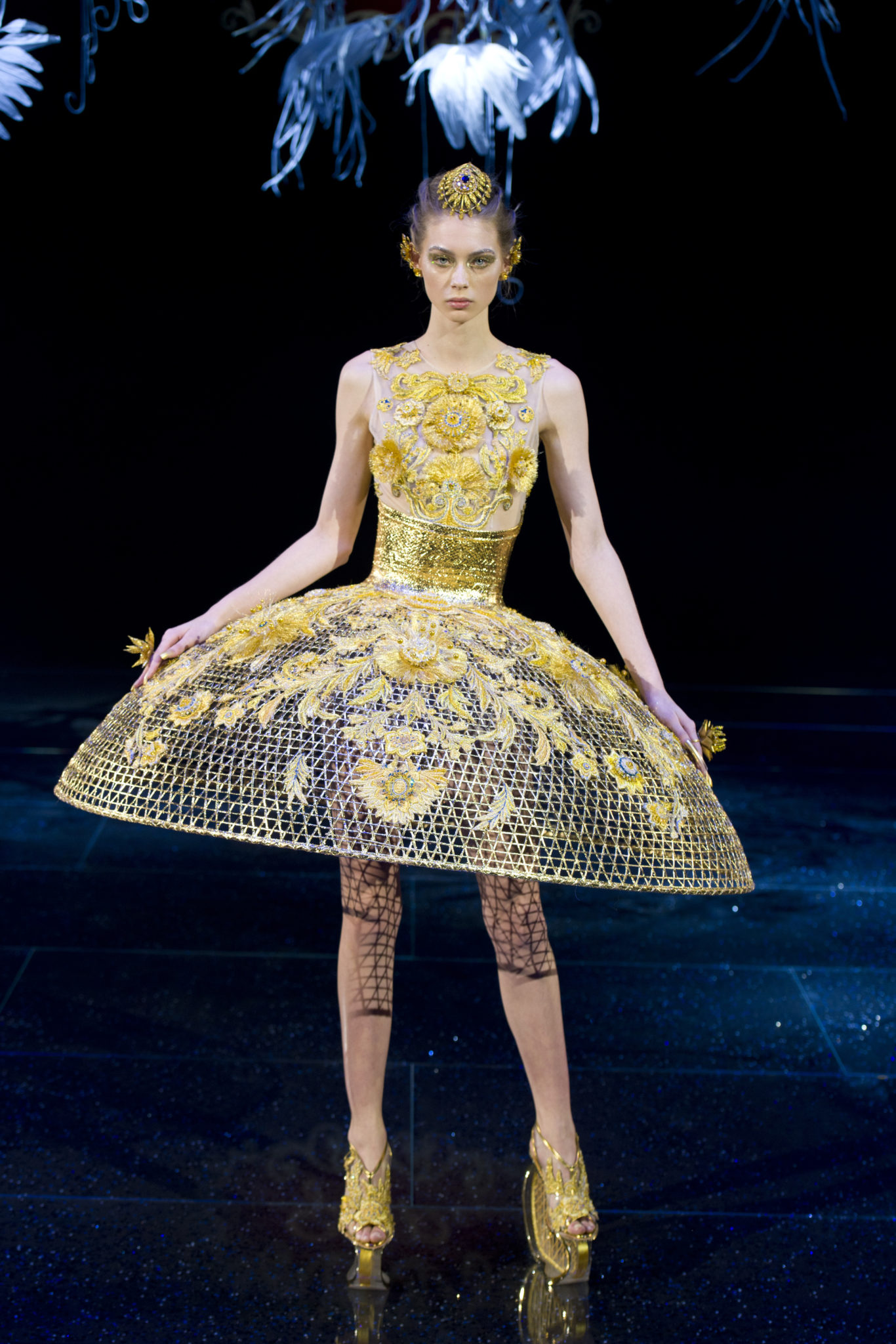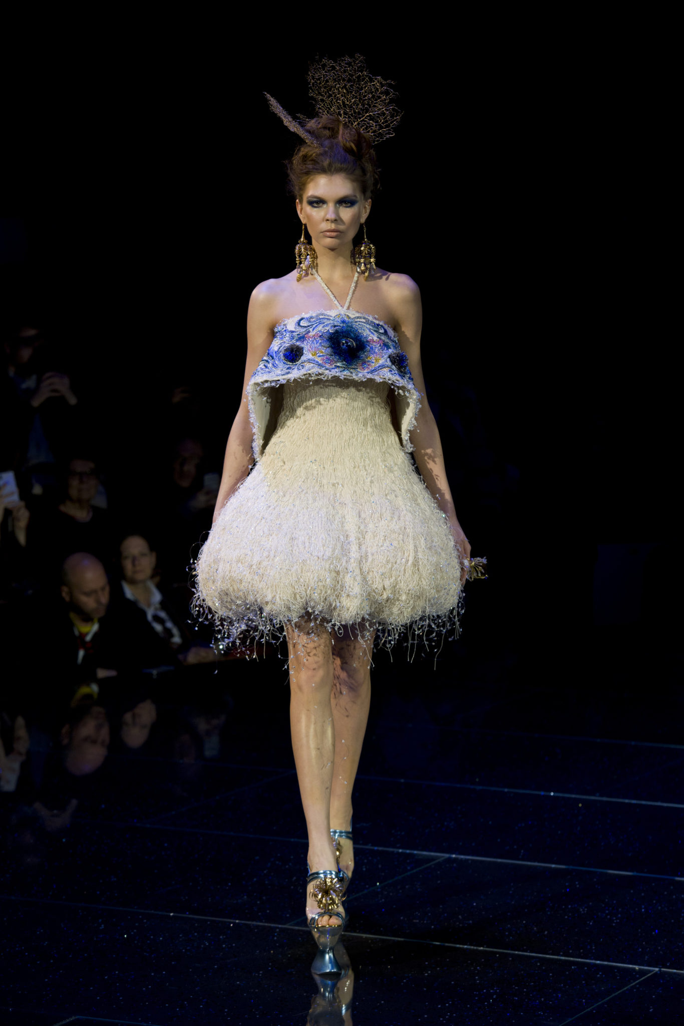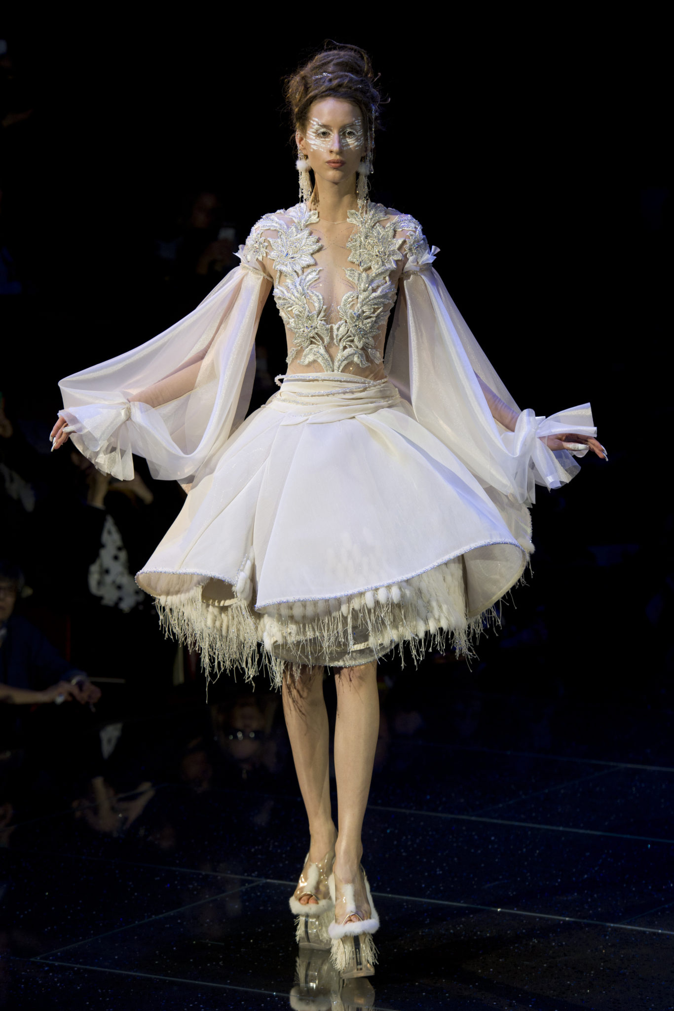 Dans toutes ses collections, Guo Pei privilégie les thèmes de la responsabilité et de la vie. Cette fois encore, c’est sur la vie qu’elle pose son regard. Elysium, une île où la joie trouve sa source comme les miracles de la vie, où dans le ciel flottent de blanches racine d’arbre tortueuses. Le podium circulaire comme une pierre précieuse noire nous renvoie les reflets bleu marine de l’océan et ceux d’un ciel d’une nuit profonde. Dans le cœur de Guo Pei, vit ce jardin magique rempli de fleurs multicolores et de plantes magnifiques, où les elfes dansent avec les fées, les sirènes s’amusent avec les anges, et la reine fée-des-fleurs se promène dans une jungle du passé.