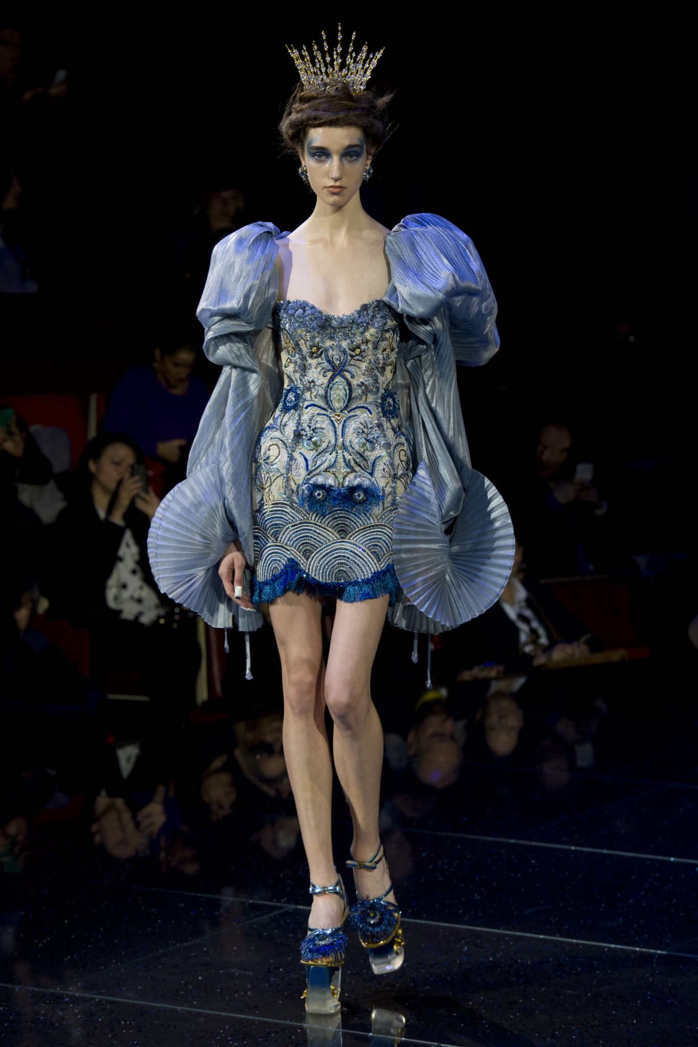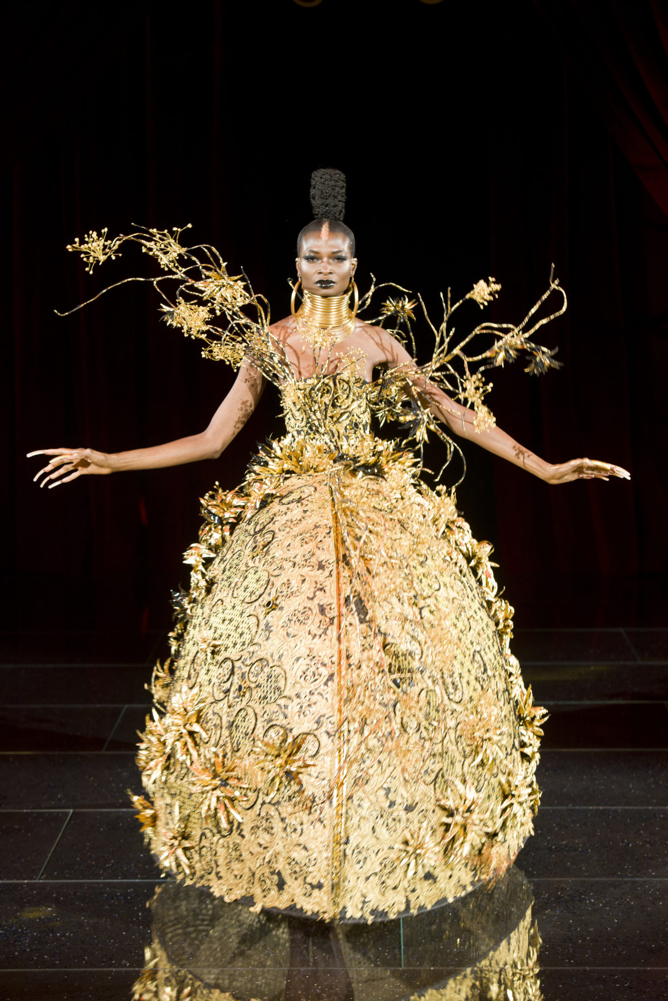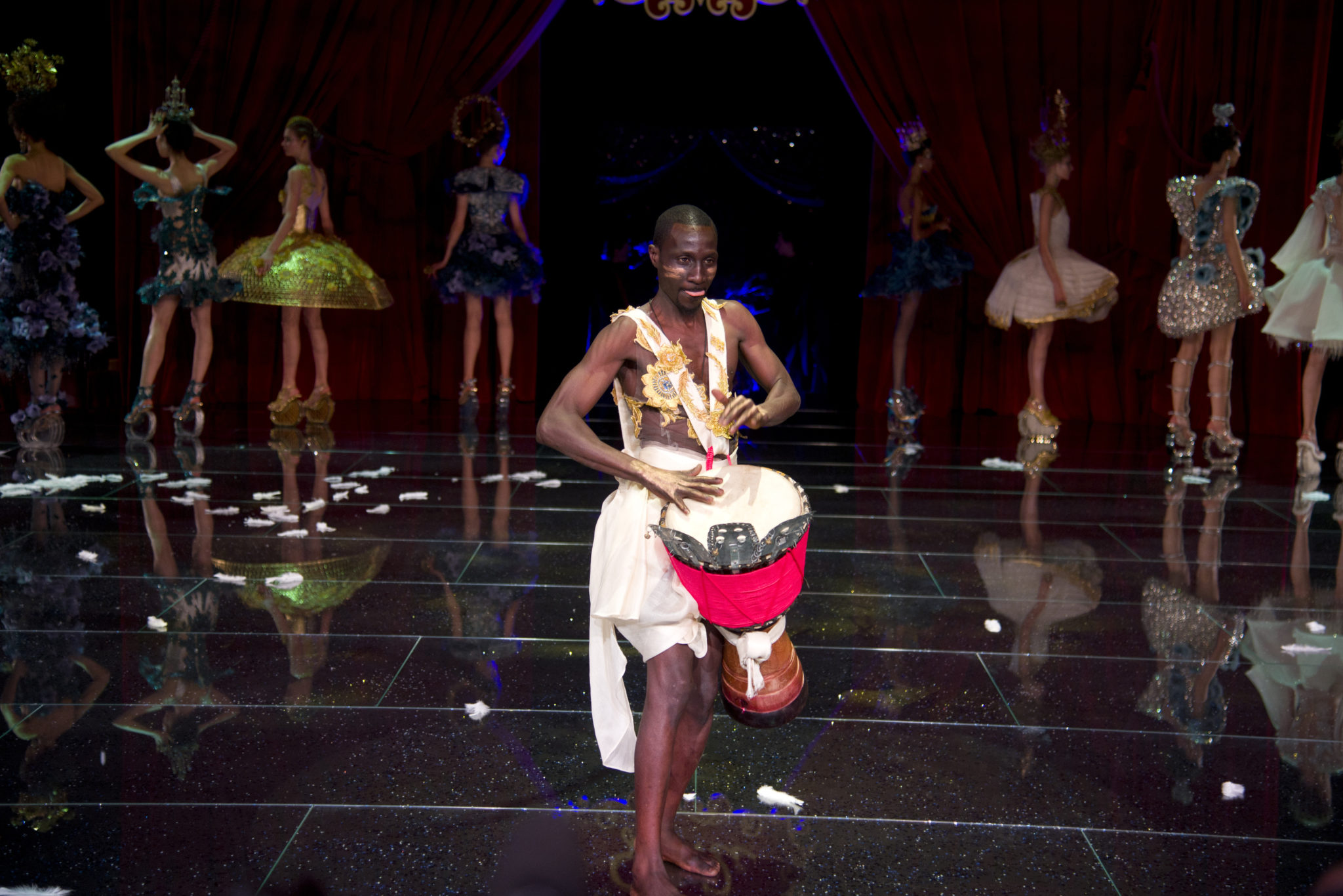 Dans toutes ses collections, Guo Pei privilégie les thèmes de la responsabilité et de la vie. Cette fois encore, c’est sur la vie qu’elle pose son regard. Elysium, une île où la joie trouve sa source comme les miracles de la vie, où dans le ciel flottent de blanches racine d’arbre tortueuses. Le podium circulaire comme une pierre précieuse noire nous renvoie les reflets bleu marine de l’océan et ceux d’un ciel d’une nuit profonde. Dans le cœur de Guo Pei, vit ce jardin magique rempli de fleurs multicolores et de plantes magnifiques, où les elfes dansent avec les fées, les sirènes s’amusent avec les anges, et la reine fée-des-fleurs se promène dans une jungle du passé.