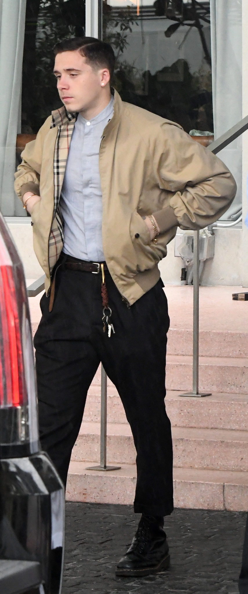 Brooklyn Beckham portait la veste Harrington réversible Gosha x Burberry à Miami.