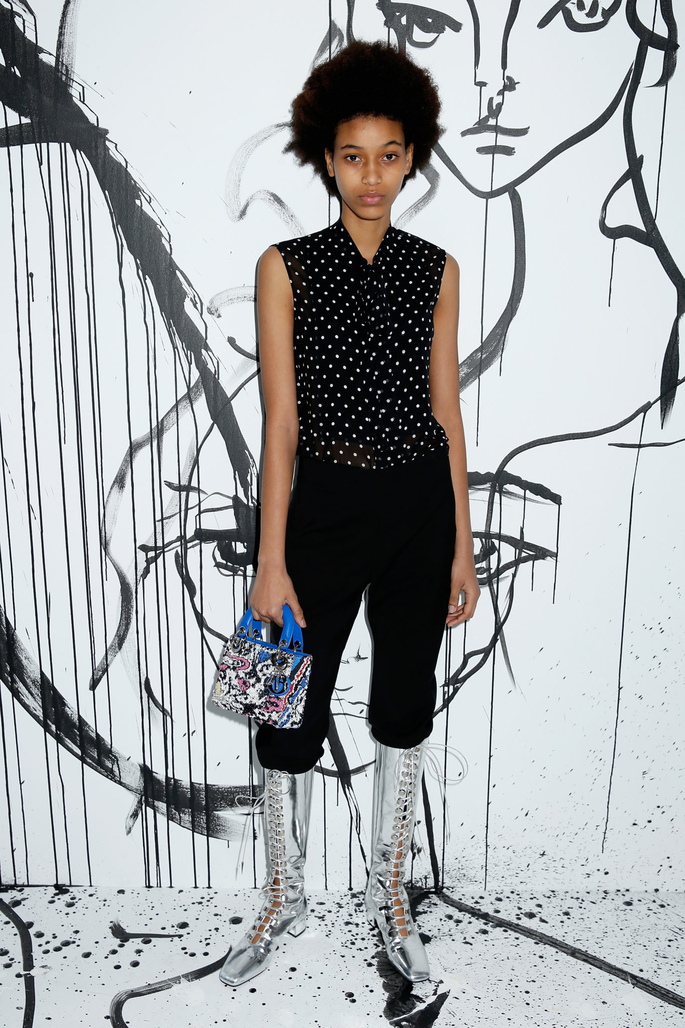 - Manuela Sanchez portait une blouse en soie noire à pois blancs Dior sur un pantalon en laine noire Dior. Elle portait également des bottines « Naughtily D » Dior et un mini sac « Lady Dior ».
