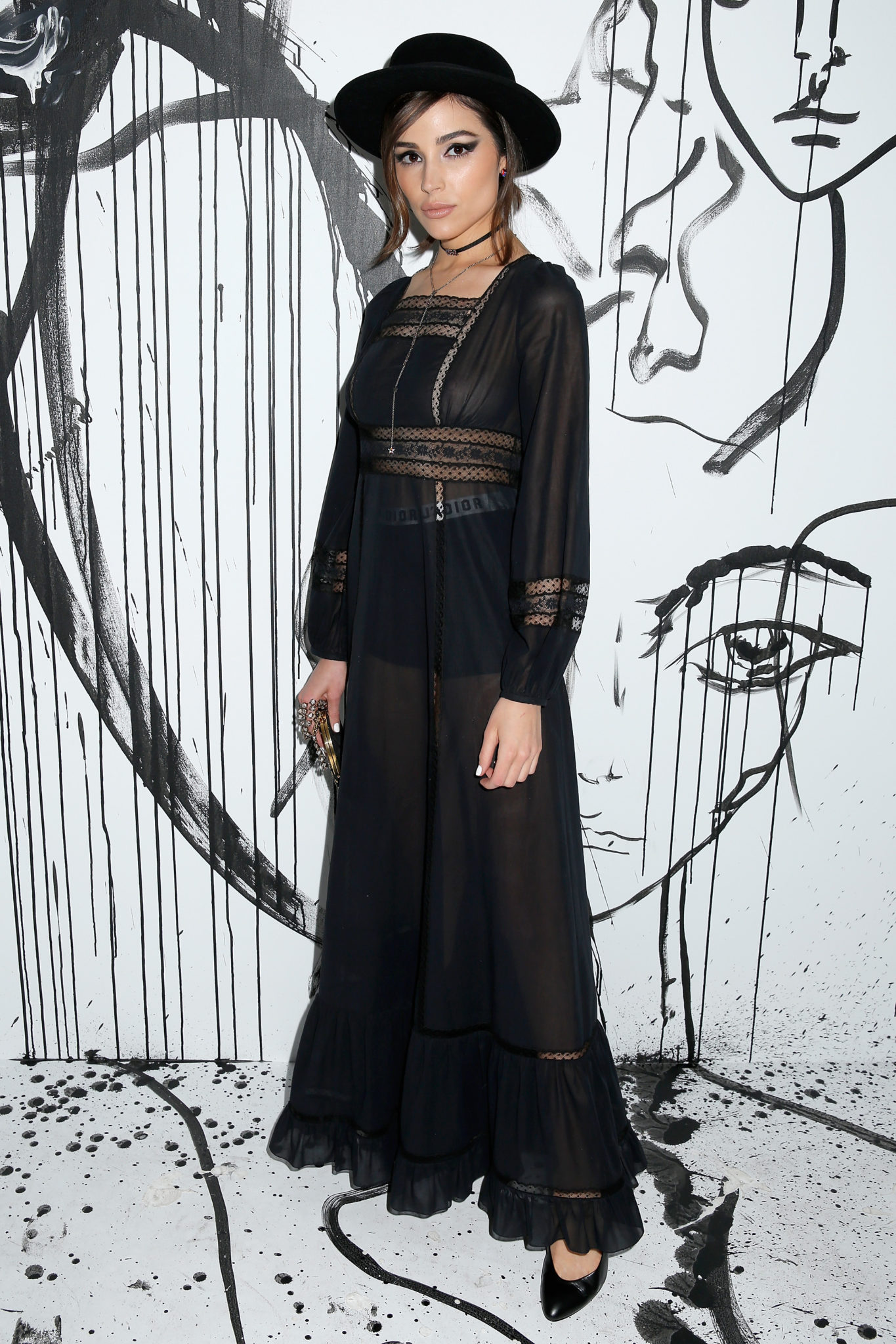 - Olivia Culpo portait une robe en dentelle et soie noires Dior. Elle portait également un chapeau Dior, des boucles d’oreilles Dior, des souliers Dior et le sac « Le Cœur de Dior ».