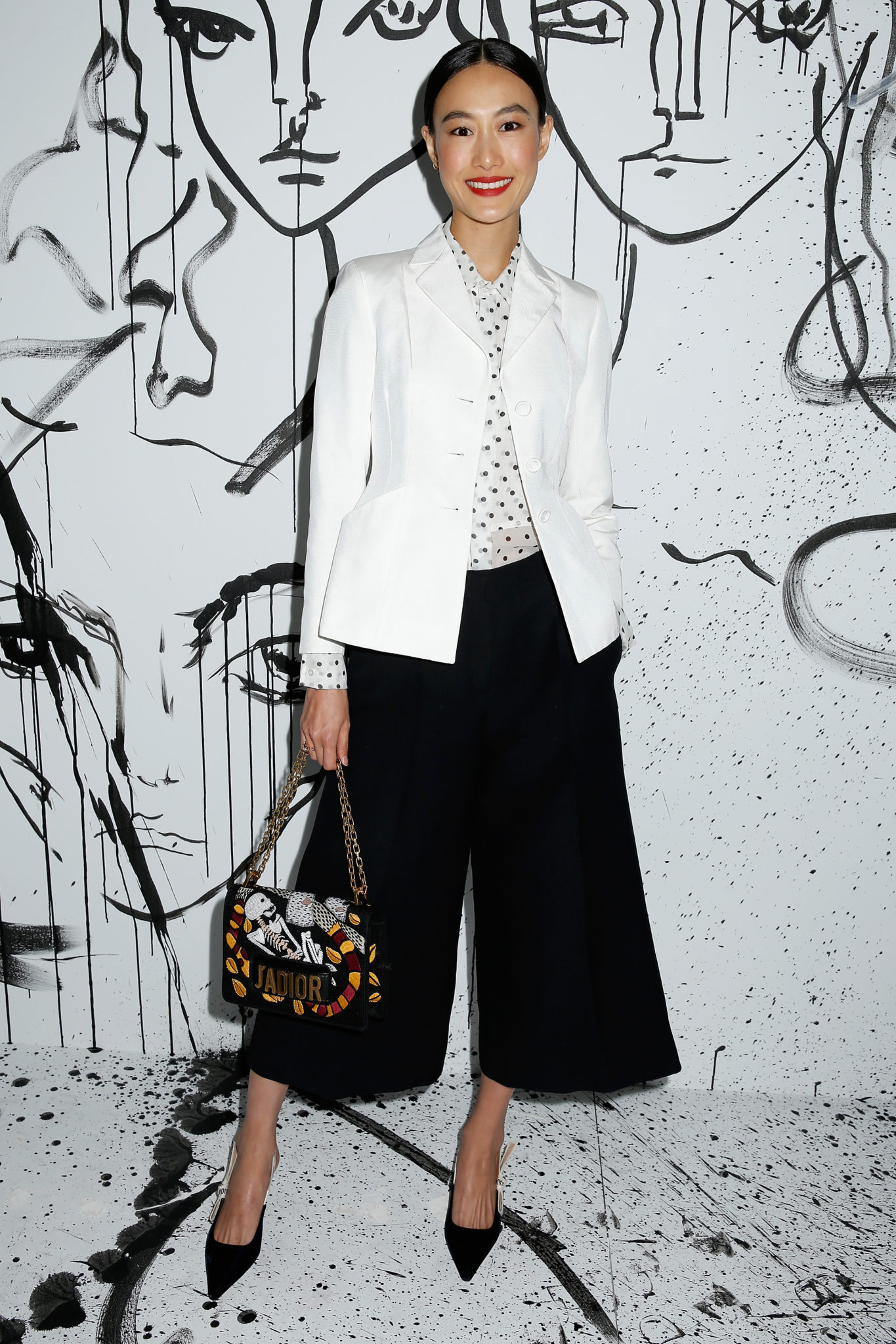 - Shu Pei portait une veste en soie blanche Dior, une blouse en soie blanche à pois noirs Dior et un pantalon en laine noire Dior. Elle portait également des souliers Dior et un sac « J’Adior ».