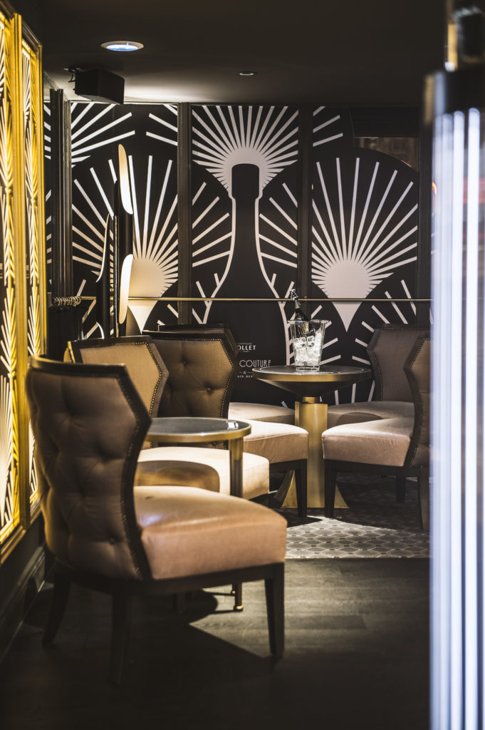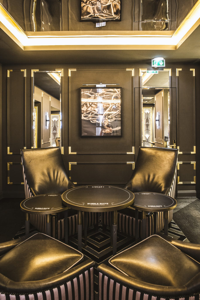 Inauguré le 18 janvier, le bar à Champagne Bubble Suite by Champagne Collet revisite le moment de l’apéritif et, à l’instar du Tea Time, lance le « Bubble Time » : une sélection de champagnes en accord avec des bouchées apéritives et des cocktail créations, à déguster dans une ambiance chic et Art Déco.