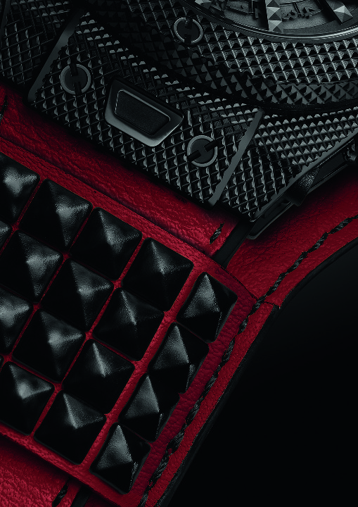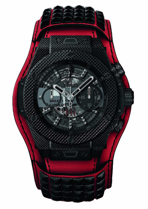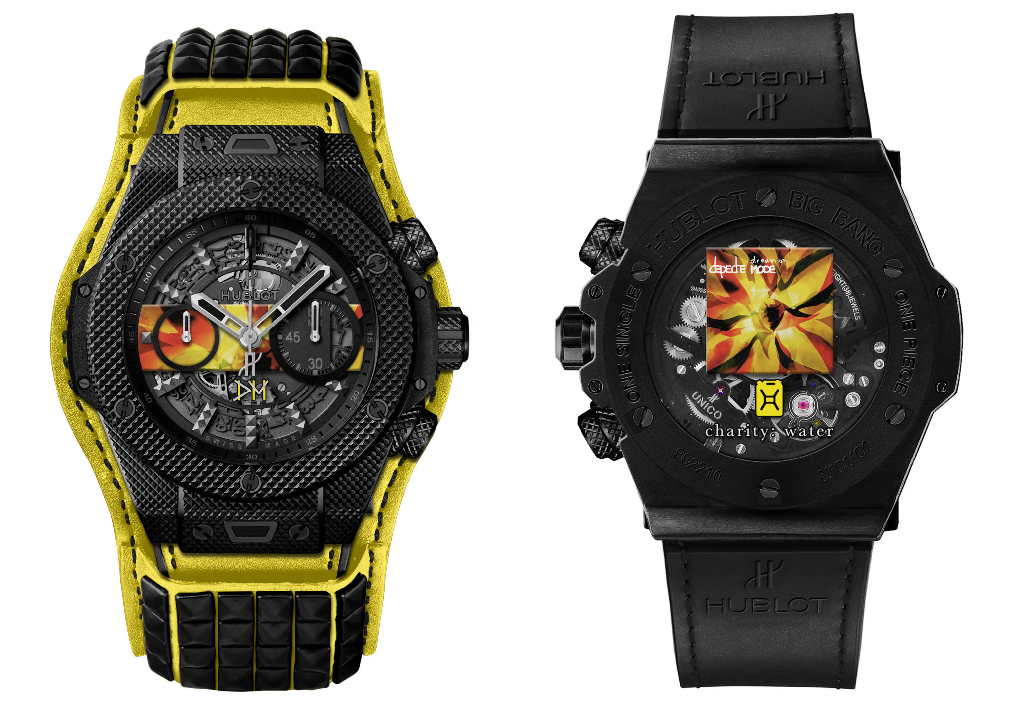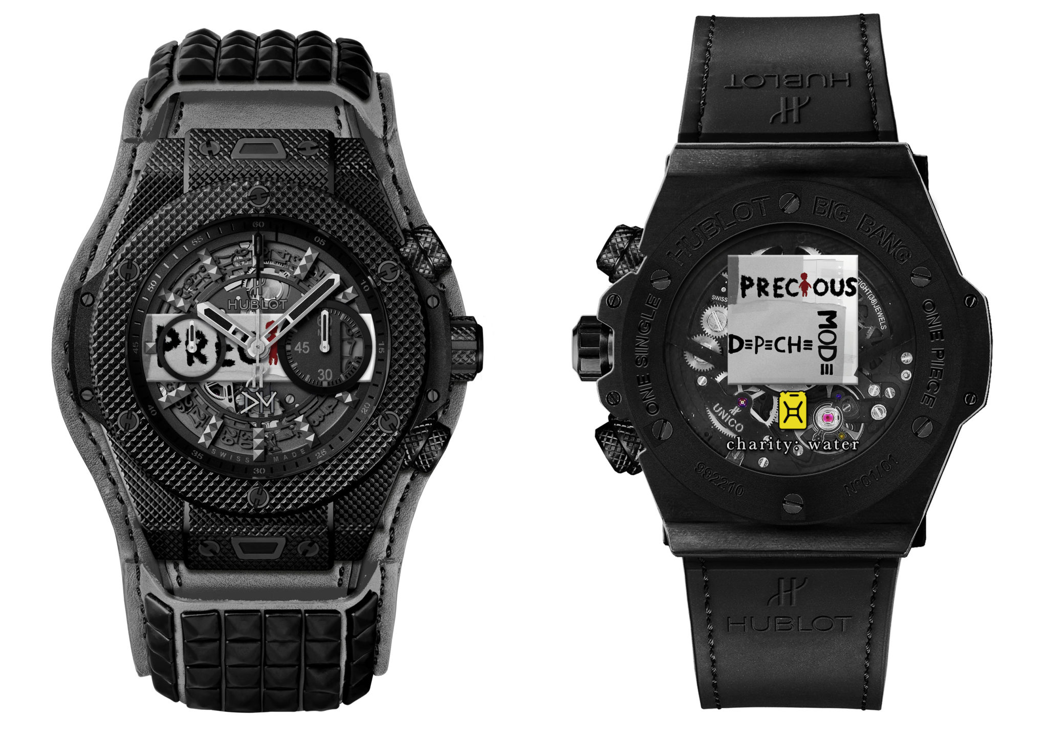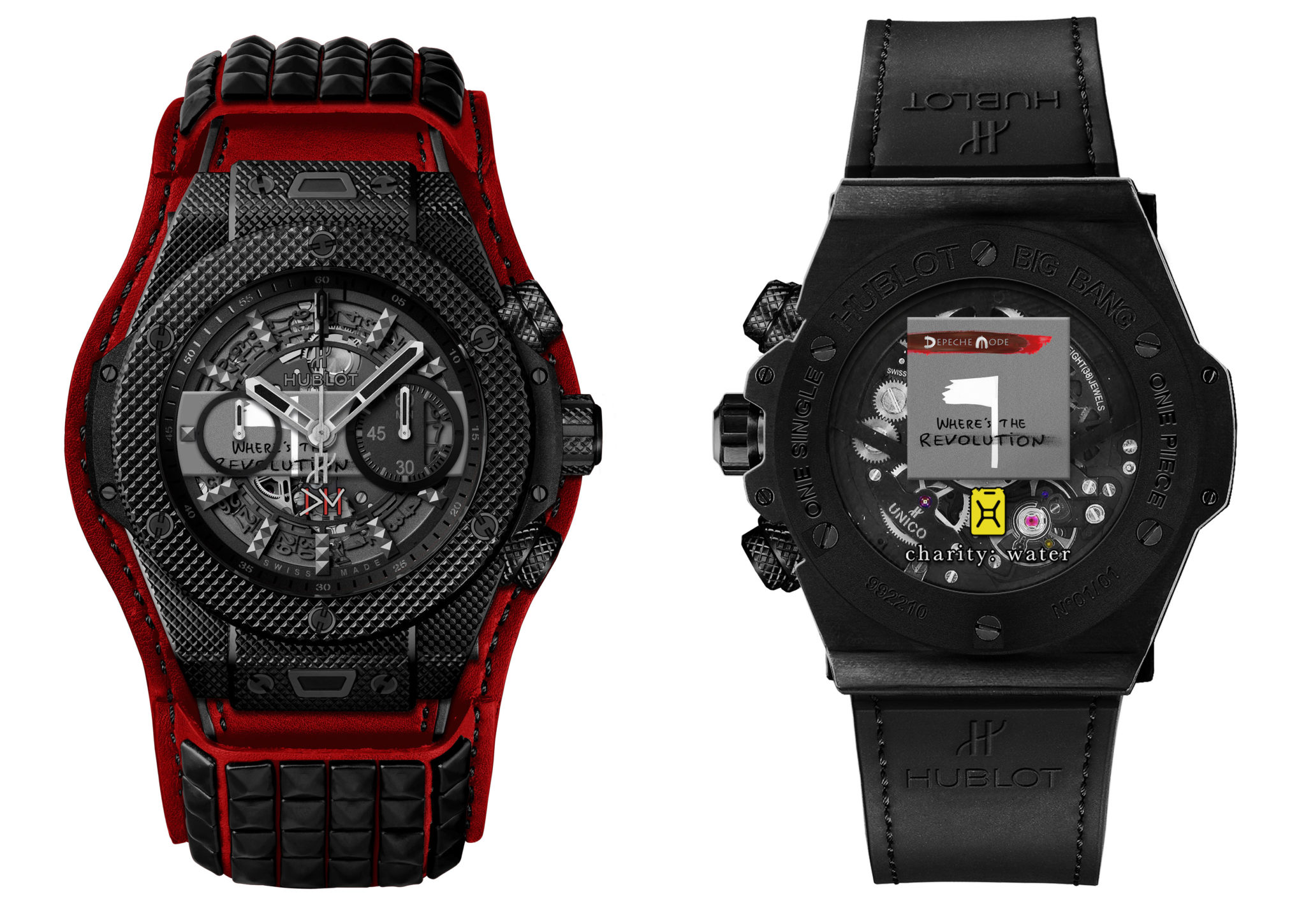 Chaque pièce unique arbore sur son cadran une pastille reprenant partiellement l’image de couverture du disque qu’elleil représente, rappelant en cela le tout premier modèle issu du partenariat entre Hublot et Depeche Mode. Au dos de chaque montre figure en entier la couverture du single ainsi que le logo de l’association charity: water. Ces deux éléments sont apposés sur le saphir de la glace ouvrant sur le fameux mouvement automatique Unico. Issu de la manufacture Hublot, il offre une réserve de marche de 72 heures. Chaque exemplaire sera équipé d’un bracelet d’une couleur spécifique à chaque modèle, complété par une manchette de la même teinte avec ses clous rock and roll en caoutchouc ! Cet accessoire est ajouré dans son dos afin de permettre de voir la glace au fond de la montre et son mouvement.