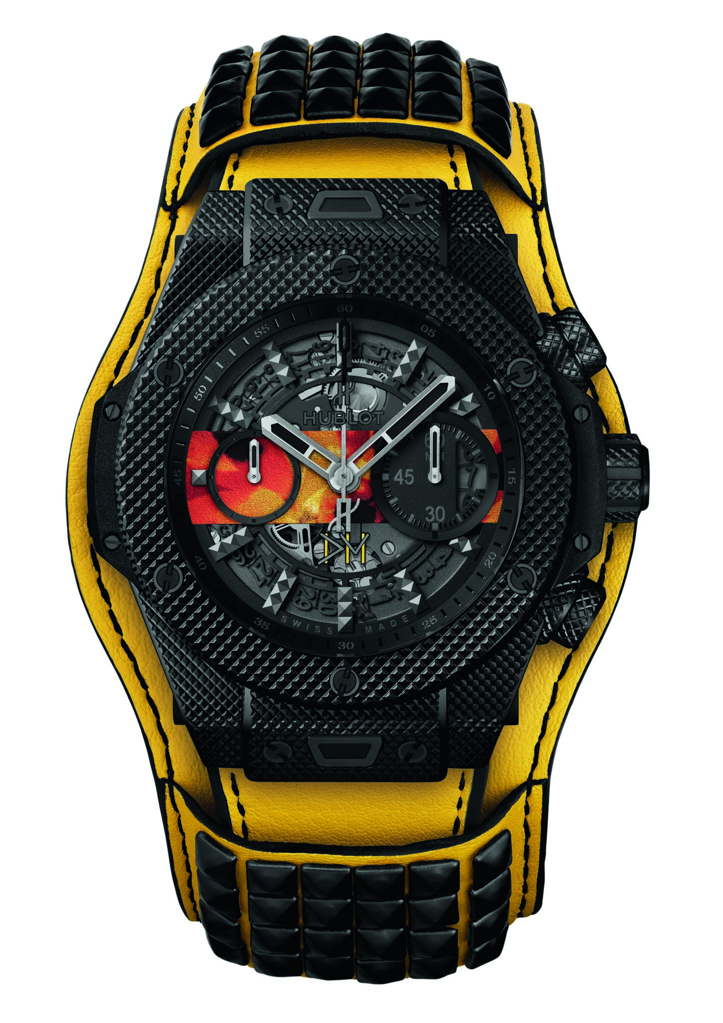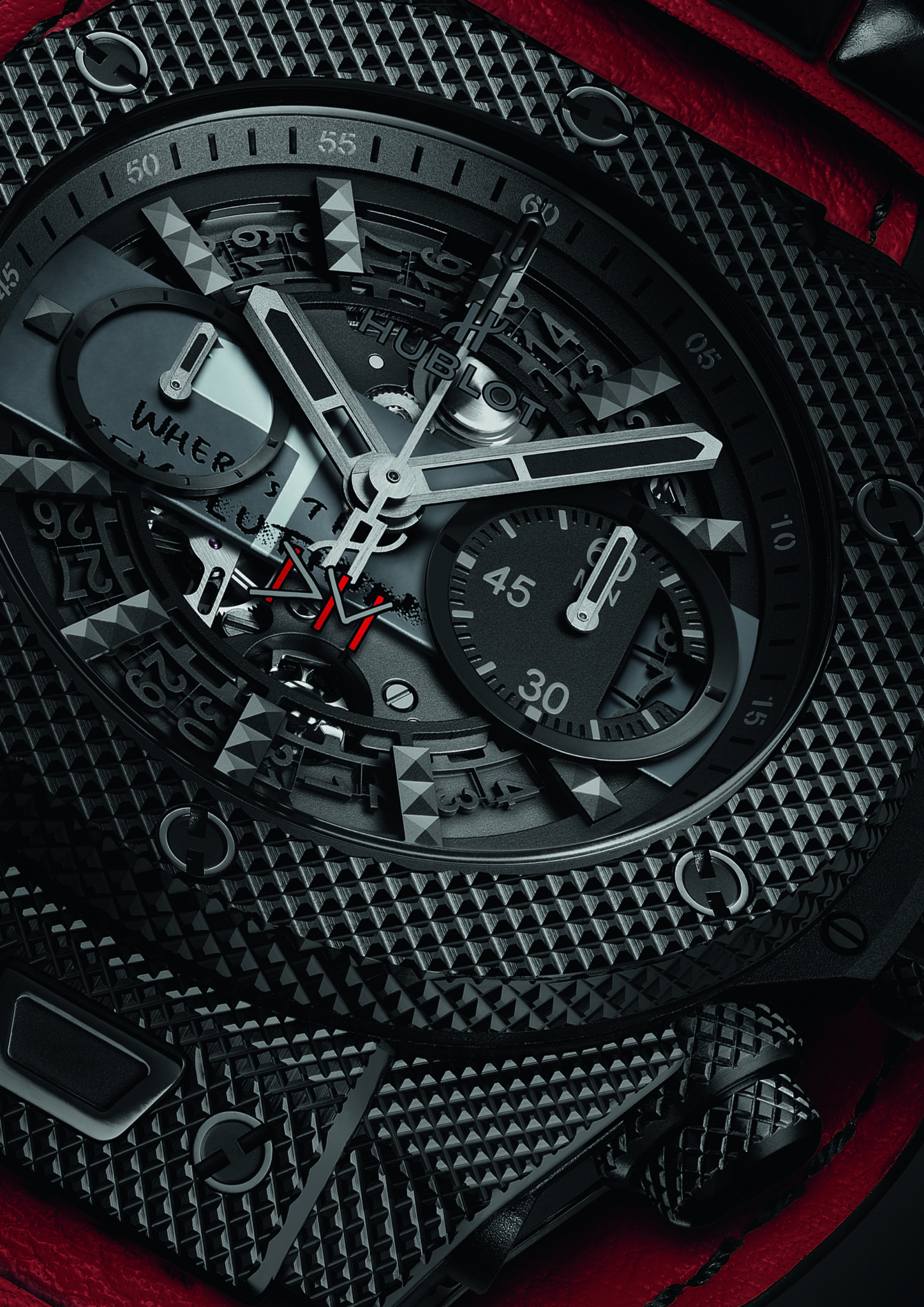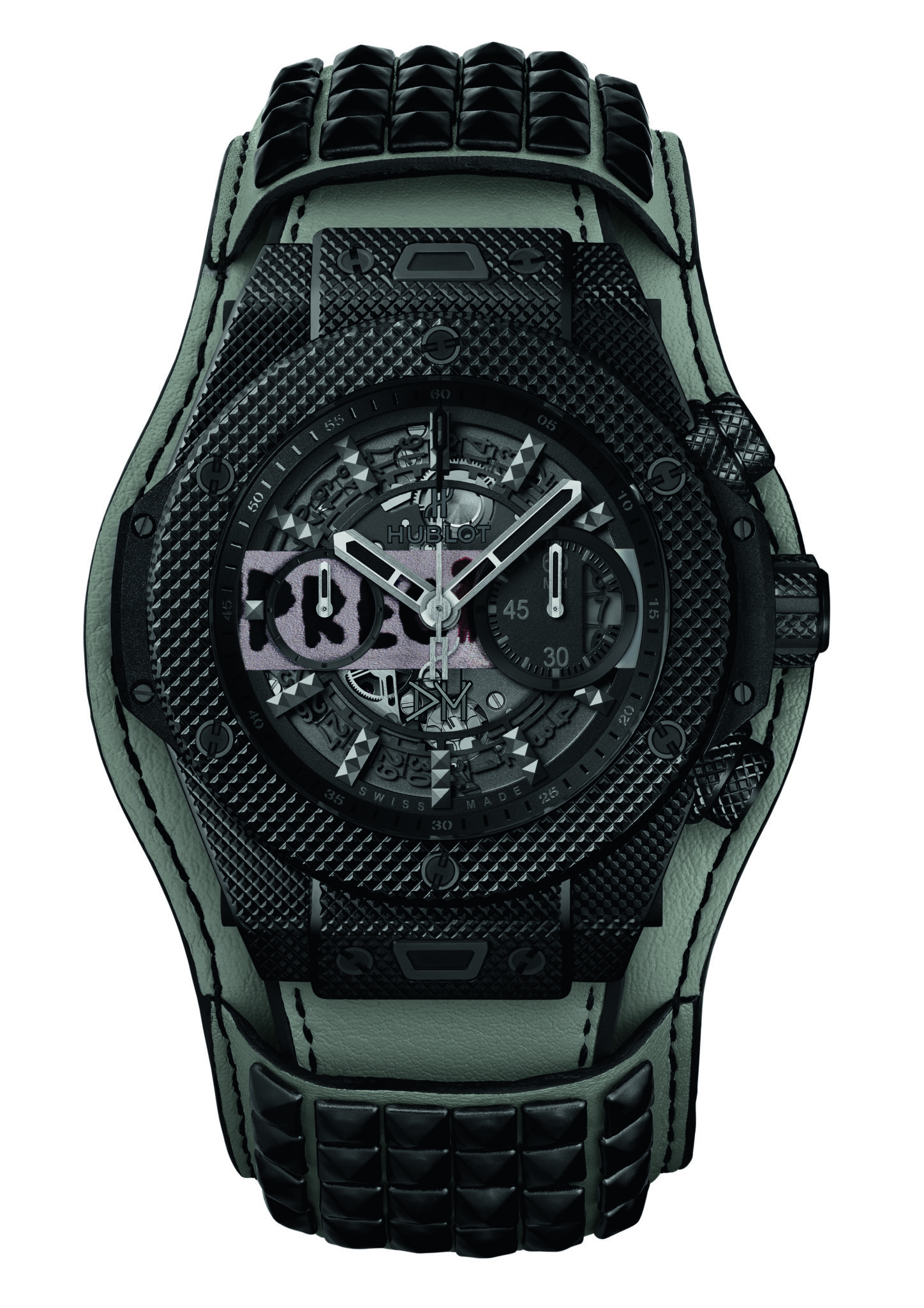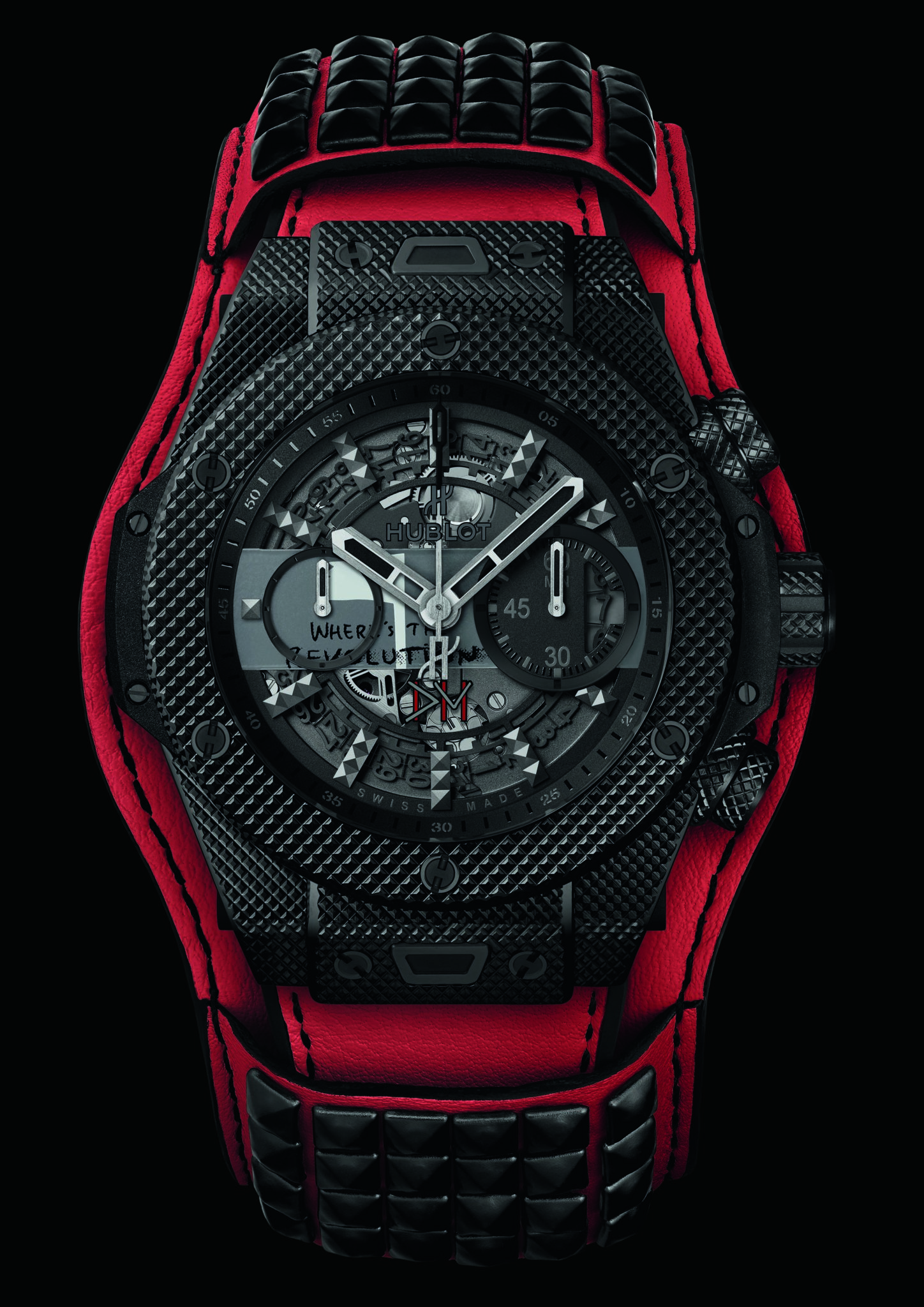 Chaque pièce unique arbore sur son cadran une pastille reprenant partiellement l’image de couverture du disque qu’elleil représente, rappelant en cela le tout premier modèle issu du partenariat entre Hublot et Depeche Mode. Au dos de chaque montre figure en entier la couverture du single ainsi que le logo de l’association charity: water. Ces deux éléments sont apposés sur le saphir de la glace ouvrant sur le fameux mouvement automatique Unico. Issu de la manufacture Hublot, il offre une réserve de marche de 72 heures. Chaque exemplaire sera équipé d’un bracelet d’une couleur spécifique à chaque modèle, complété par une manchette de la même teinte avec ses clous rock and roll en caoutchouc ! Cet accessoire est ajouré dans son dos afin de permettre de voir la glace au fond de la montre et son mouvement.