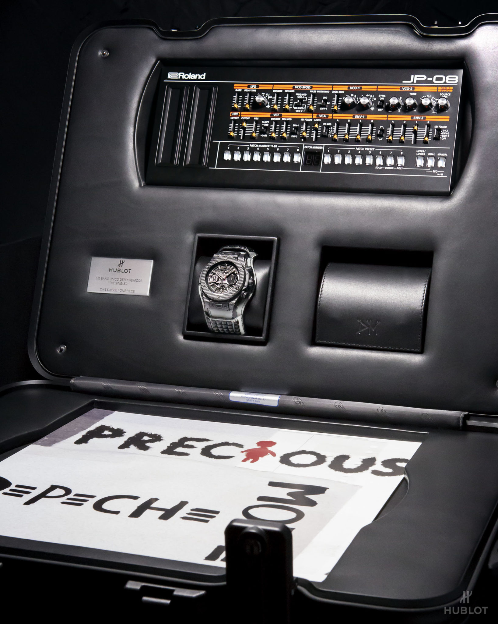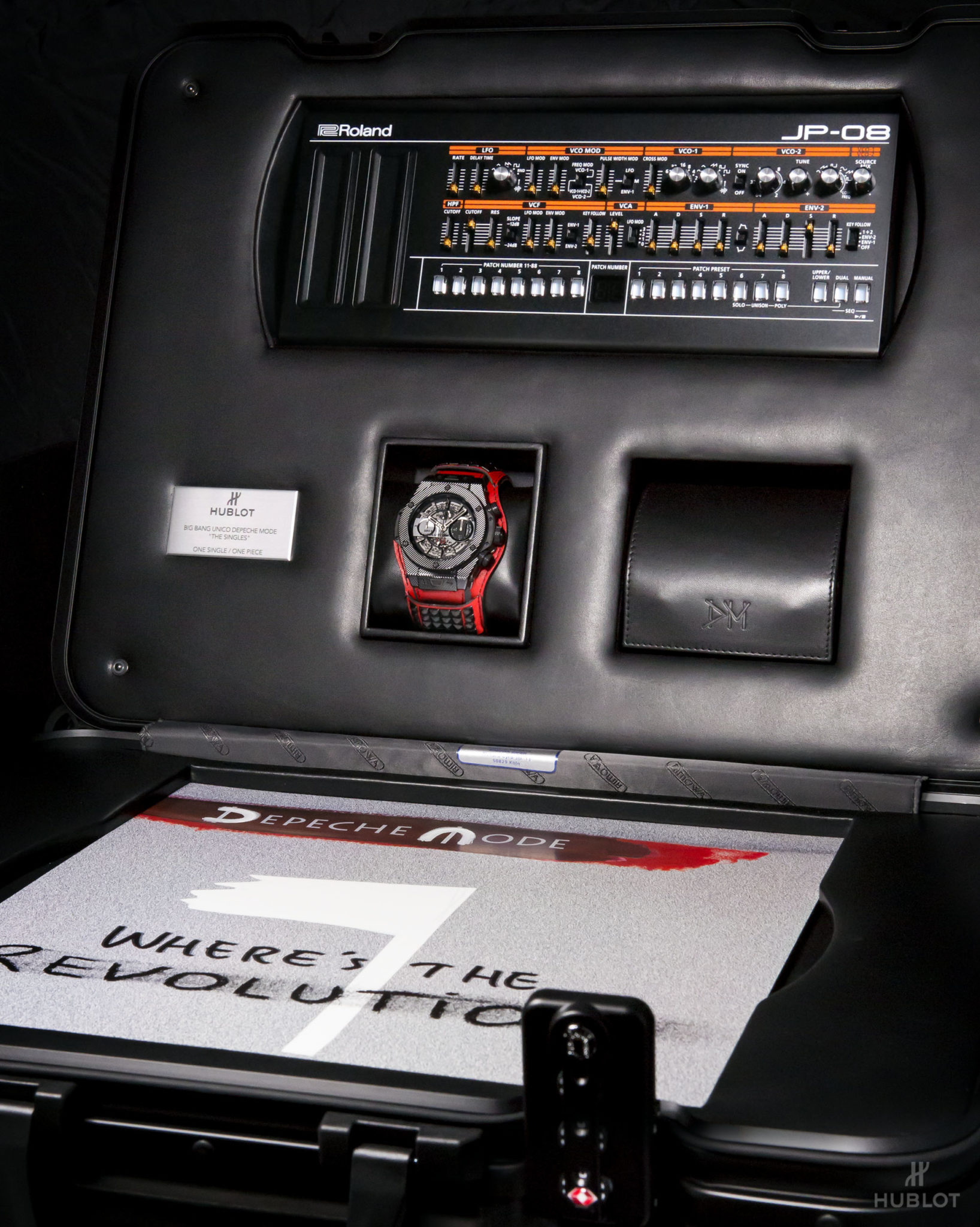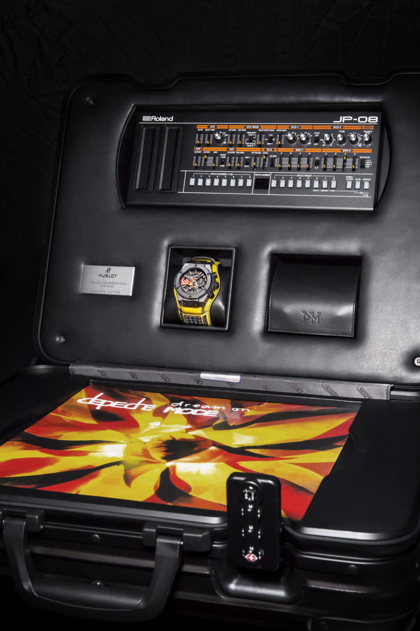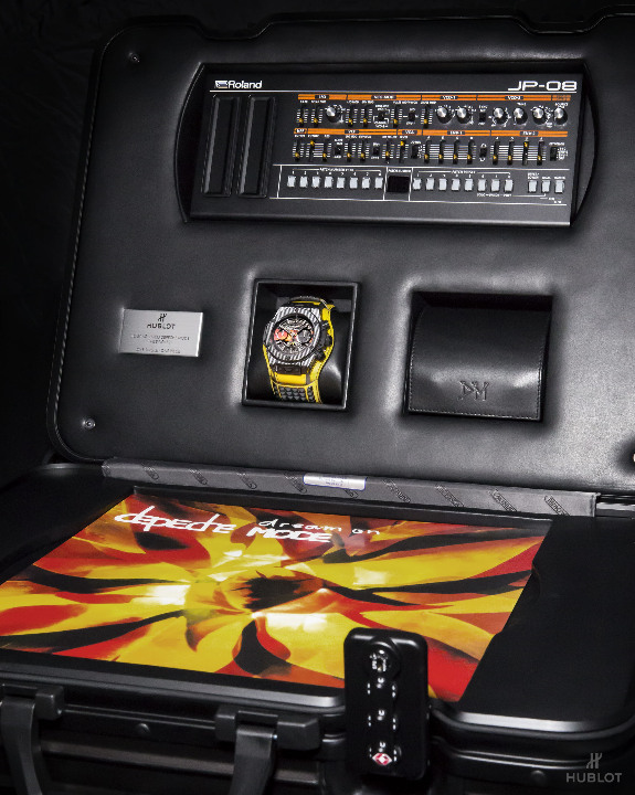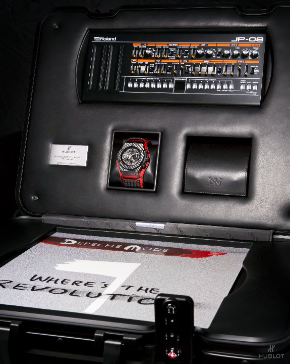 Dernier détail rendant la collection Big Bang Depeche Mode « The Singles » Limited Edition encore plus exclusive : chaque pièce unique sera accompagnée d’un synthétiseur Roland JP- 08, une édition limitée rendant hommage en recréant les sons du légendaire modèle Jupiter 8 utilisé par Depeche Mode au fil des ans. Le fabricant légendaire de bagages RIMOWA a créé une valise Topas Stealth de taille cabine en aluminium anodisé noir afin de servir d’écrin et transporter chaque montre Hublot Big Bang Depeche Mode « The Singles », avec le synthétiseur Roland JP-08, le disque vinyle correspondant et le certificat d’authenticité signé par le groupe. Le kit rock star est donc complet !