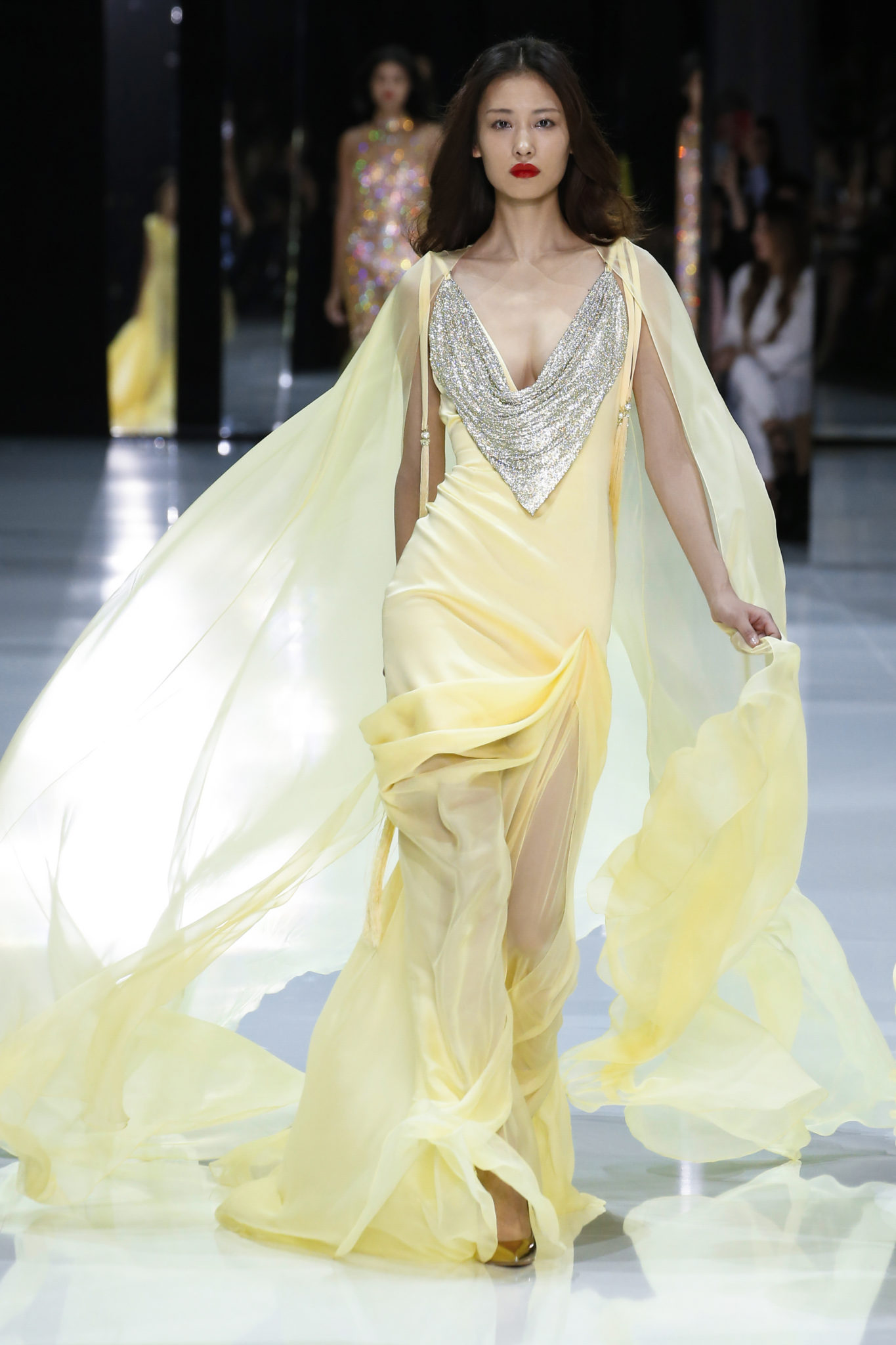 La cotte de mailles de cristal et le lamé de soie font leur retour sur le thème de la réflexion, non seulement de l’esprit créatif et de l’exploration, mais aussi de l’importance du voyage pour la femme