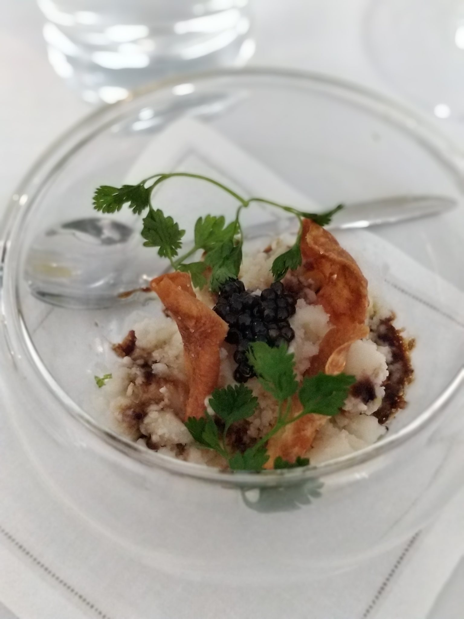 En mousseline et fins longuets croustillants, jus de coque à l’huile de tagète