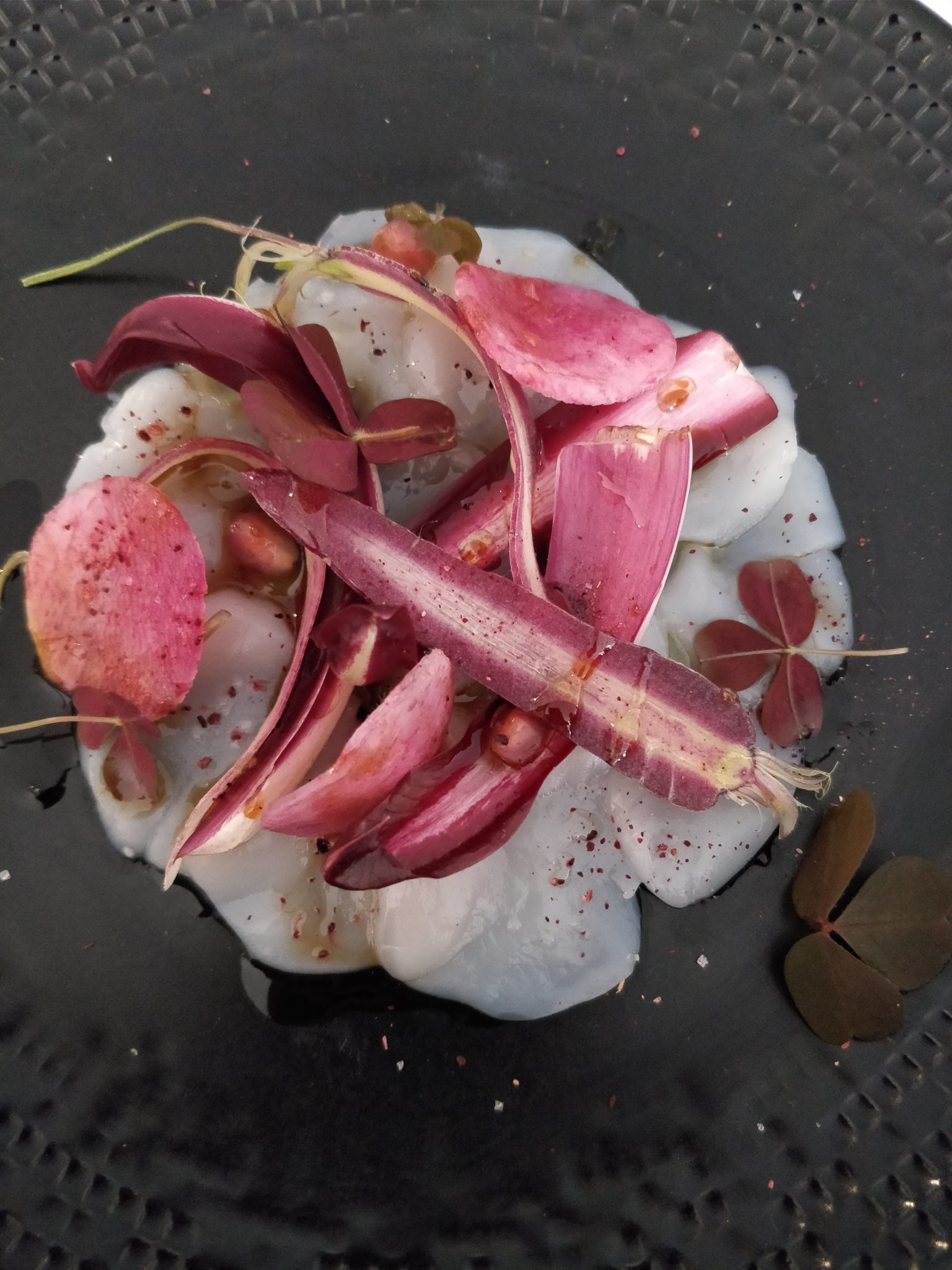 En carpaccio poudré à l’hibiscus, légumes pourpres et croquants, sauce Naar