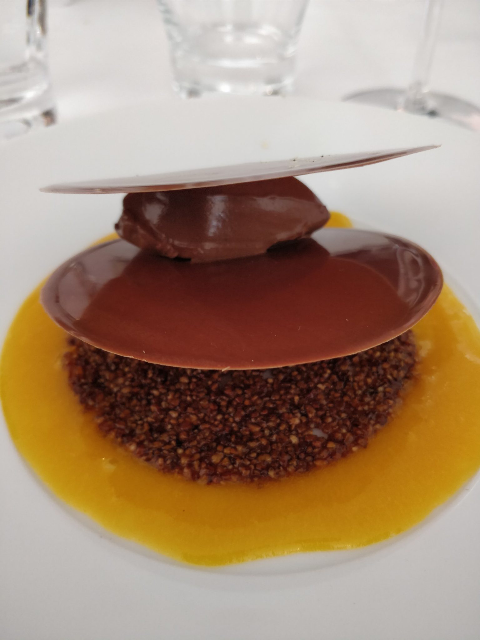 En rose des sables et cœur de chocolat noir ébène, coulis de fruit de la passion