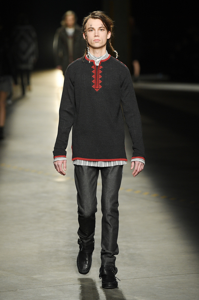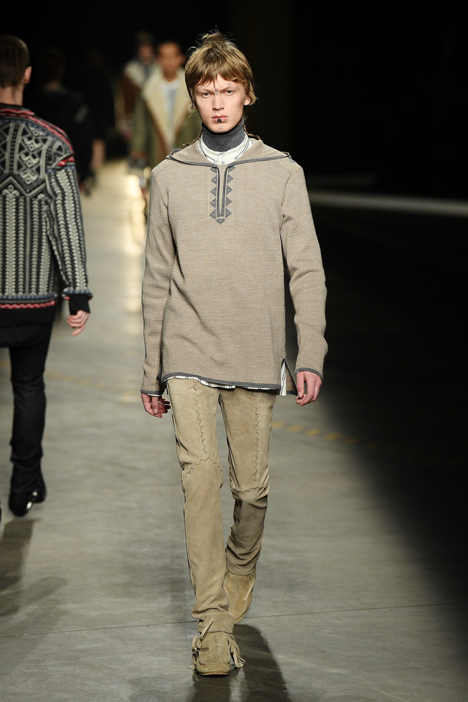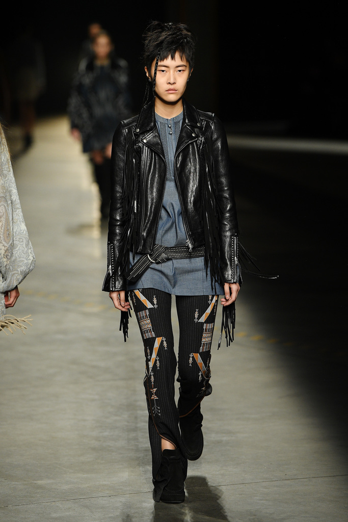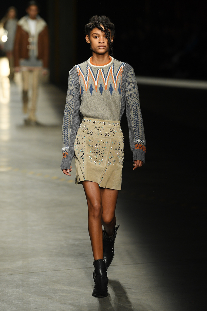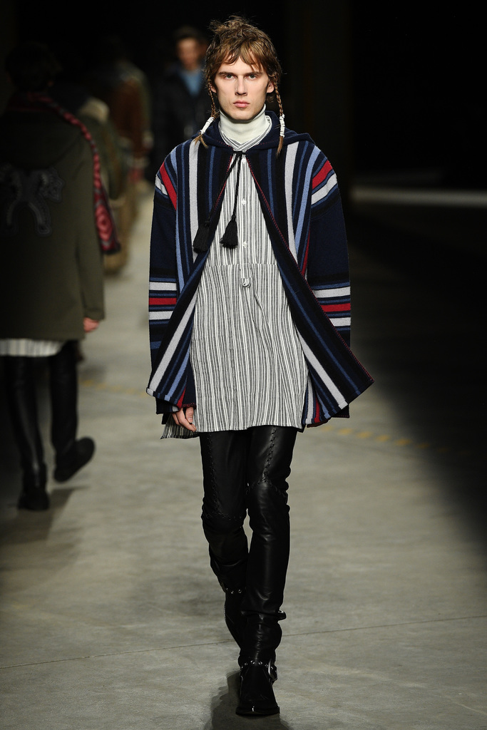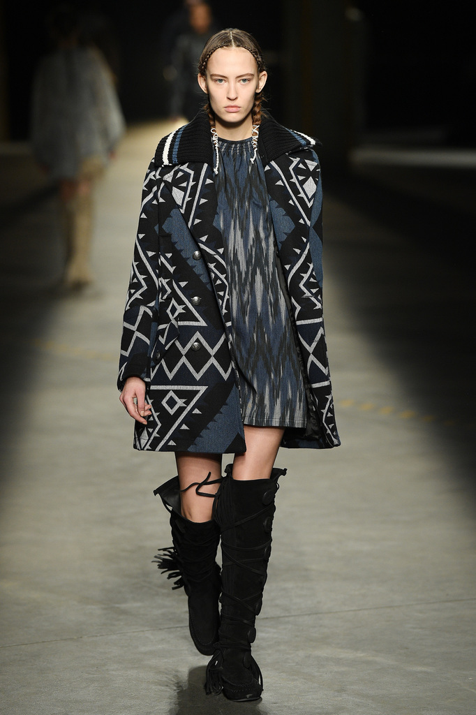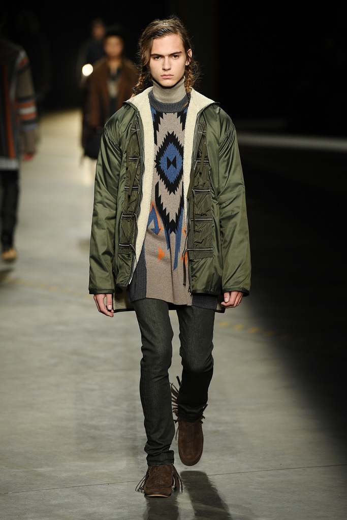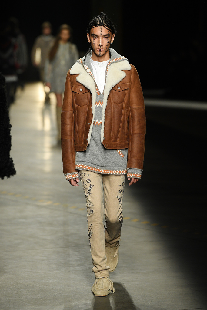 Les doublures Navajo détachables apparaissent sur les séparations, les blousons de motards en cuir sont ornés de franges, les nouveaux styles de vêtements mixent la silhouette d’un bombardier urbain avec des pulls mexicains et péruviens Baja sont coupés en silhouettes boxy ressemblant à une tunique.