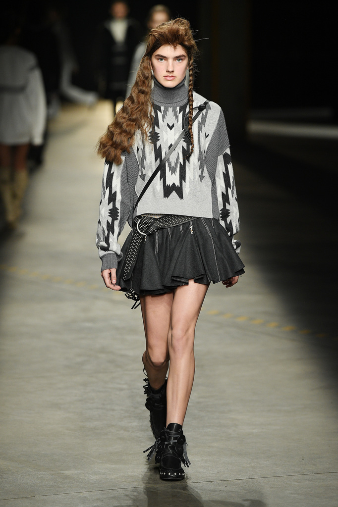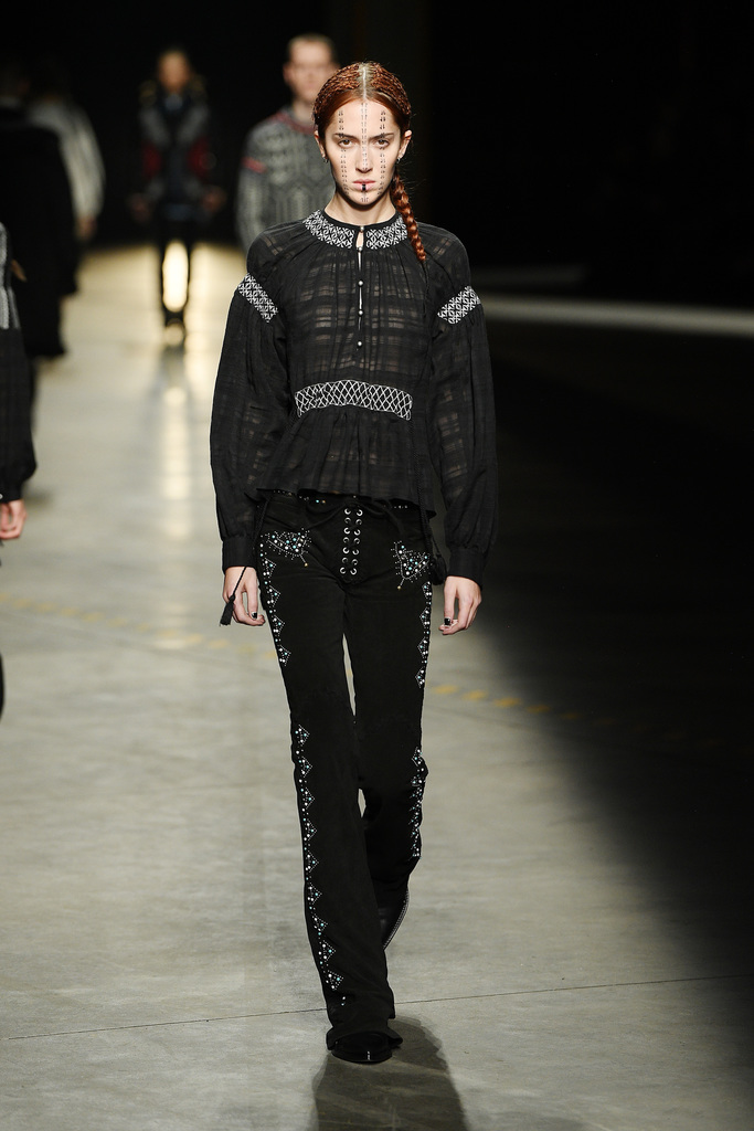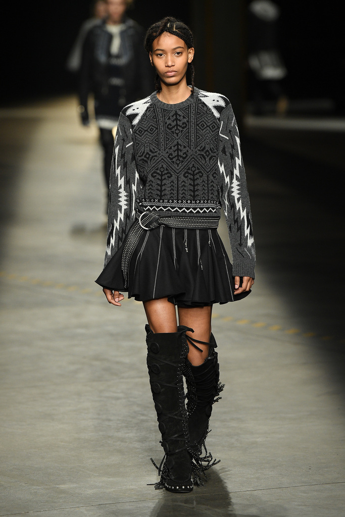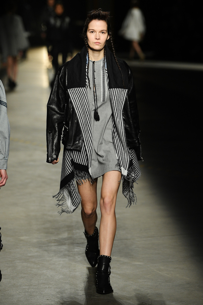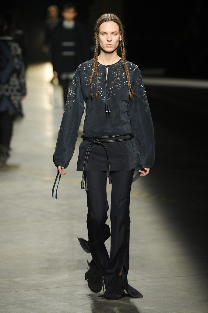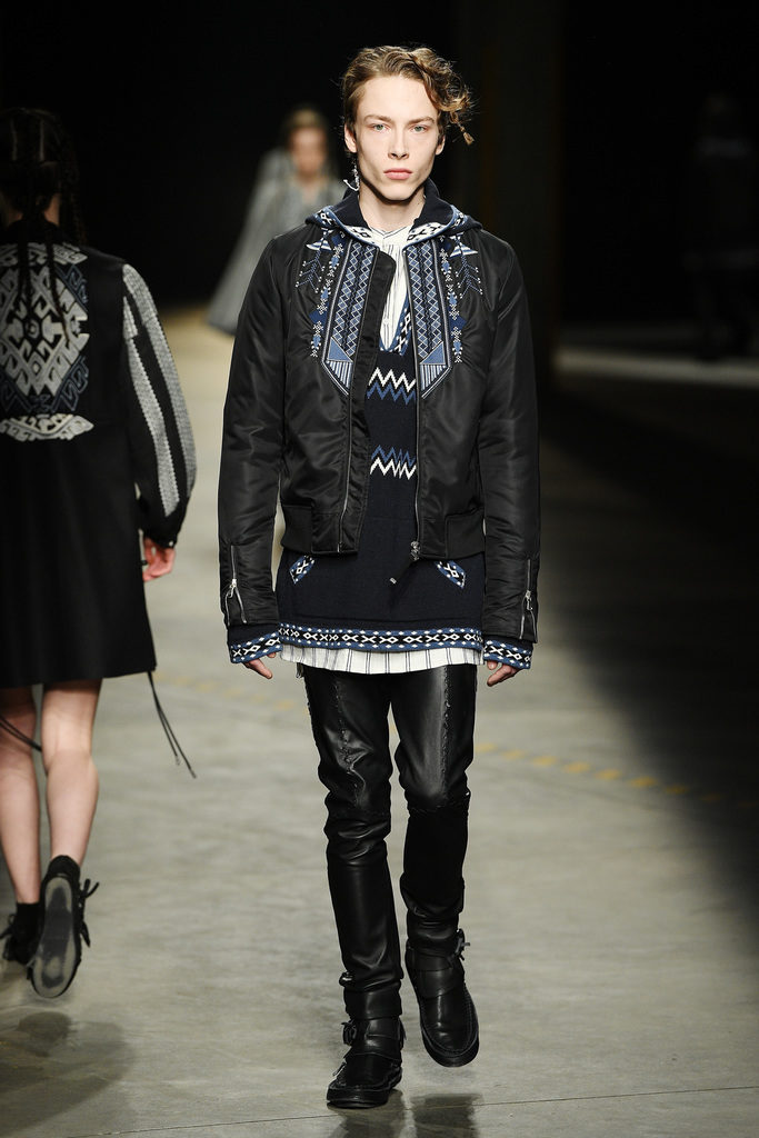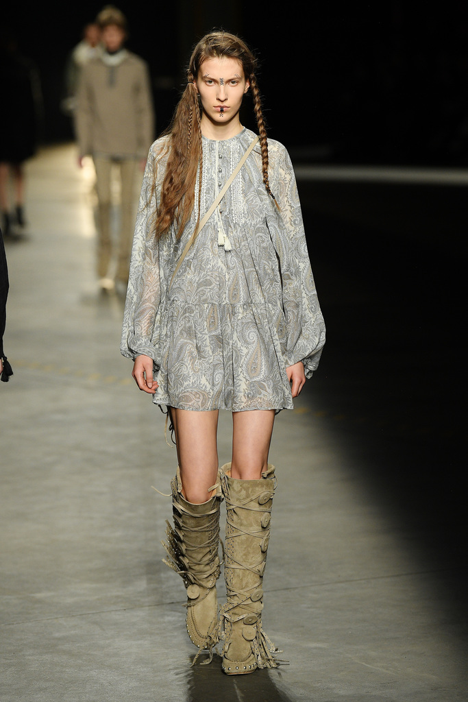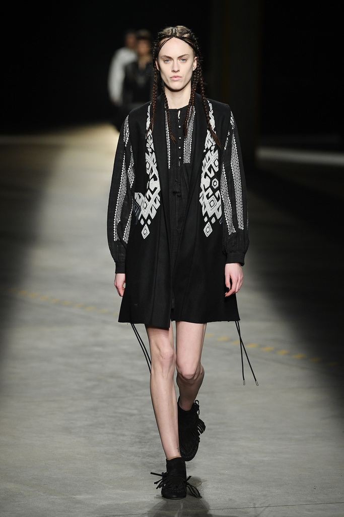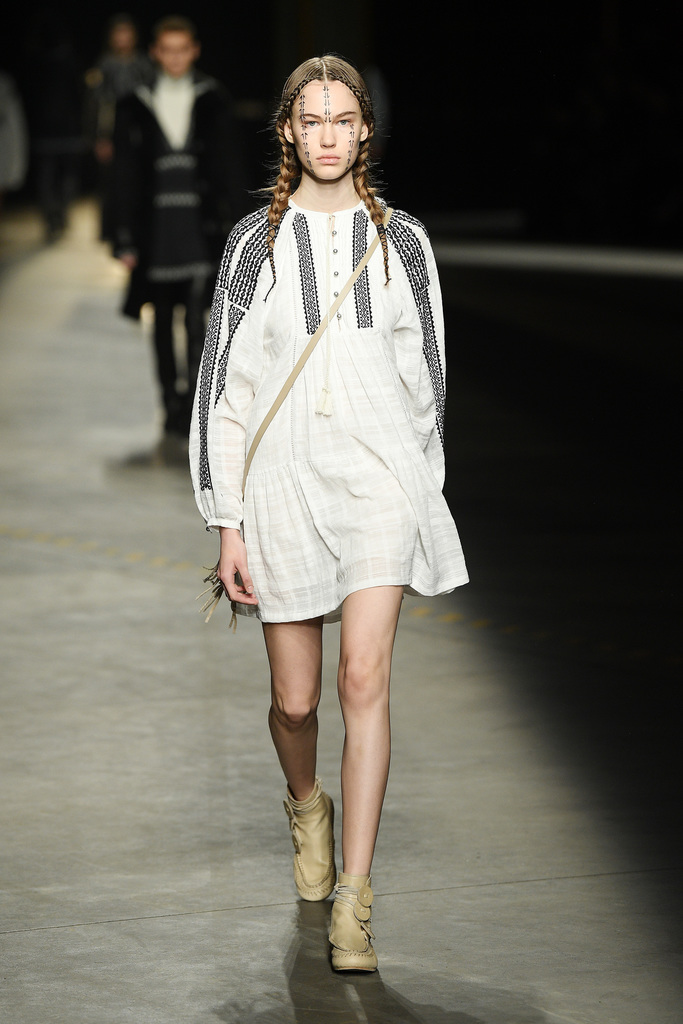 Les doublures Navajo détachables apparaissent sur les séparations, les blousons de motards en cuir sont ornés de franges, les nouveaux styles de vêtements mixent la silhouette d’un bombardier urbain avec des pulls mexicains et péruviens Baja sont coupés en silhouettes boxy ressemblant à une tunique.