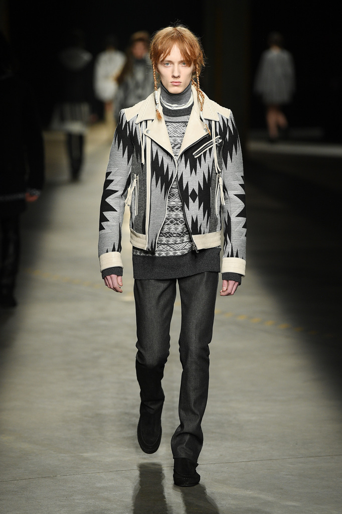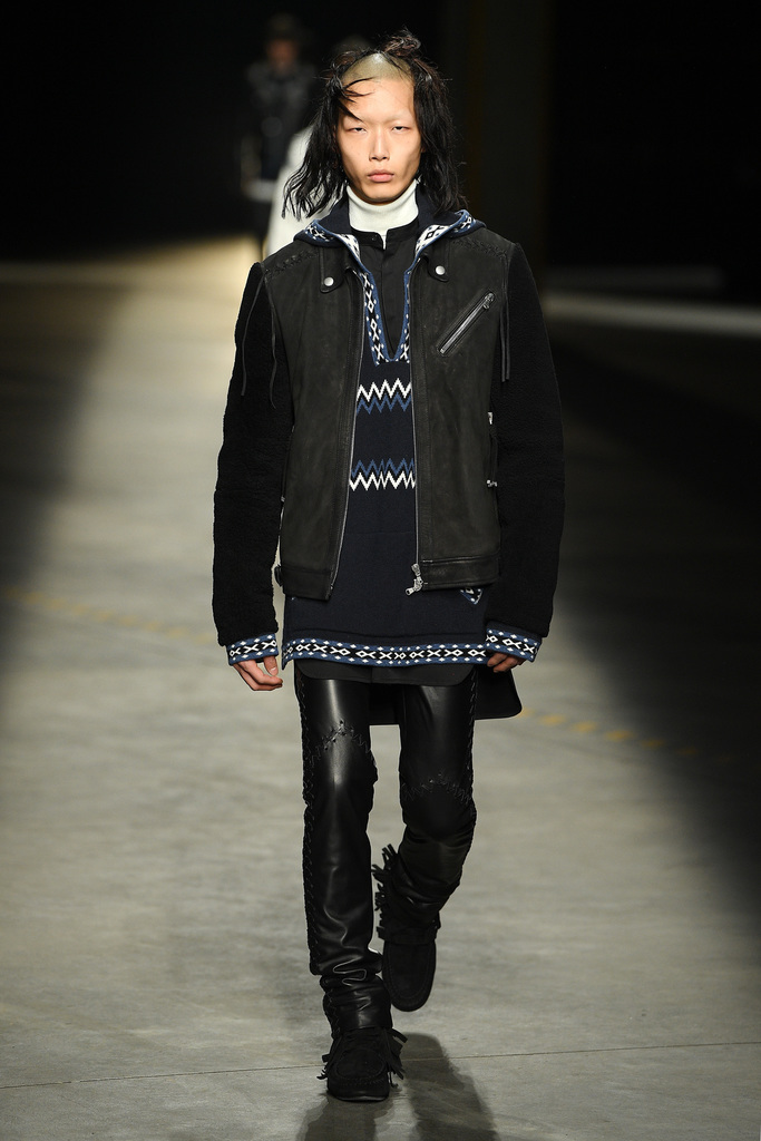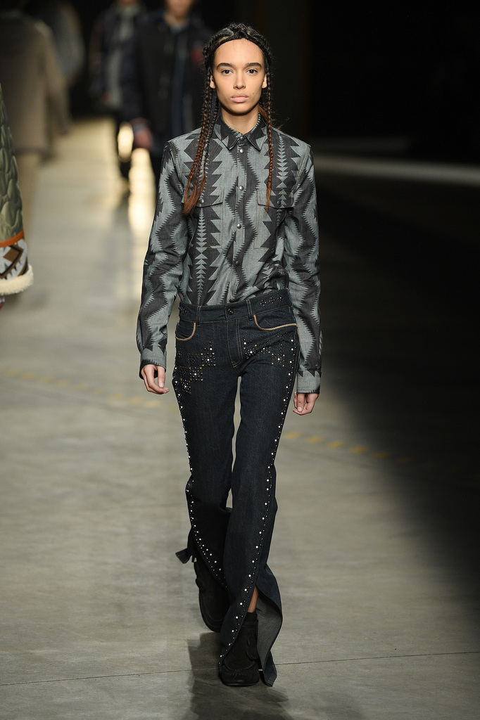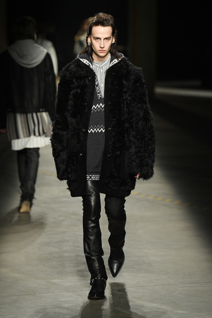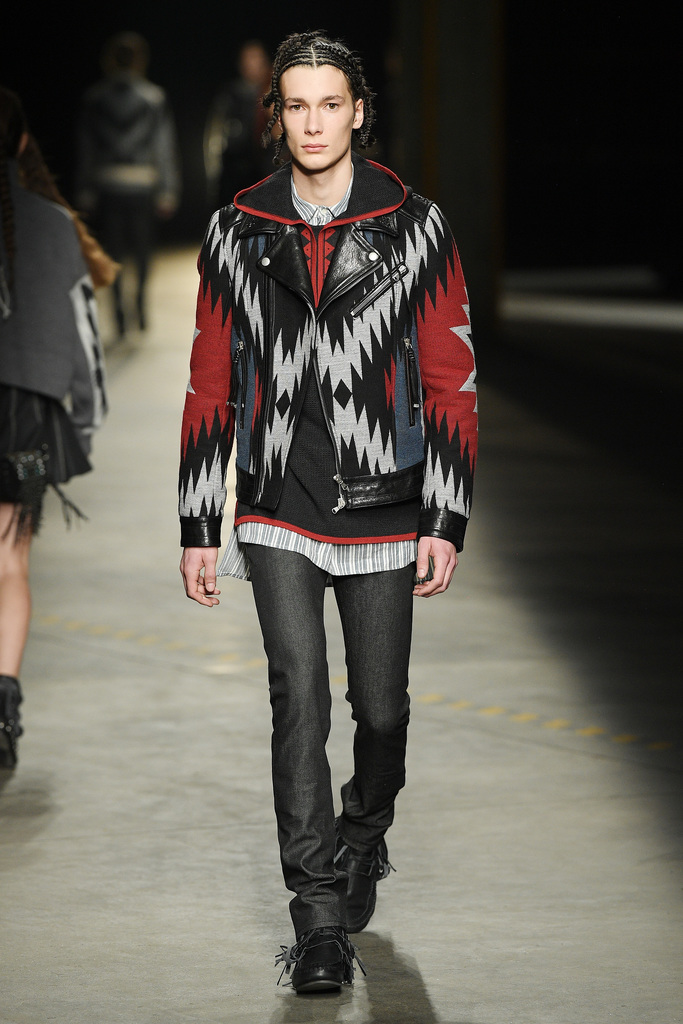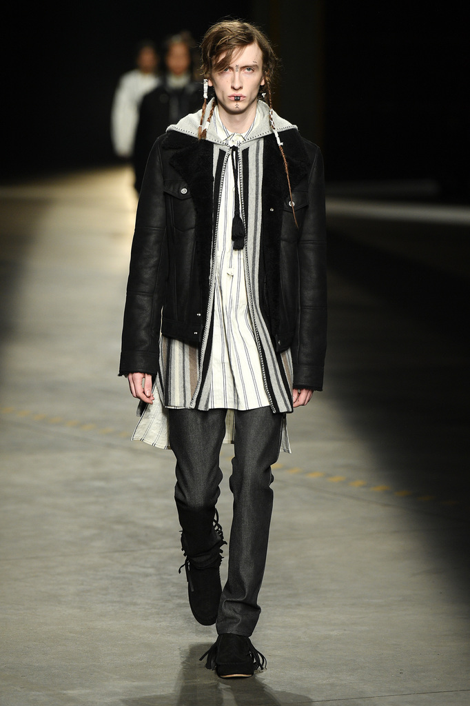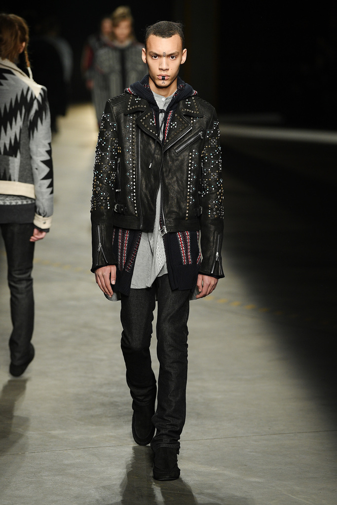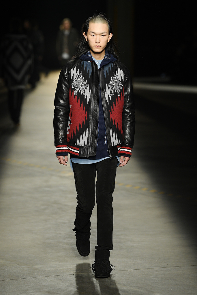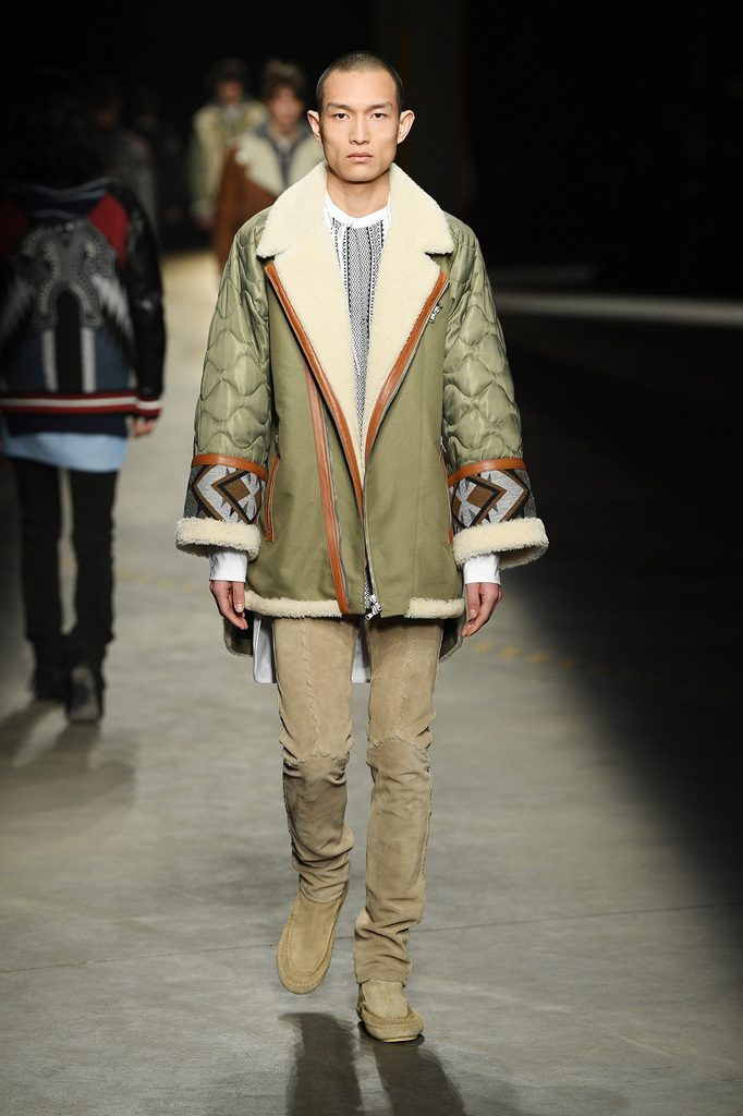 Les agrafes emblématiques de la marque, telles que les vestes en cuir, les bombardiers, les blousons militaires et les pantalons en denim, sont ornées de motifs de tapis Navajo multicolores, tandis qu’un patchwork de différents shearlings définit les manteaux mongols accrocheurs.