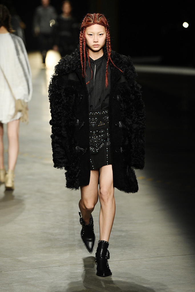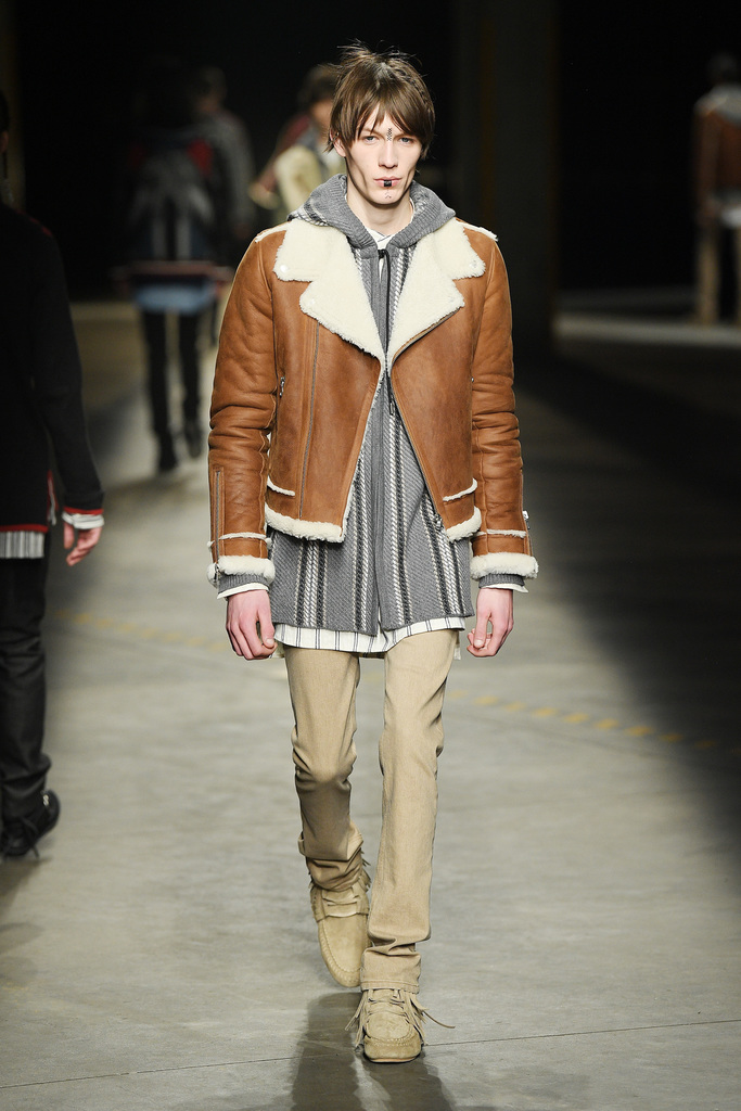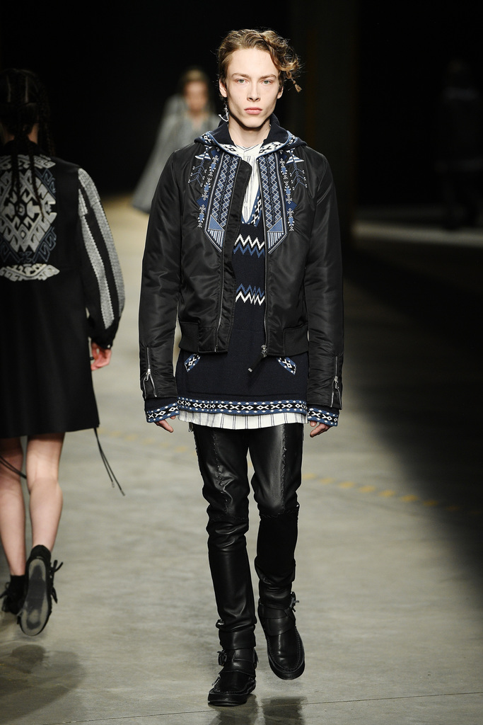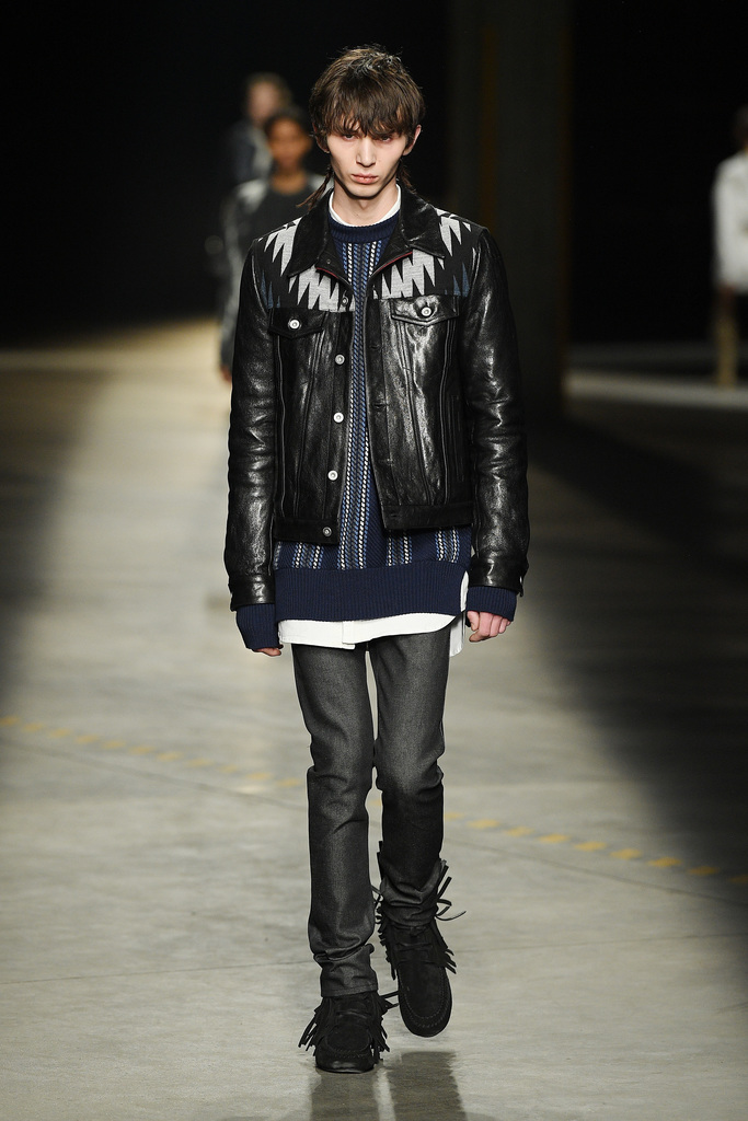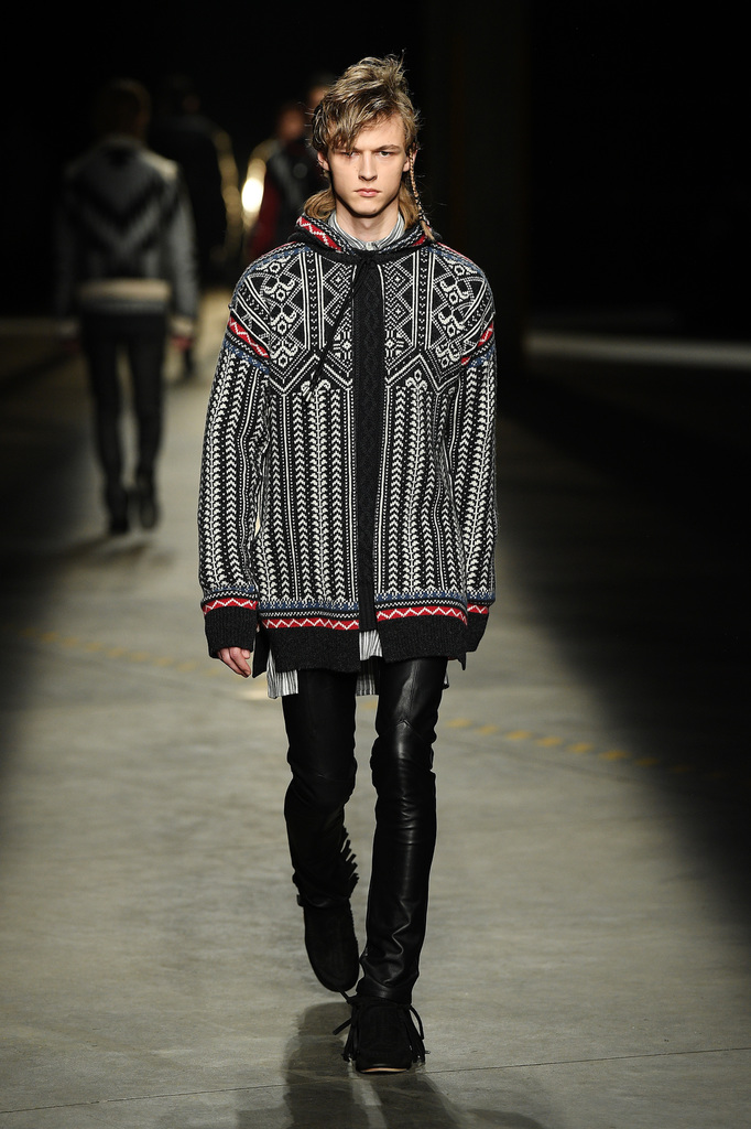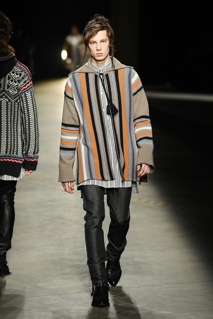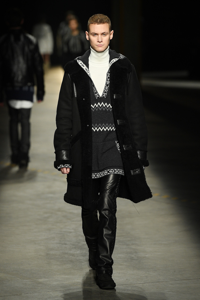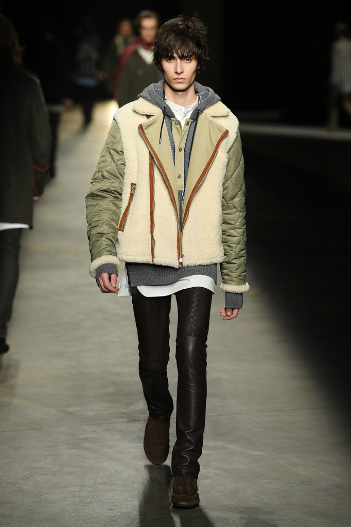 Les agrafes emblématiques de la marque, telles que les vestes en cuir, les bombardiers, les blousons militaires et les pantalons en denim, sont ornées de motifs de tapis Navajo multicolores, tandis qu’un patchwork de différents shearlings définit les manteaux mongols accrocheurs.