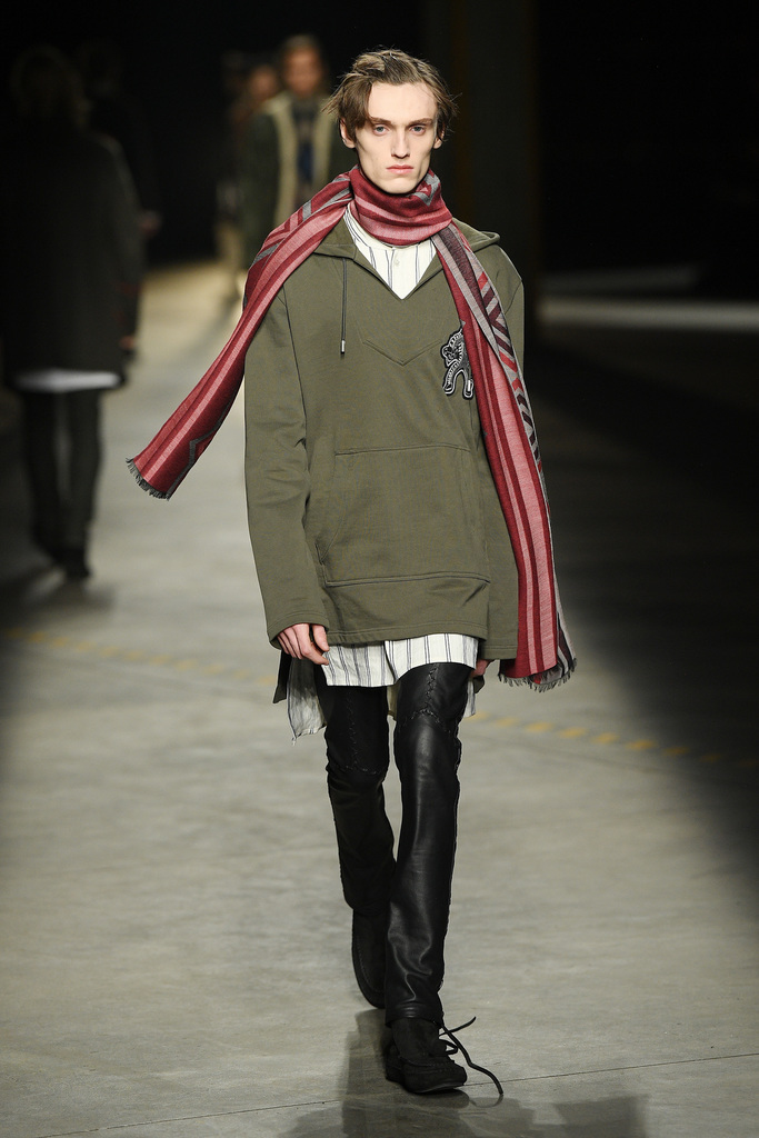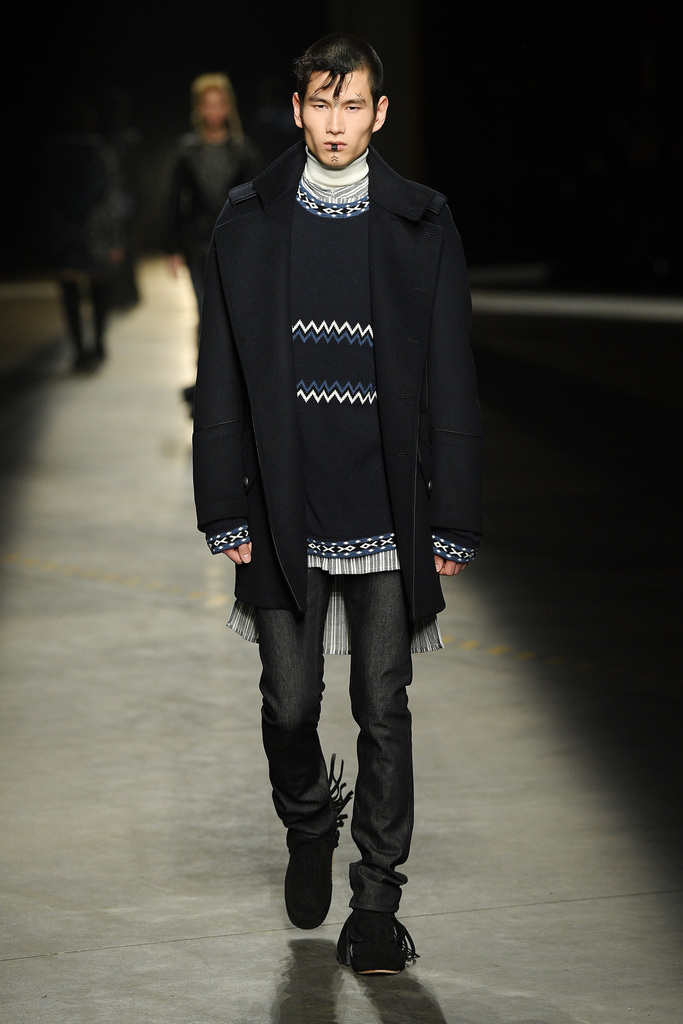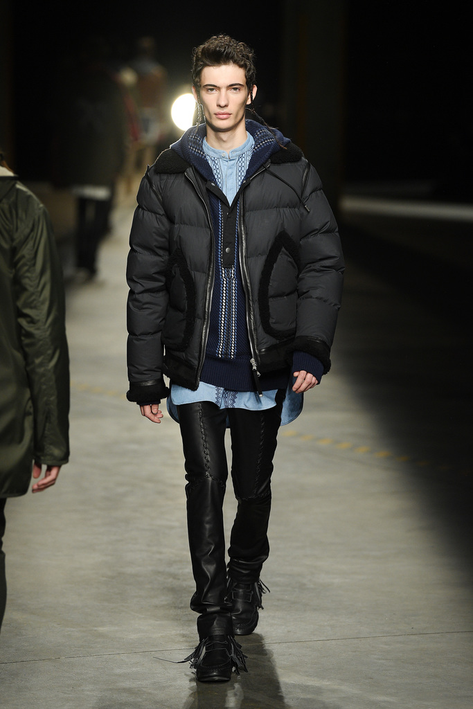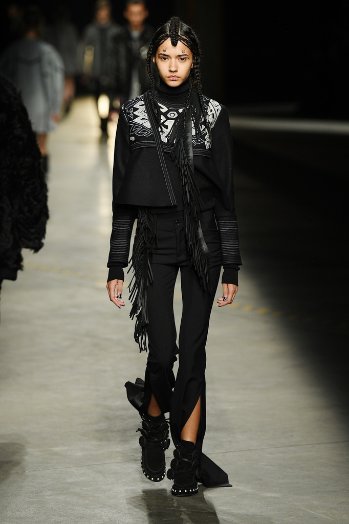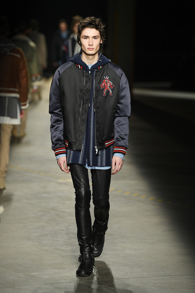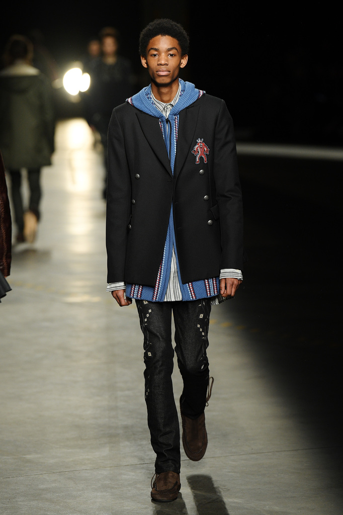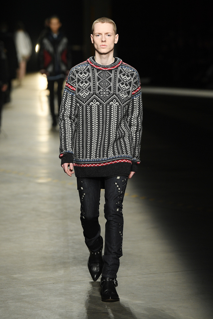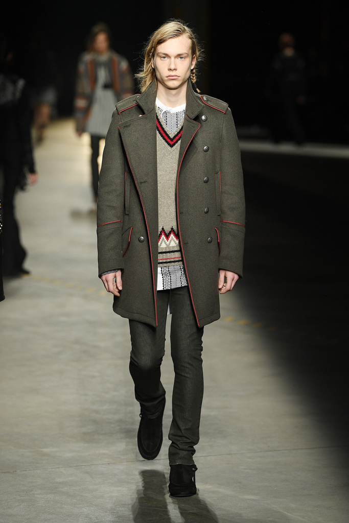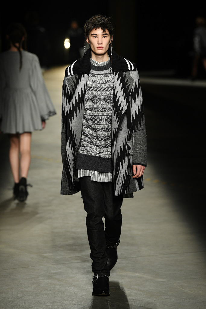 Les agrafes emblématiques de la marque, telles que les vestes en cuir, les bombardiers, les blousons militaires et les pantalons en denim, sont ornées de motifs de tapis Navajo multicolores, tandis qu’un patchwork de différents shearlings définit les manteaux mongols accrocheurs.