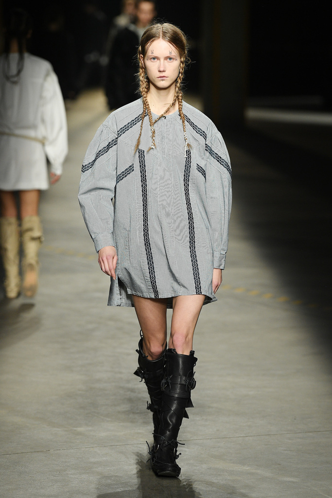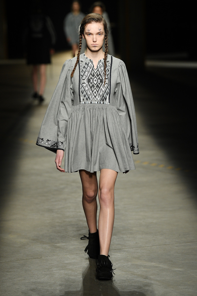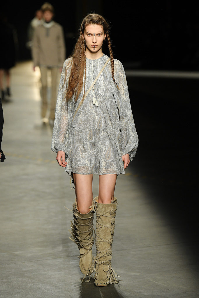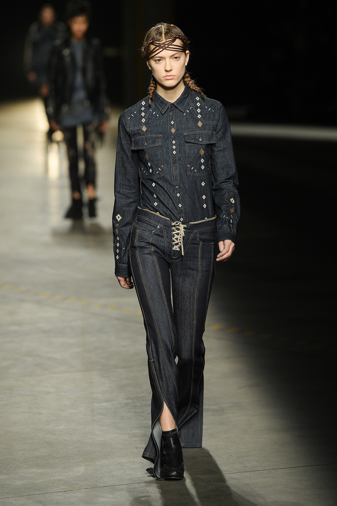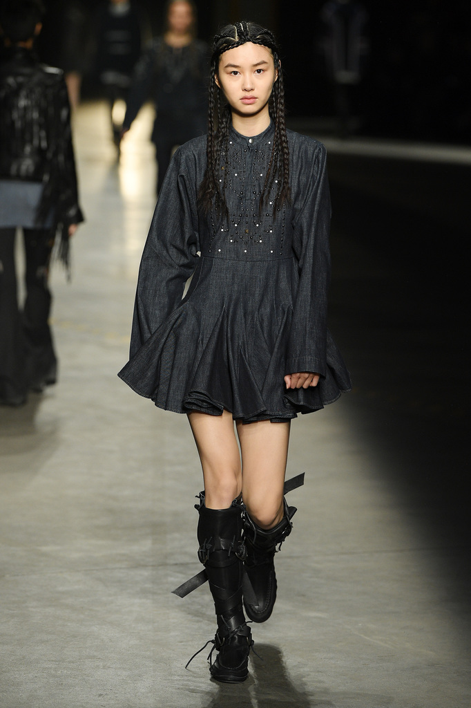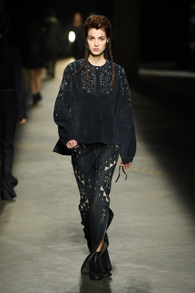 Les robes en flanelle de laine et en denim vintage délavé, avec des plastrons brodés de multiples clous, sont découpées dans des silhouettes évasées référençant les styles afghans de Nuristan, tandis que les tops en daim, cuir et denim font écho aux tuniques syriennes.