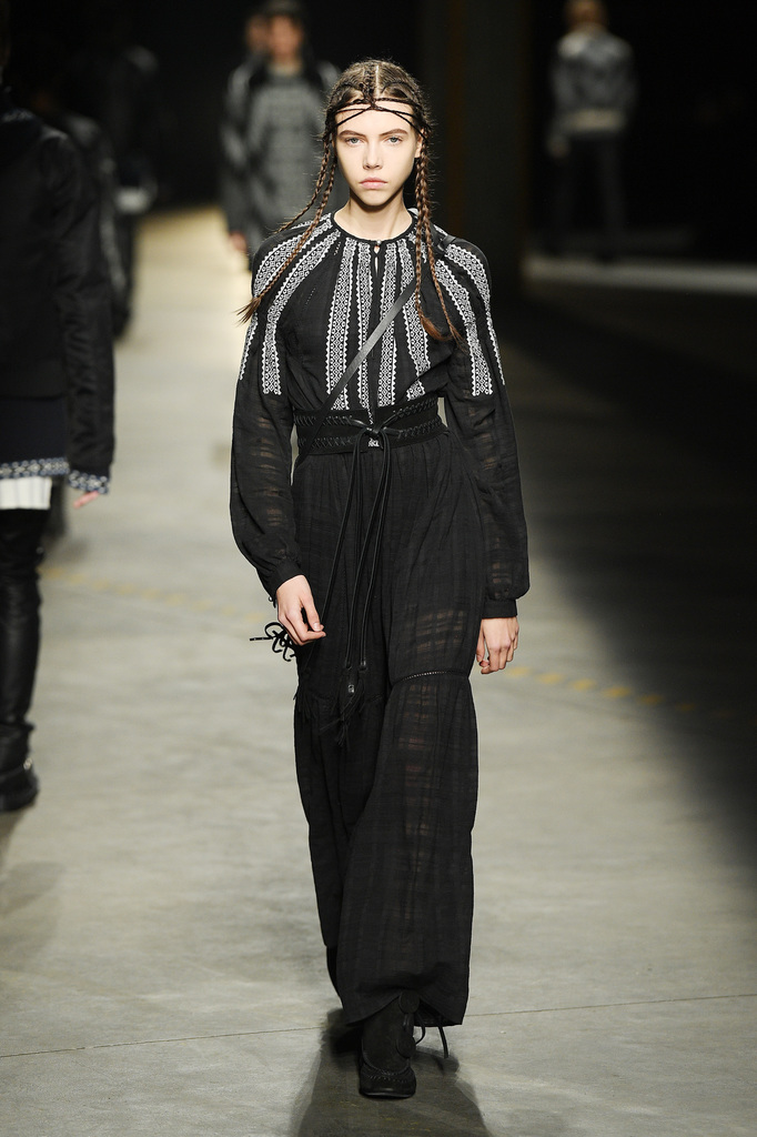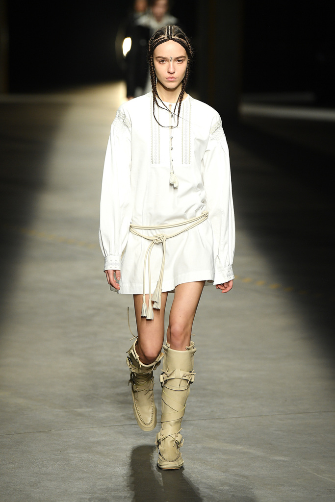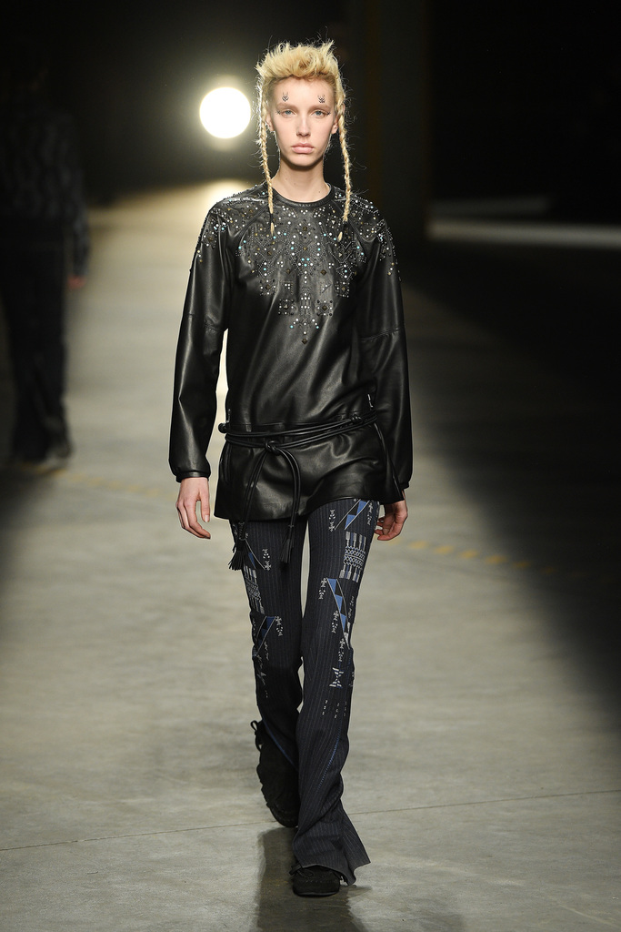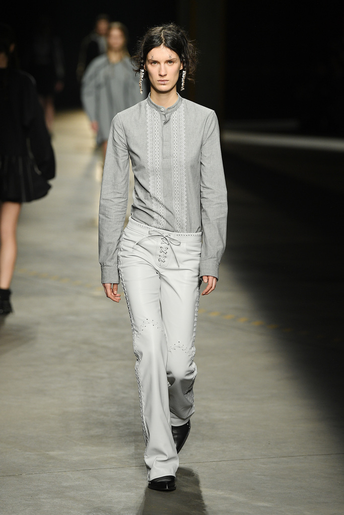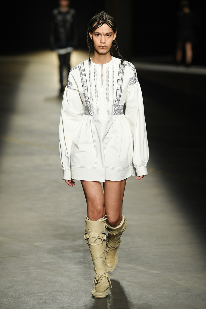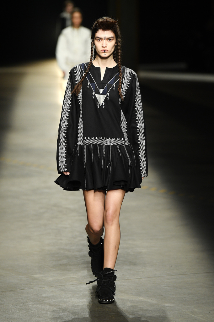 Les robes en flanelle de laine et en denim vintage délavé, avec des plastrons brodés de multiples clous, sont découpées dans des silhouettes évasées référençant les styles afghans de Nuristan, tandis que les tops en daim, cuir et denim font écho aux tuniques syriennes.